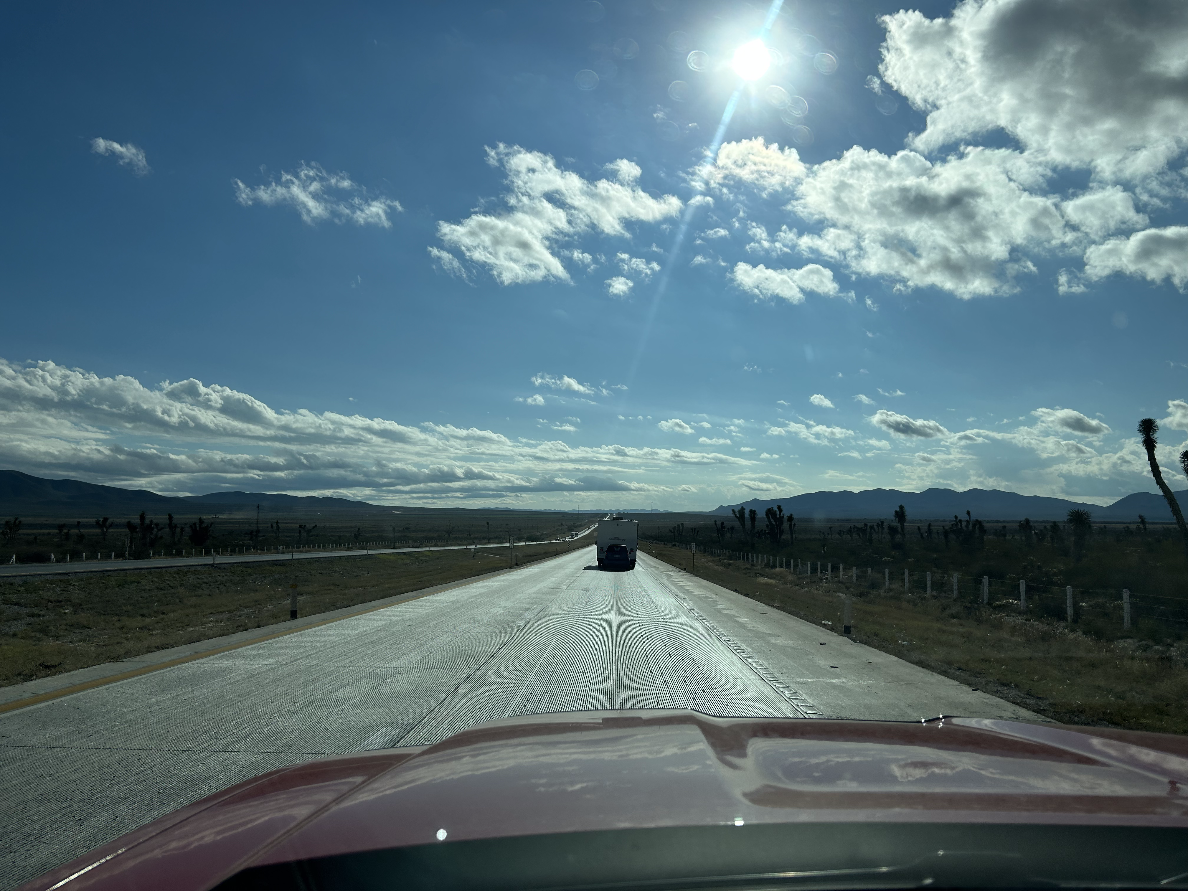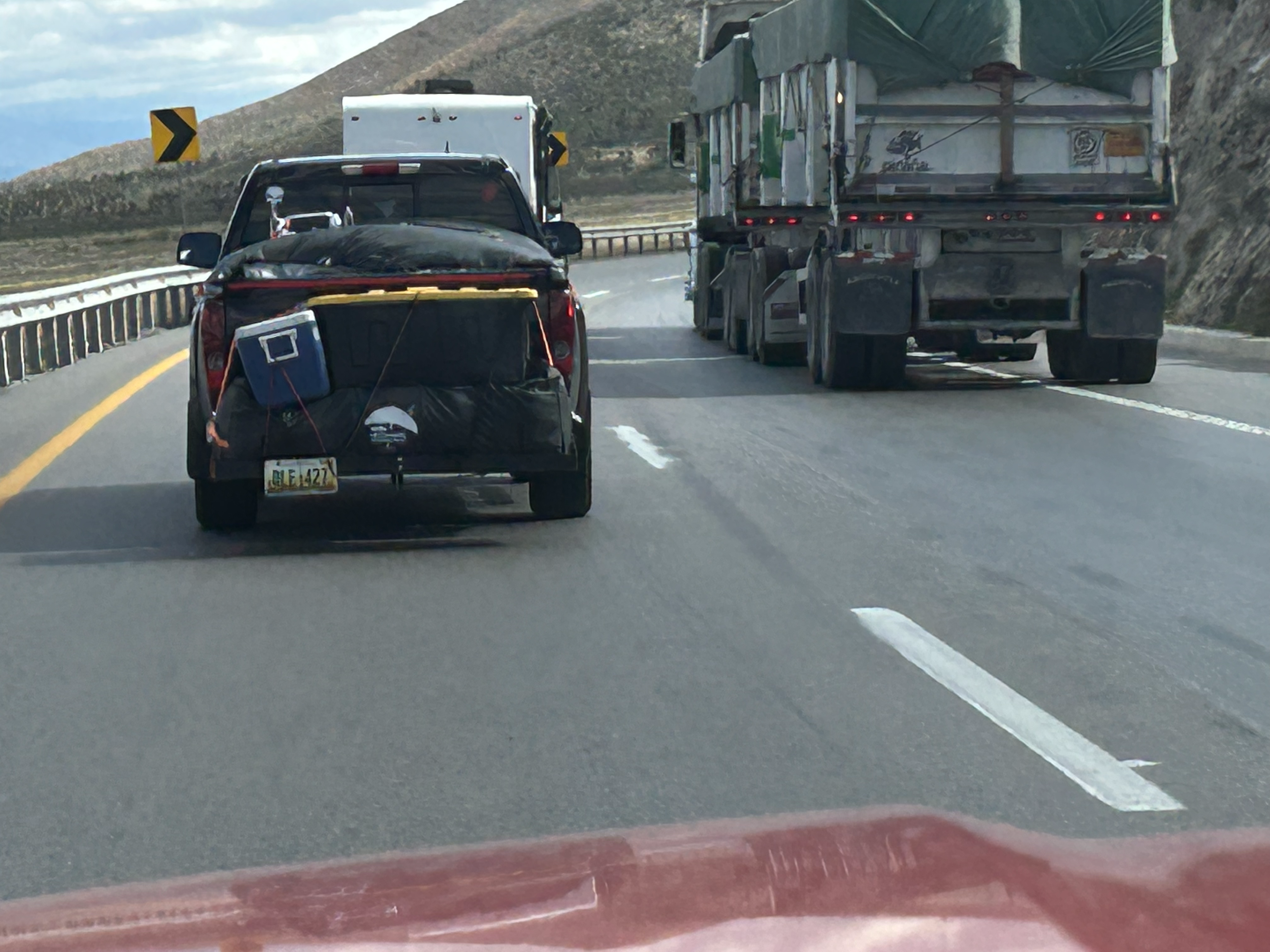 Nous nous sommes fait un ami sans nous en rendre compte; le camion rouge immatriculée aux États-Unis avec une glacière à l’arrière. Un homme a décidé de nous suivre pendant une bonne partie de la route. Lors d’une pause, on a appris qu’il aimait le fait que nous soyons canadiens. Nous ne l’avons plus revu après cette halte où il a compris que nous n’étions pas aussi intéressés que lui. ![]()
