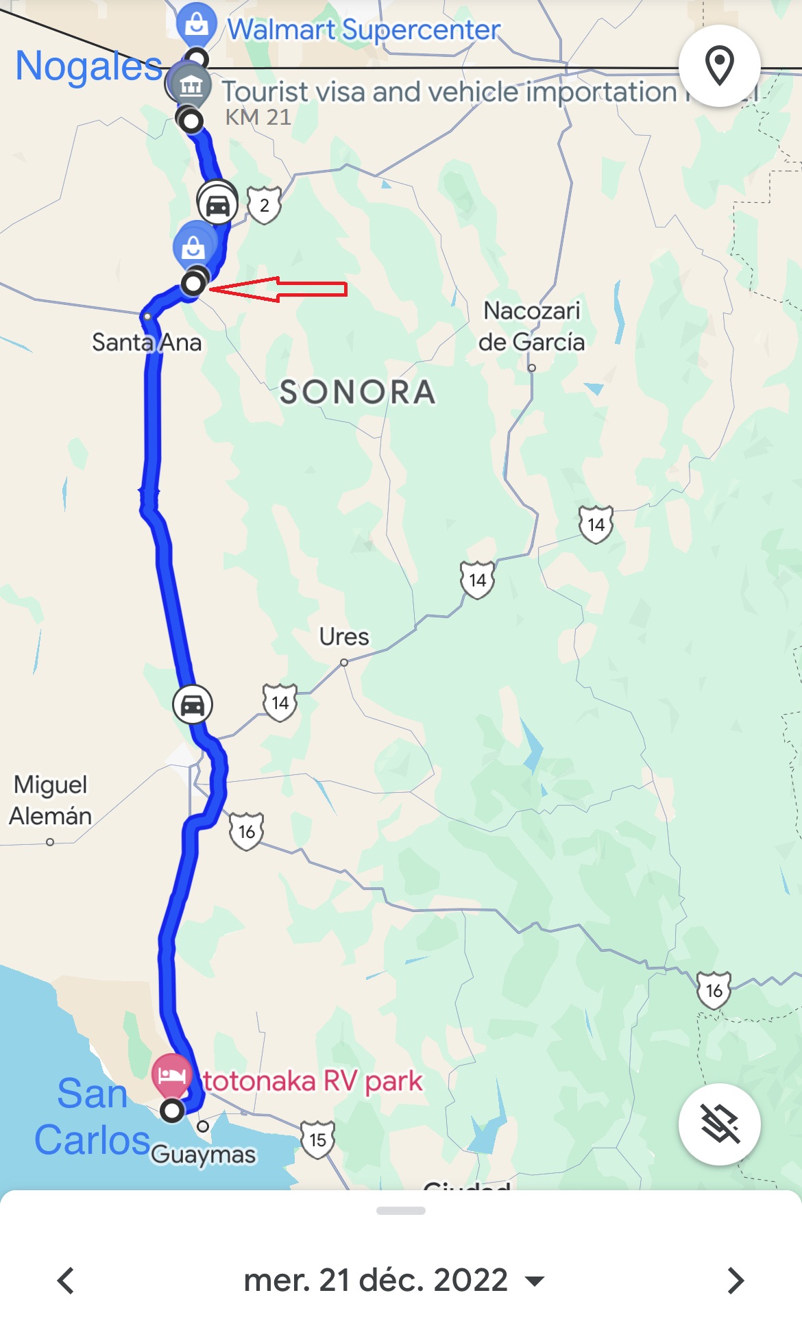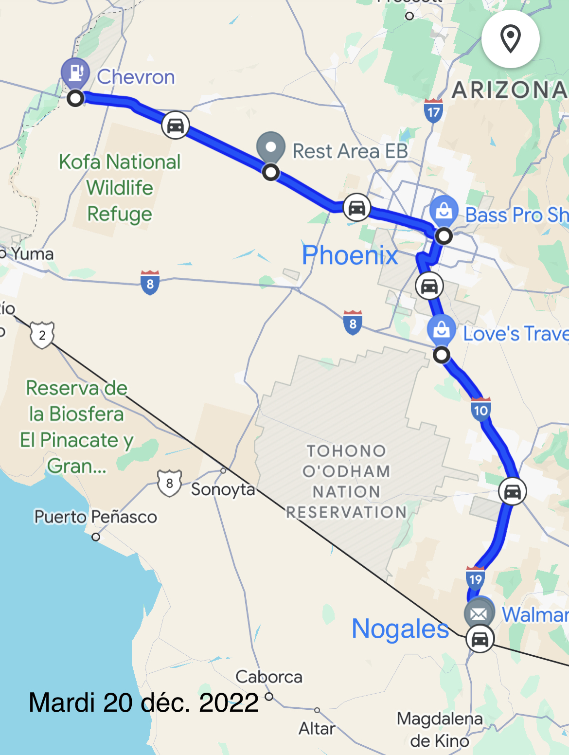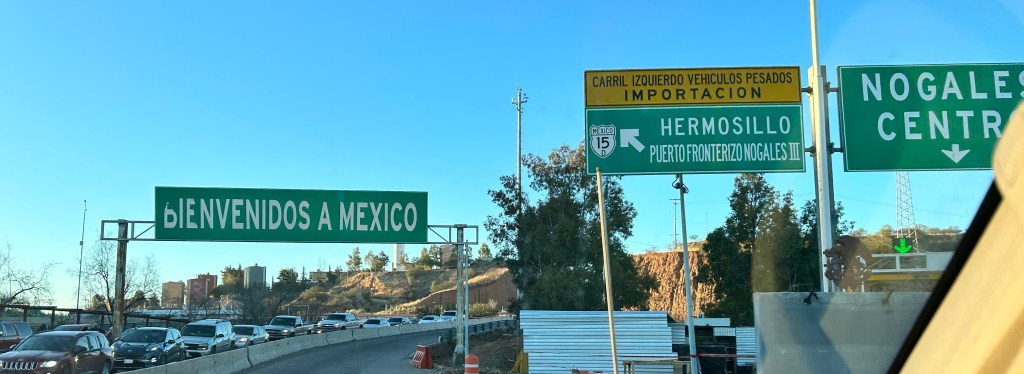 Nous roulions depuis 55 minutes quand j’ai eu le courage de dire à mon ex-ami de rebrousser chemin. Nous devions retourner à Nogales pour aller chercher son visa et son permis d’importation temporaire de véhicule. Par chance, les procédures se sont déroulées rondement et nous avons pu repartir après environ 30 minutes.