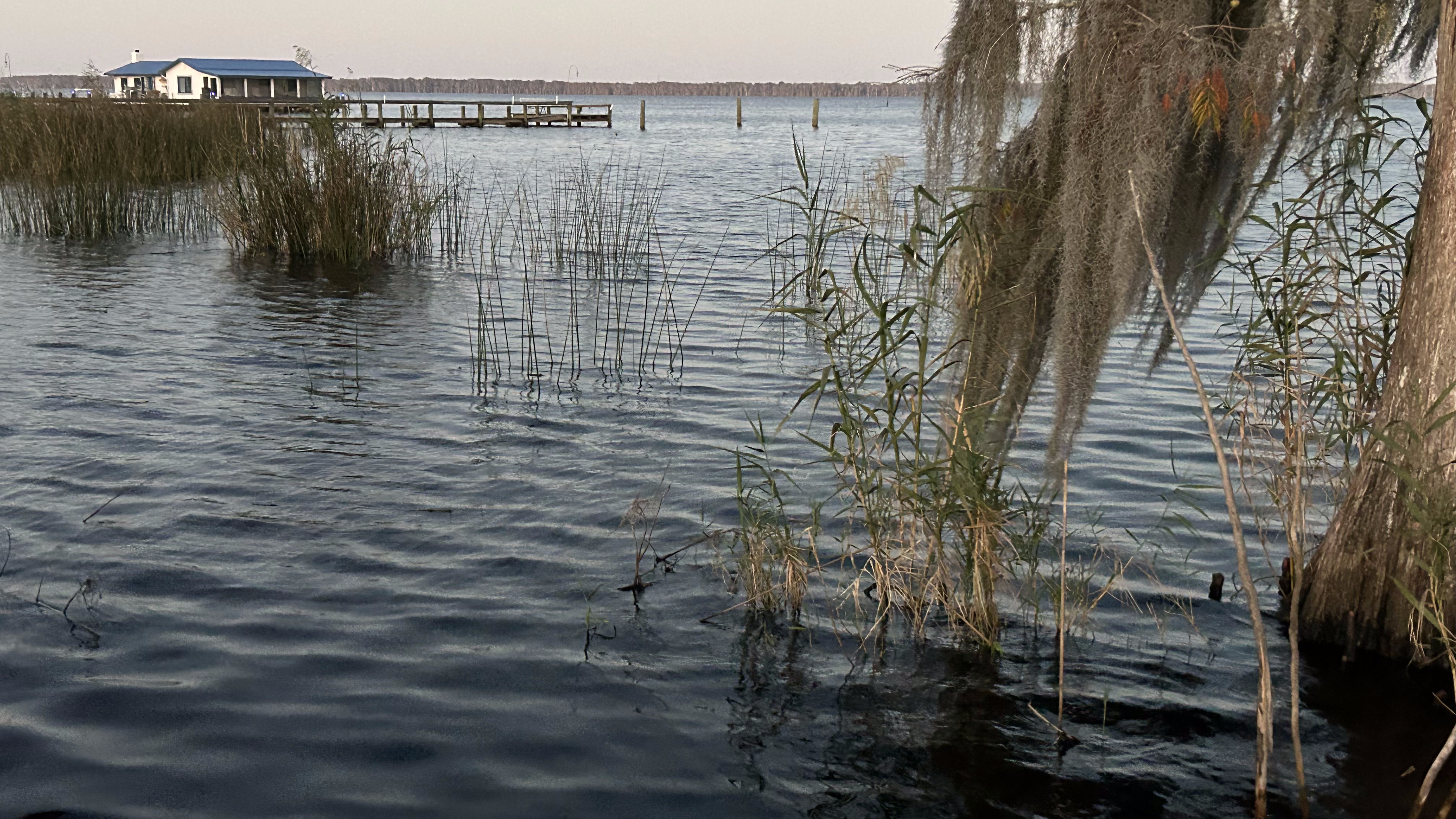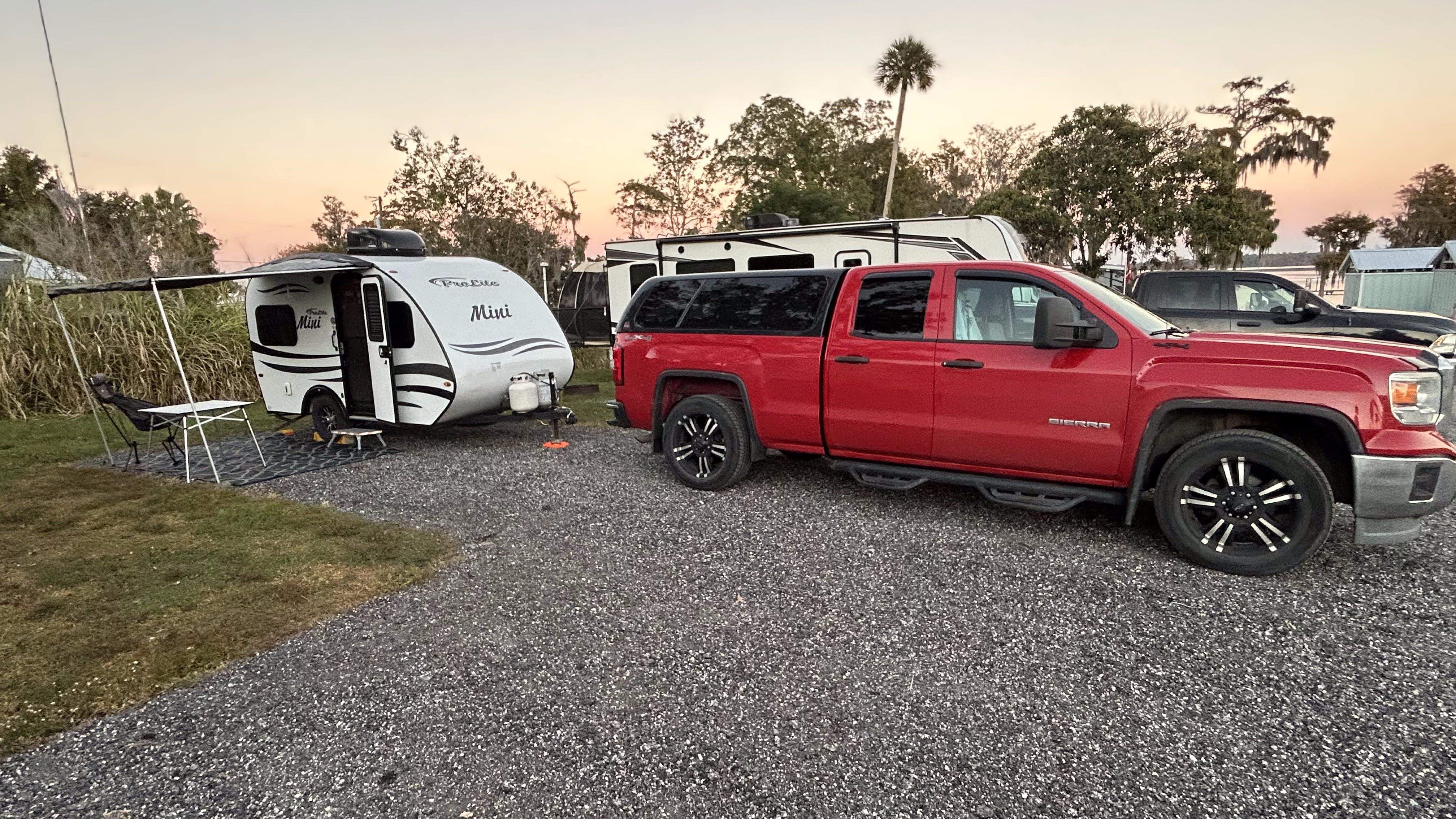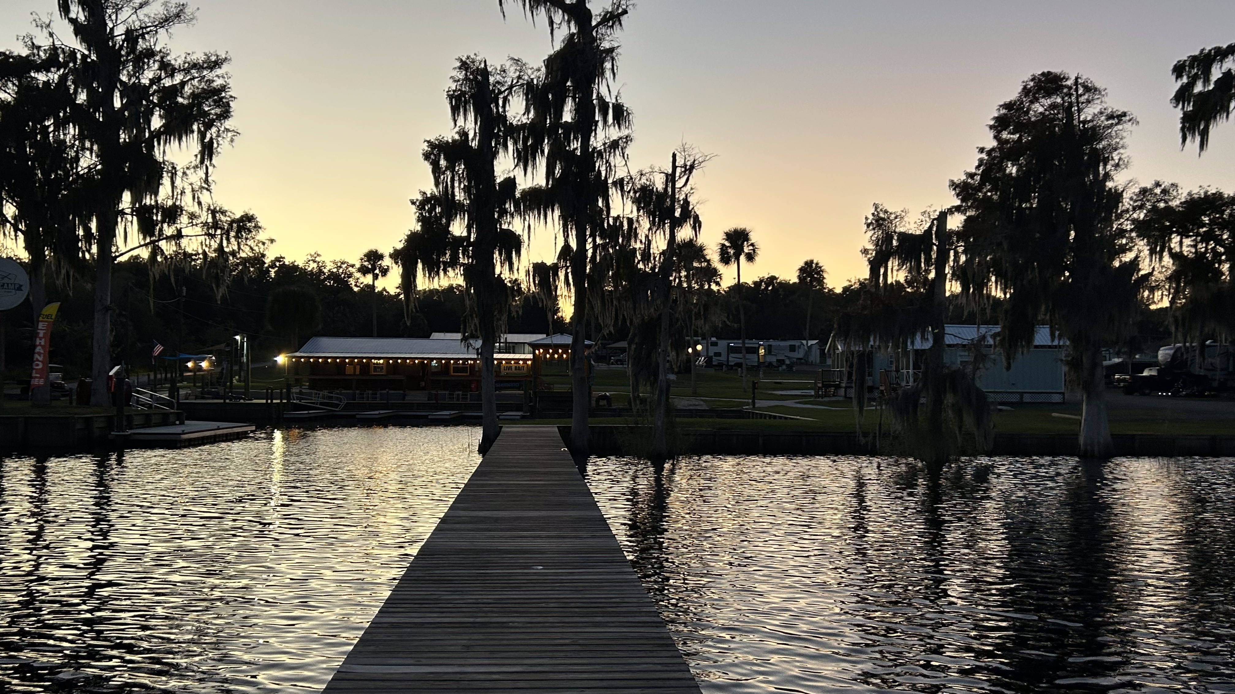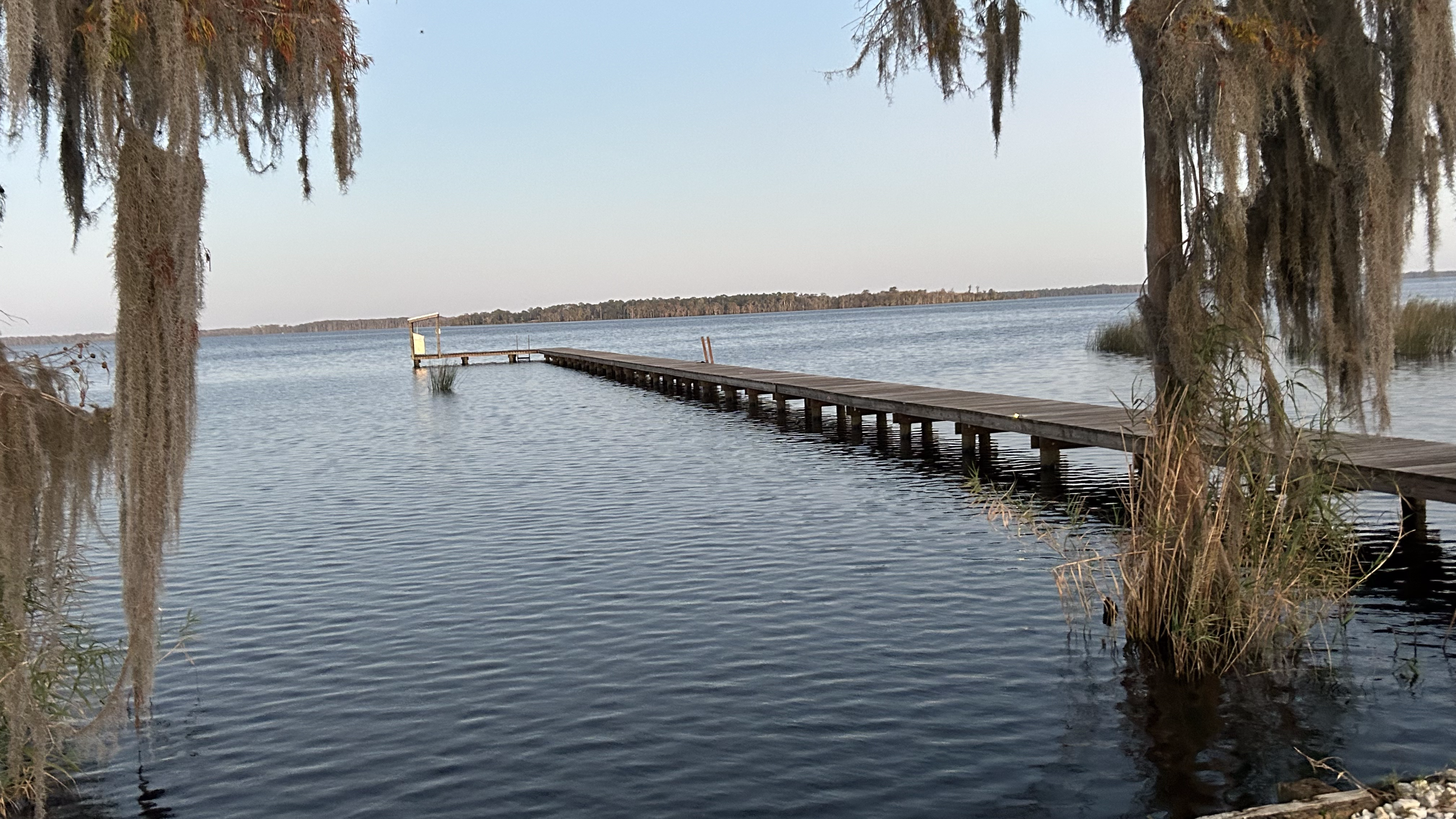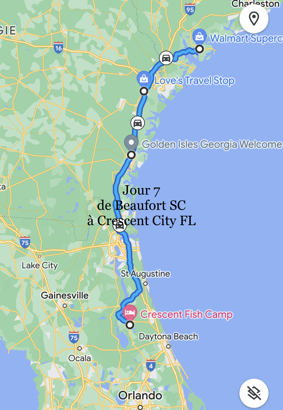 Le 7 novembre 2023, nous sommes partis du Walmart du Beaufort, en Caroline du Sud, pour nous rendre au Crescent fish camp, à Crescent City, en Floride où nous passerons deux nuits. Notre camping était dans un lieu enchanteur. Il est tout petit et il est sur les terrains d’une marina de Crescent Lake. Il possède une piscine. La douche et la toilette sont dans la même pièce, très propre et grande. Notre terrain était en pente. J’ai dû emprunter des blocs à Réjean, car les miens ne suffisaient pas à relever le côté le plus bas, afin de mettre ma roulotte au niveau. 😉