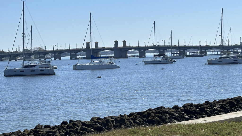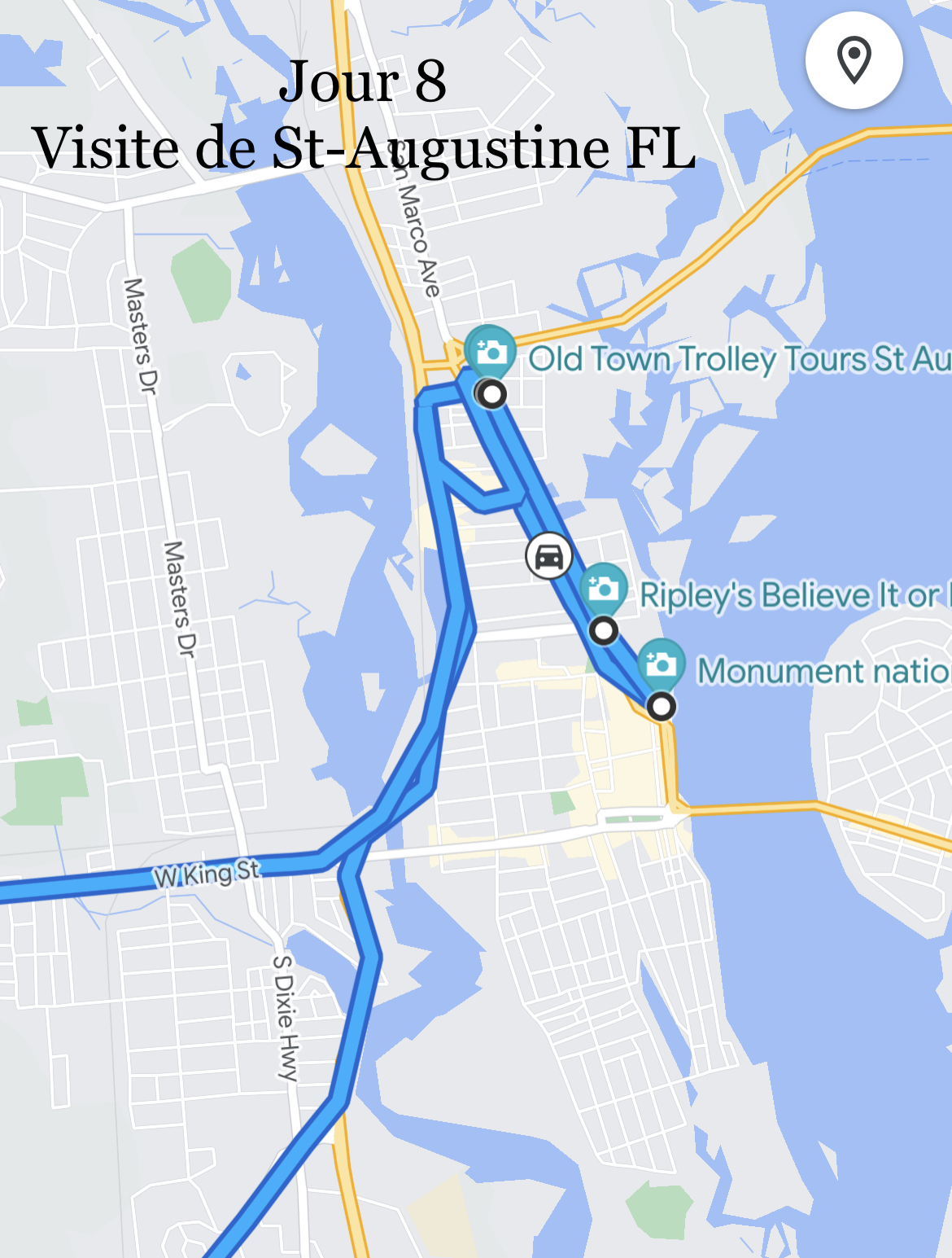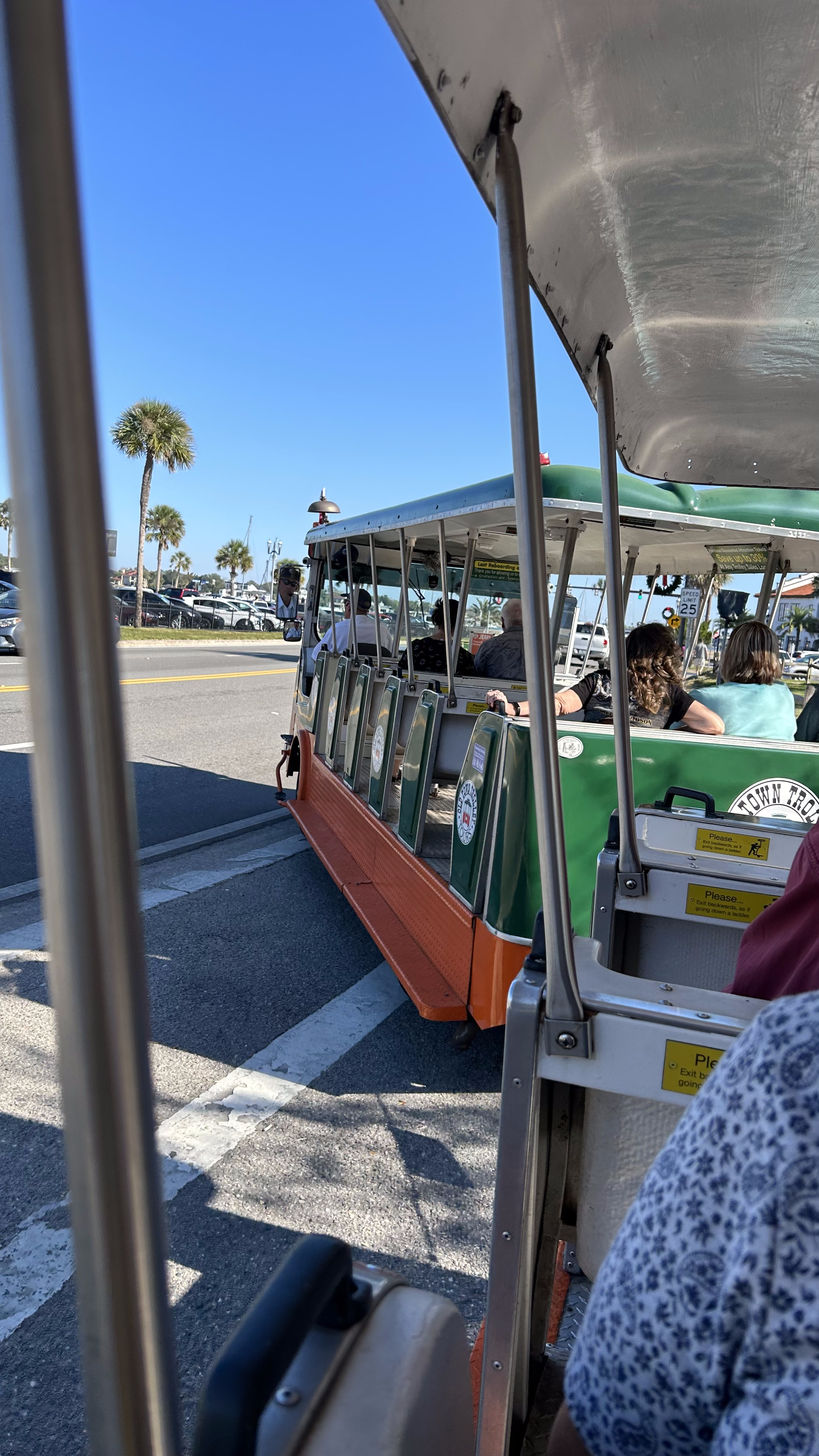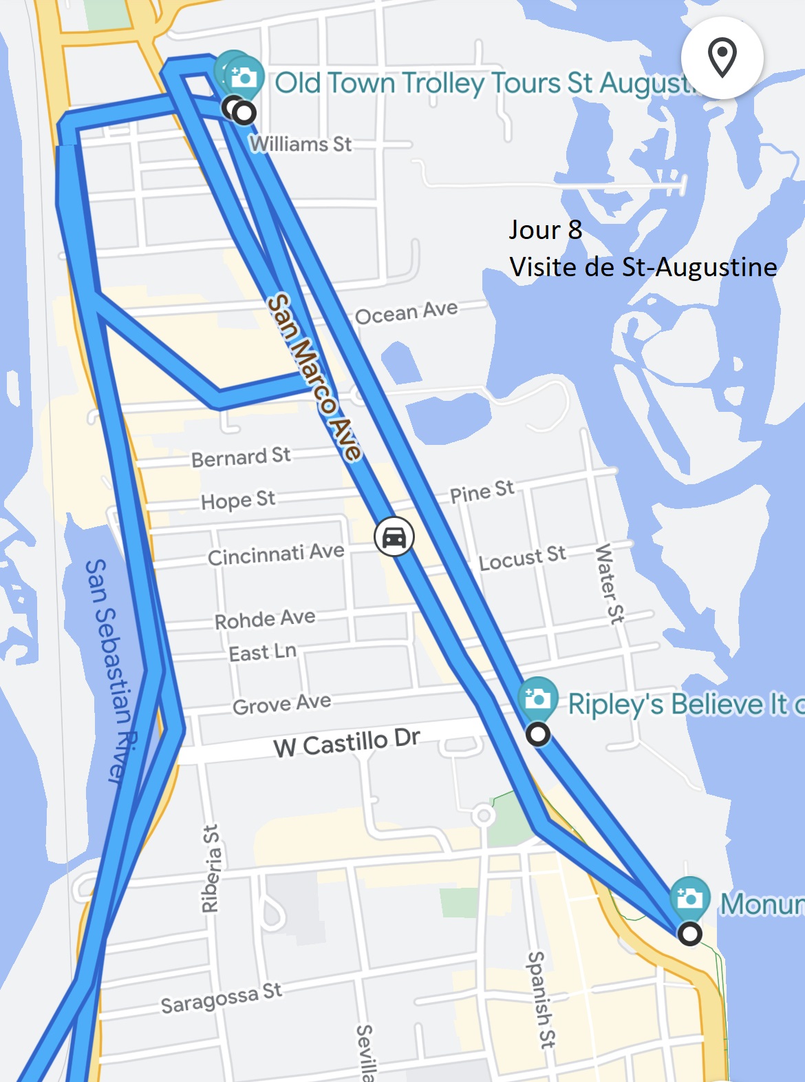 Nous nous sommes allés visiter la ville de St-Augustine. Nous avions planifié cette visite, à la suite de la suggestion de nos amies, France et Marie. Cette ville serait la plus ancienne ville des États-Unis et le lieu d’accostage du premier explorateur européen, Juan Ponce de León. Nous avons débuté par un tour de ville à bord du Old Town Trolley Tours, pour avoir une idée générale de la ville.