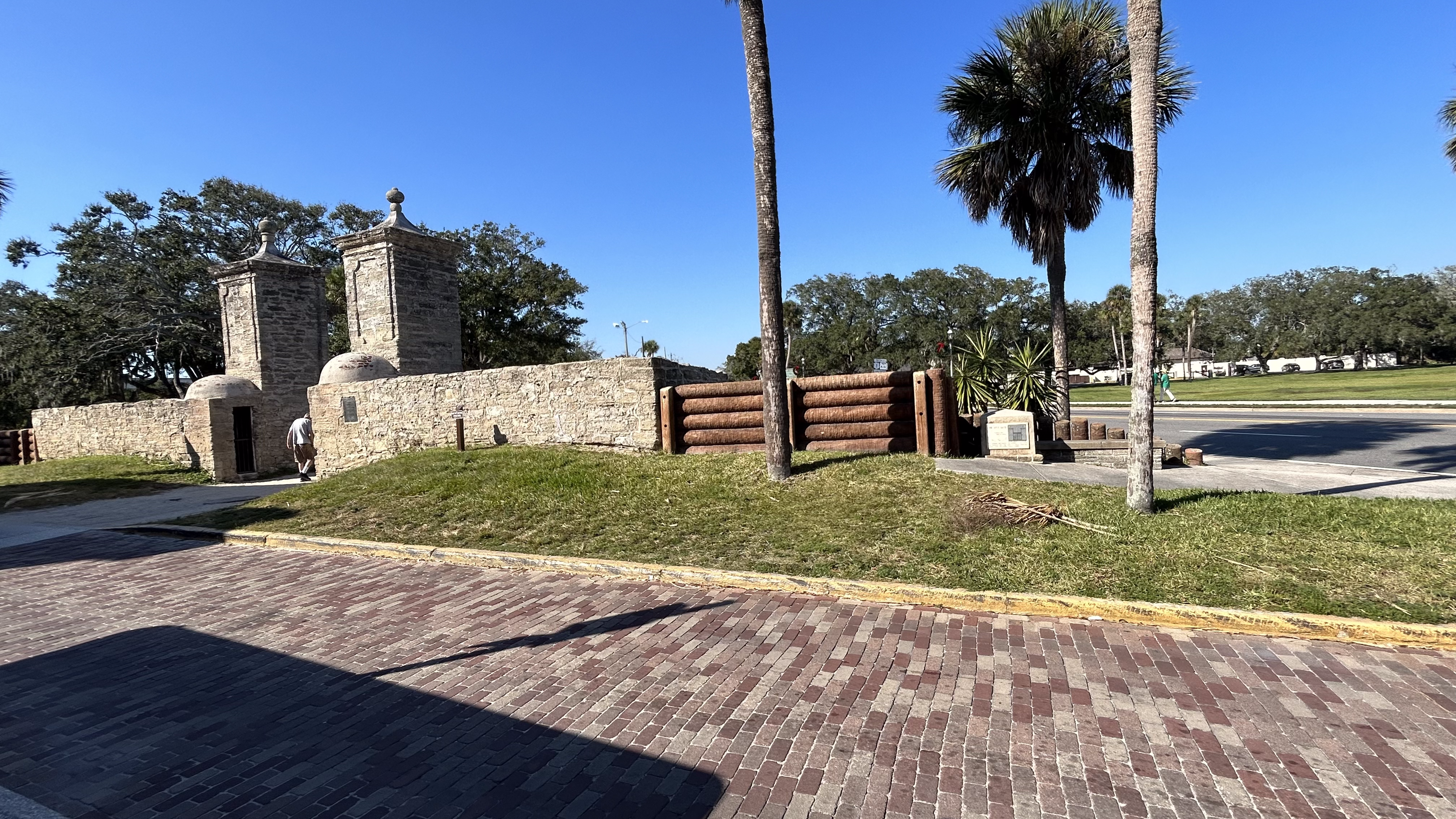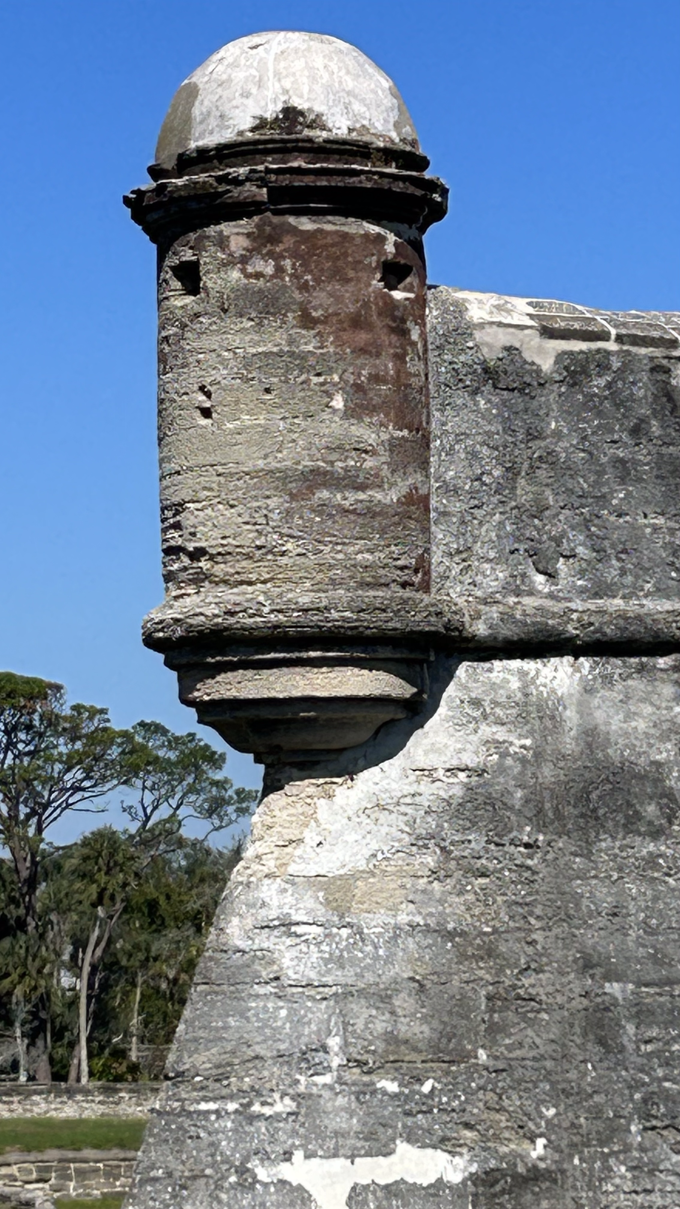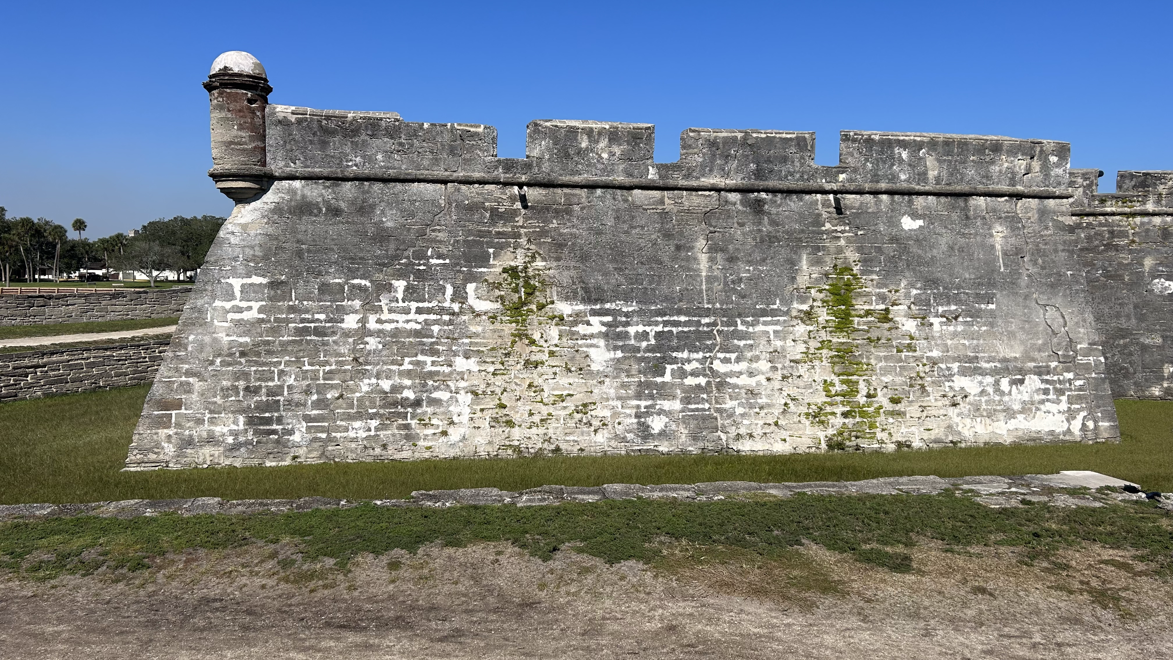 Je voulais aller voir de plus près la forteresse espagnole, Castillo de San Marcos. C’est donc ce que nous avons fait. Cette forteresse faite en coquina a été édifiée au XVIIe siècle. Elle porte encore les stigmates des combats du passé, mais elle est toujours intacte. Le coquina est un calcaire local poreux. Il a été fabriqué à partir de millions de coquillages pressés ensemble pendant des milliers d’années d’où la solidité de la structure.