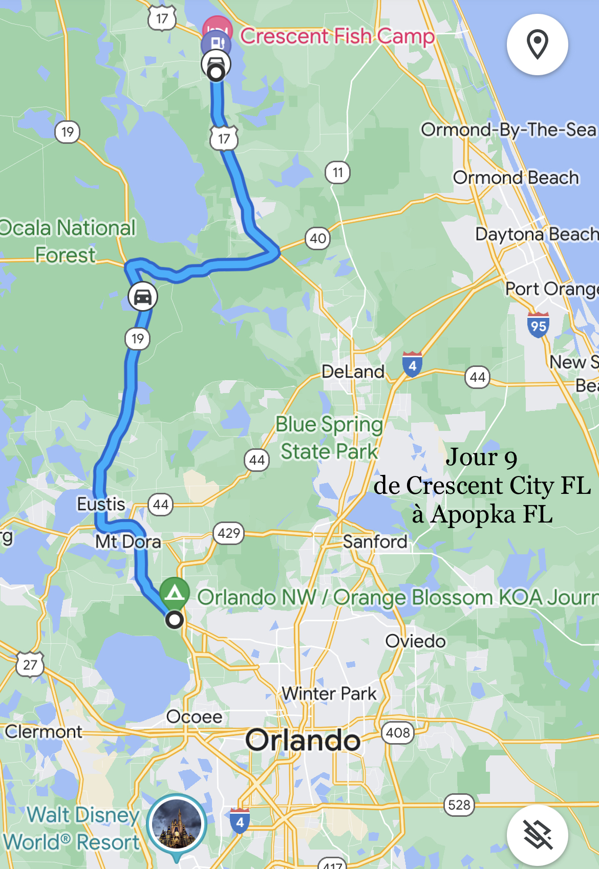 Le 9 novembre 2023, nous sommes partis de Crescent city pour nous rendre à Apopka. Nous avons séjourné deux nuits, dans le camping Orange Blossom KOA Journey. Partis à 11 h 00 et arrivés à 13 h 20, nous avons eu le temps de faire notre lavage et de se reposer. Ça a fait du bien !