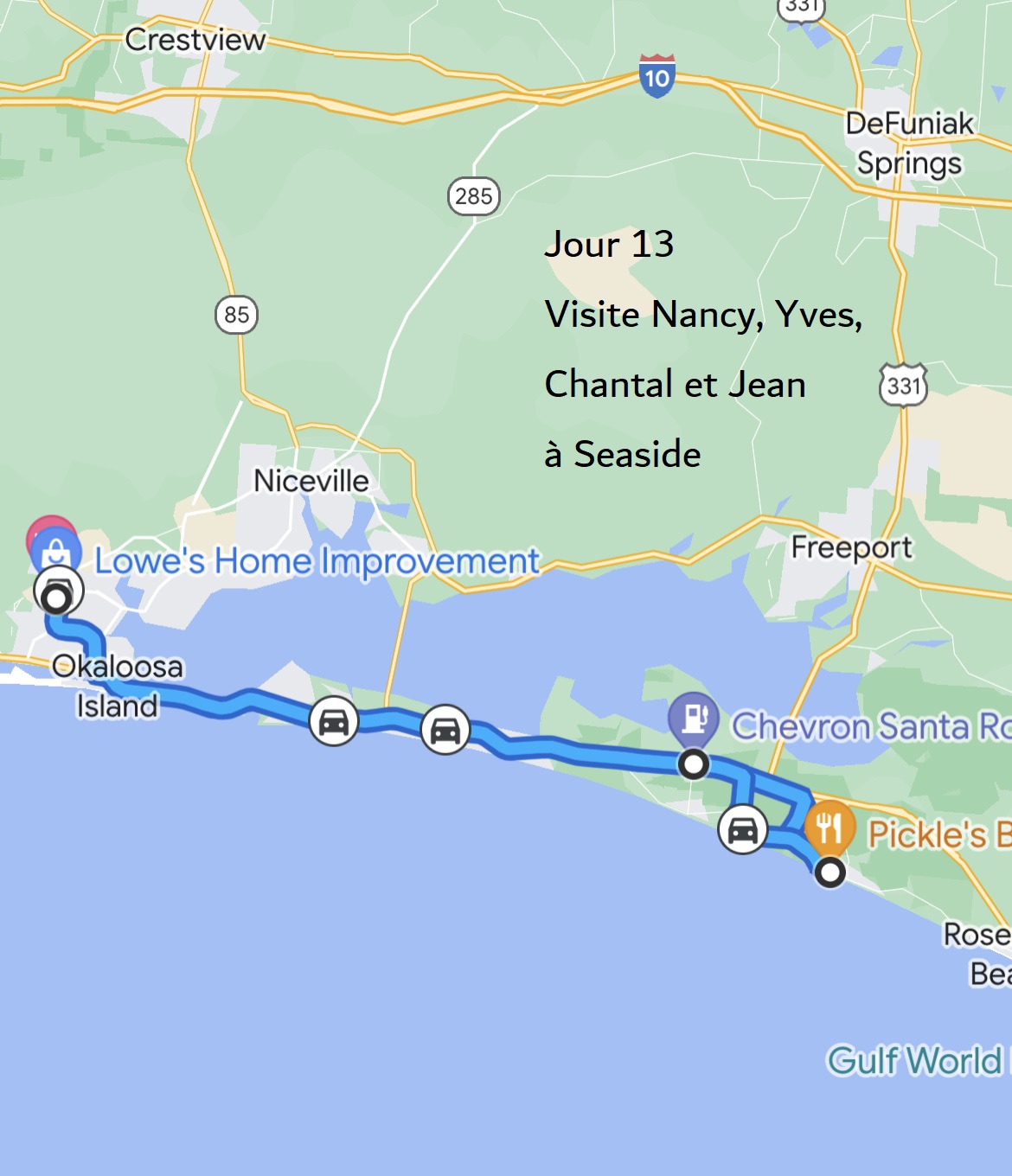 Ce fut très agréable de revoir Nancy et Yves et de connaître Chantal et Jean. Nancy et Yves me manquaient; j’avais hâte de les revoir. 😃😘 Seaside et Destin m’ont beaucoup plu. Je vais m’assurer de pouvoir y revenir plus longtemps une autre année. Je remercie Nancy et Yves pour cette belle découverte! 😘😍 Lynda et Réjean m’ont dit qu’ils avaient aussi aimé cet endroit et rencontré nos amis voyageurs.