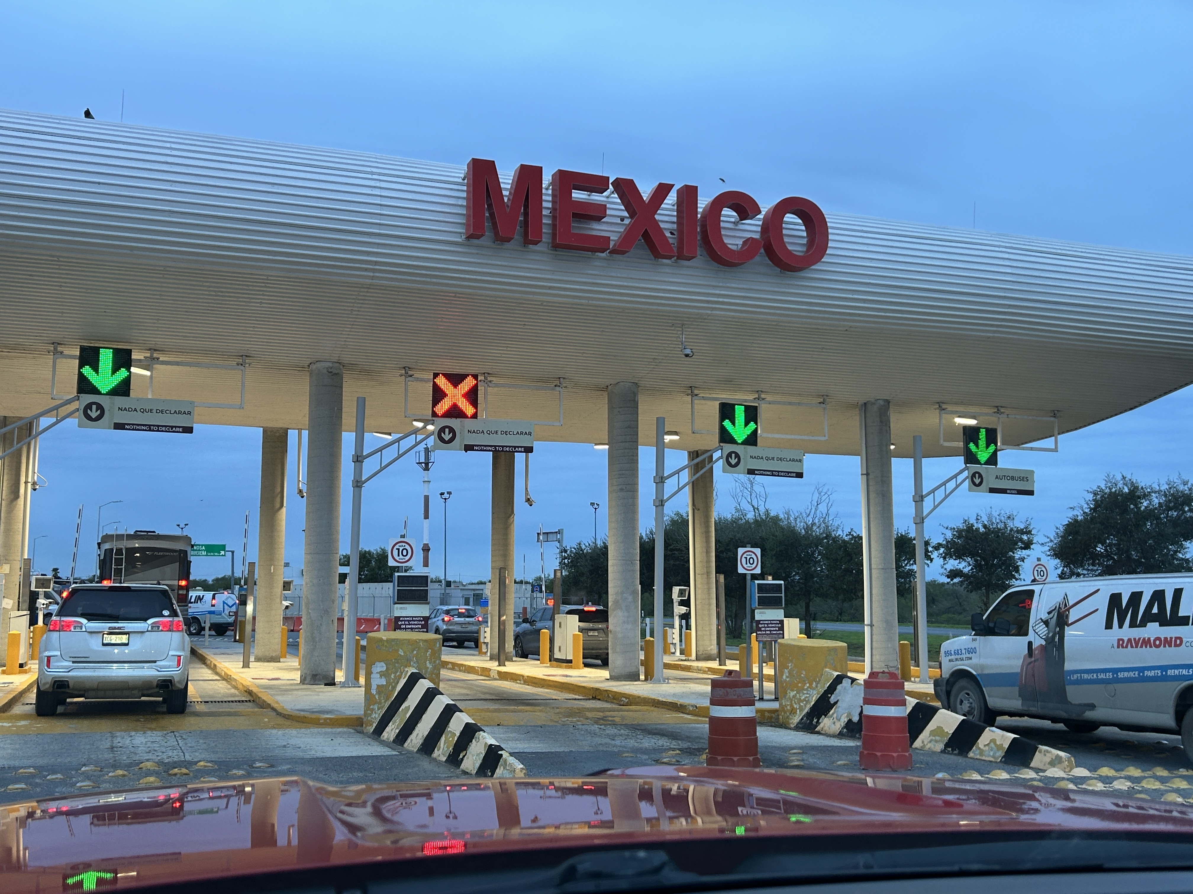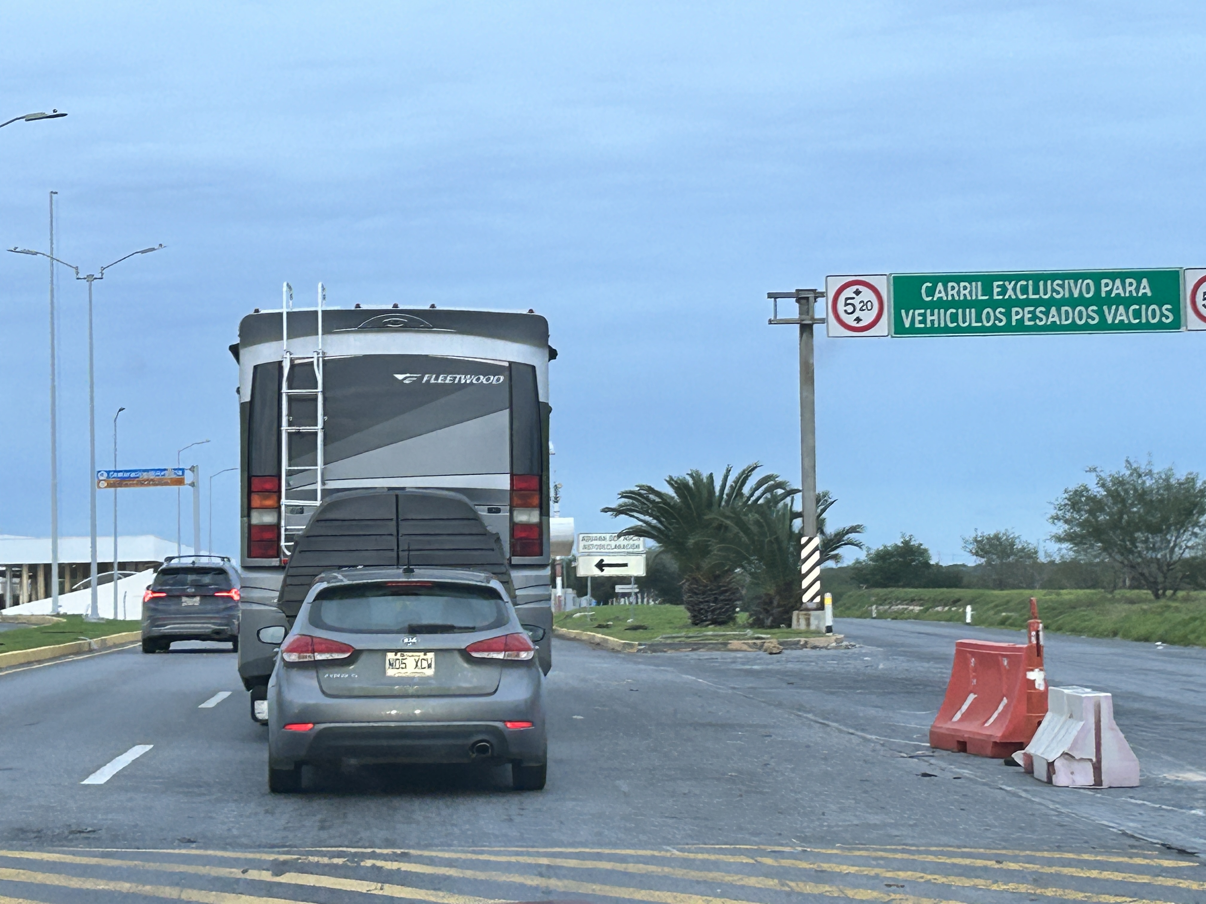 Le jour du départ, nous devions partir à 6 h 30, de Casa del Valley. La veille, j’avais mis mon réveil de manière à avoir le temps de me préparer, de débrancher l’eau et l’électricité de ma roulotte et de saluer Réjean et Lynda. Je me suis réveillée quand mon réveil a retenti… à 6 h 15. Ça m’a pris quelques secondes à réaliser que j’allais être en retard. En 15 minutes, j’ai réussi à tout faire, sauf à saluer Lynda qui était partie promener ses chiennes. Finalement, nous sommes arrivés à 7 h 28, aux douanes mexicaines de Reynosa, Puente Internacional Anzalduas. Il y avait déjà 3 ou 4 VR arrivés avant nous. Ce n’est qu’à 9 h 24 que nous avons repris la route. Bien sûr, nous avons un peu discuté dans le stationnement, mais pas plus de 15 minutes après que les derniers d’entre nous aient terminé toutes les démarches. Les démarches quelles sont-elles, me direz-vous. 🤷♂️ Je vais vous les expliquer, avec plaisir. 🤓