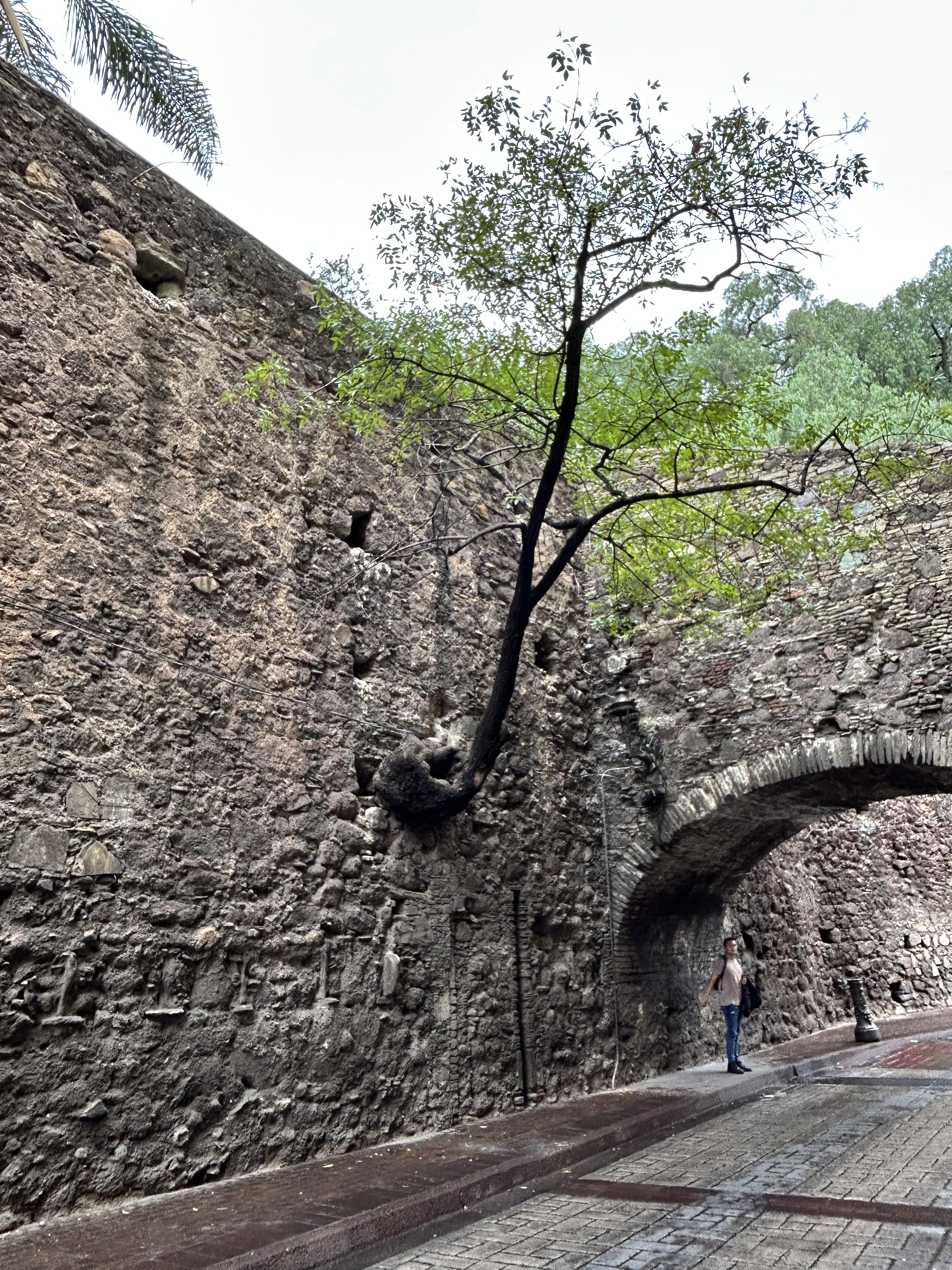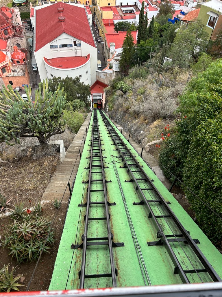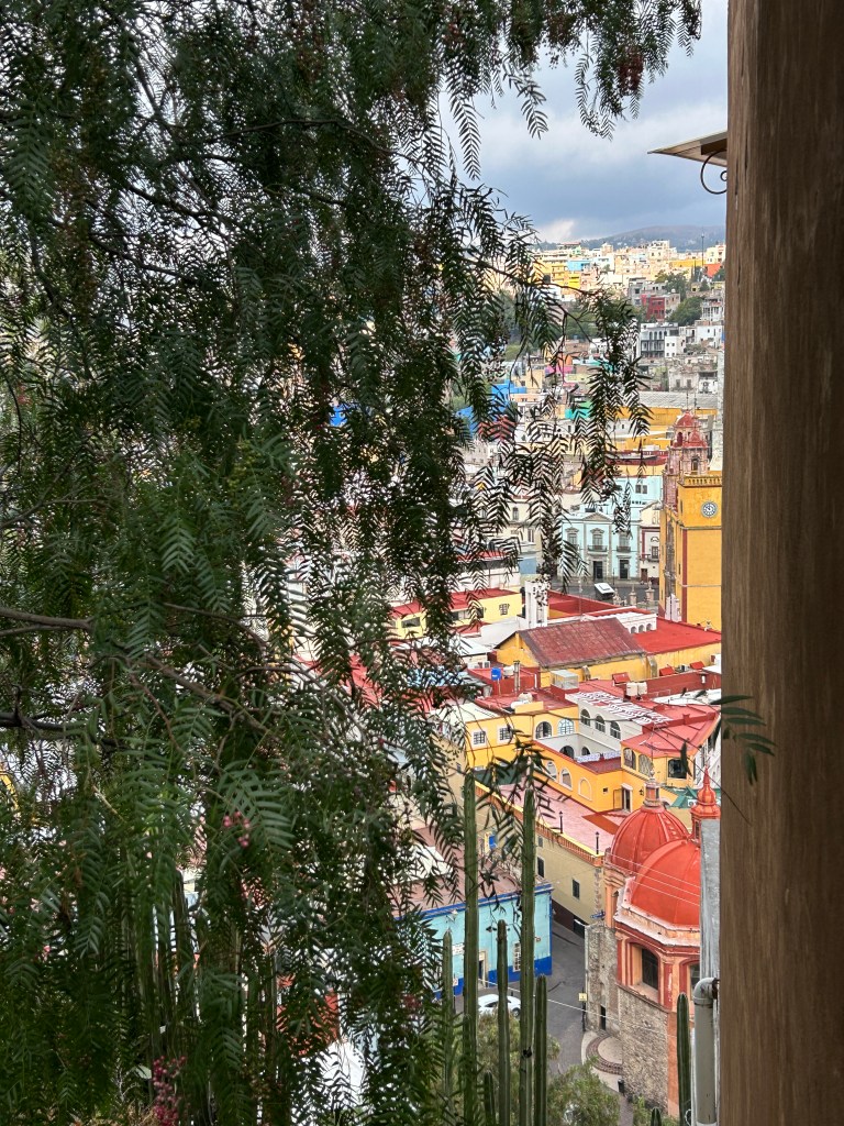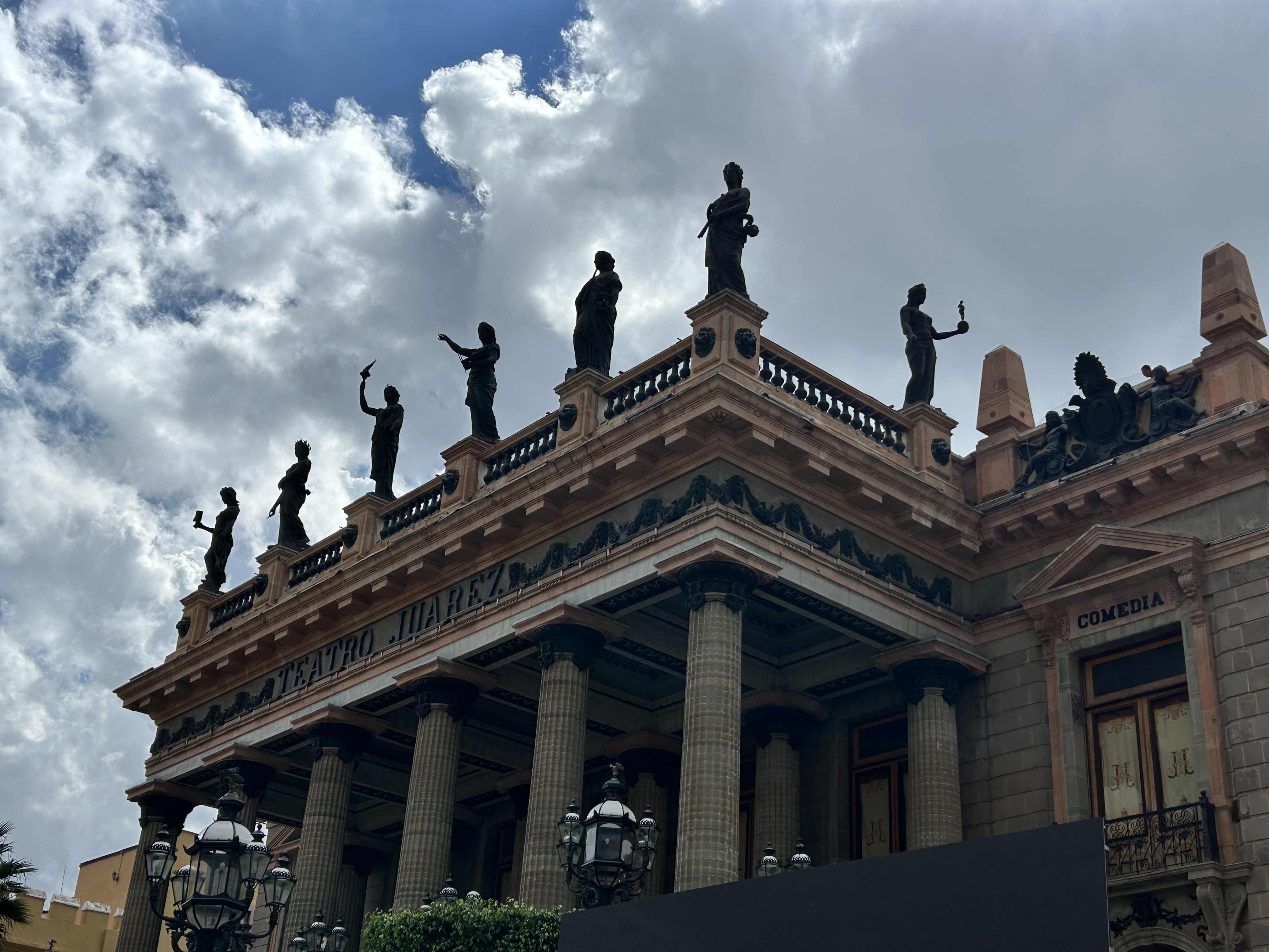 Comme nous avions faim, nous avons utilisé le funiculaire pour redescendre près du Jardín de la Unión et du théâtre Juárez. Nous n’avons pas pu visiter le théâtre, car il y avait un événement cette journée-là. Nous avons déniché un restaurant sympathique. Pendant que nous mangions une bonne sopa de tortillas, il y a eu un orage. Quelle chance nous avons !!! 😇
