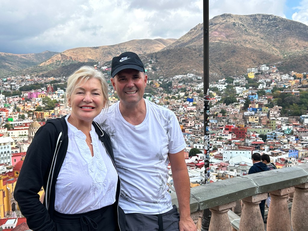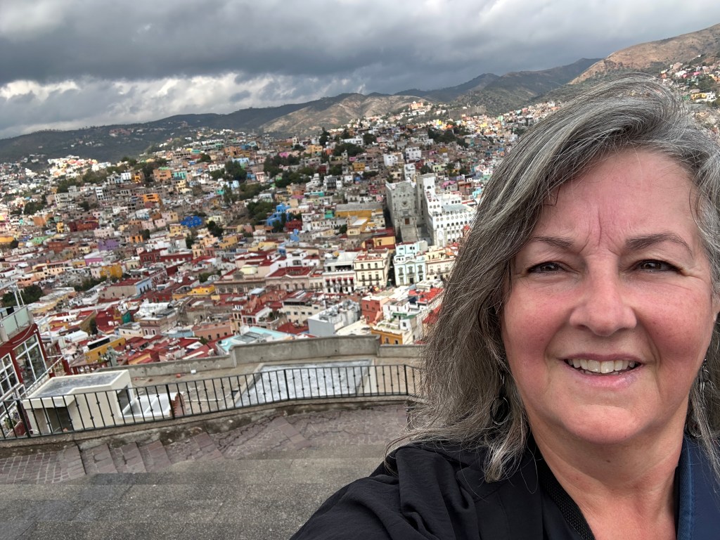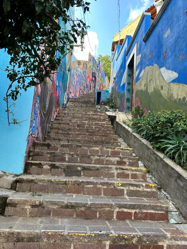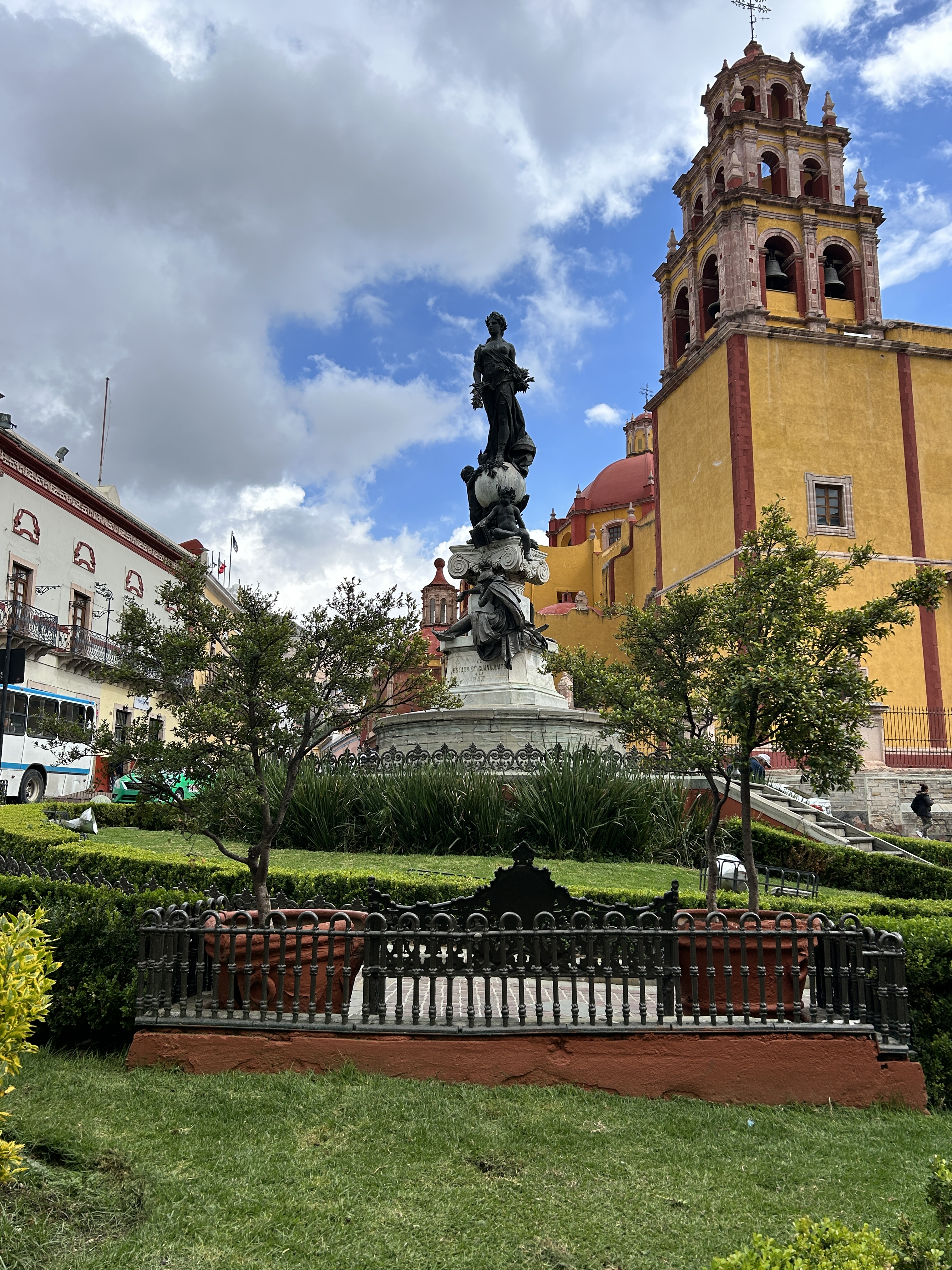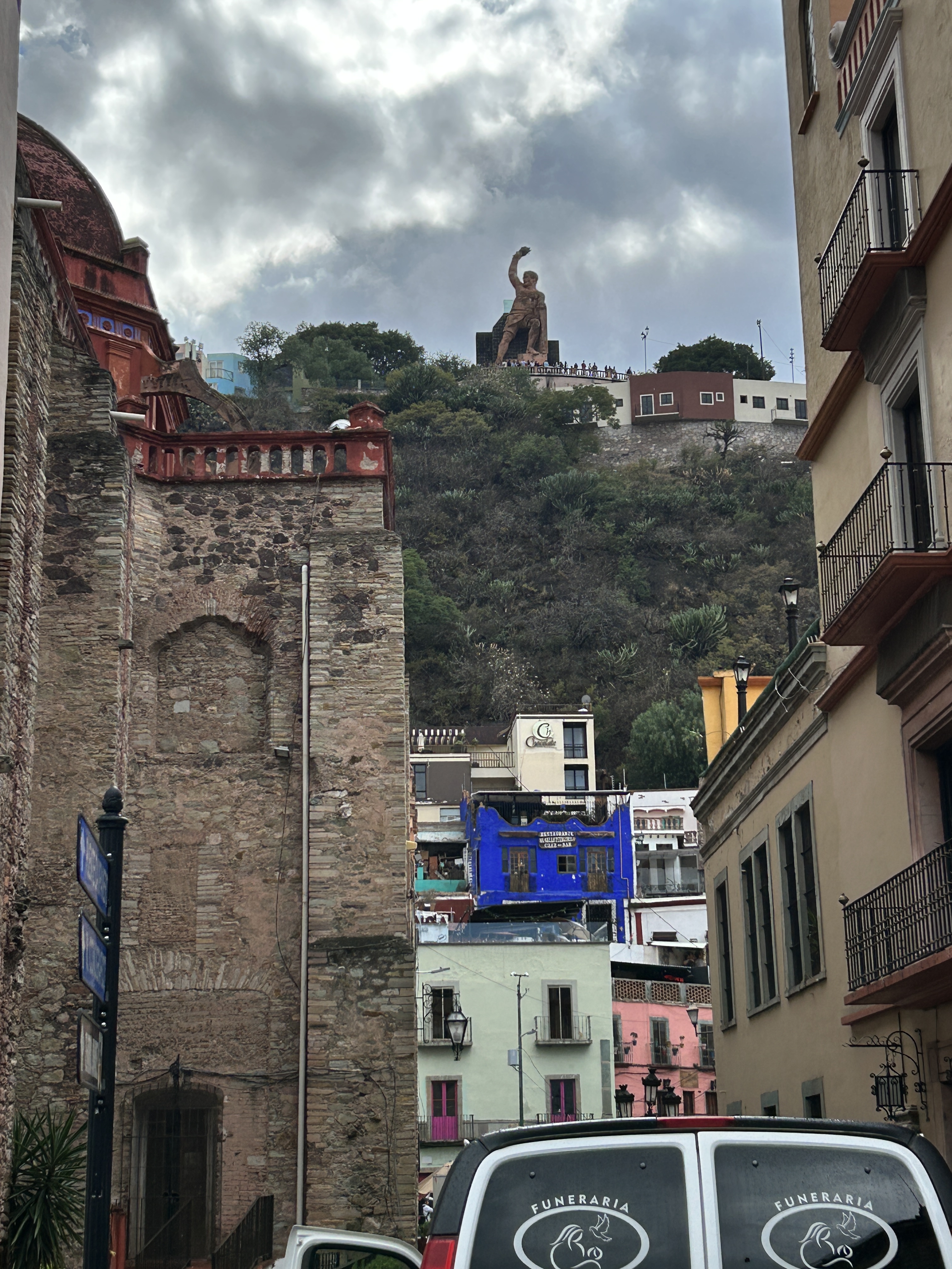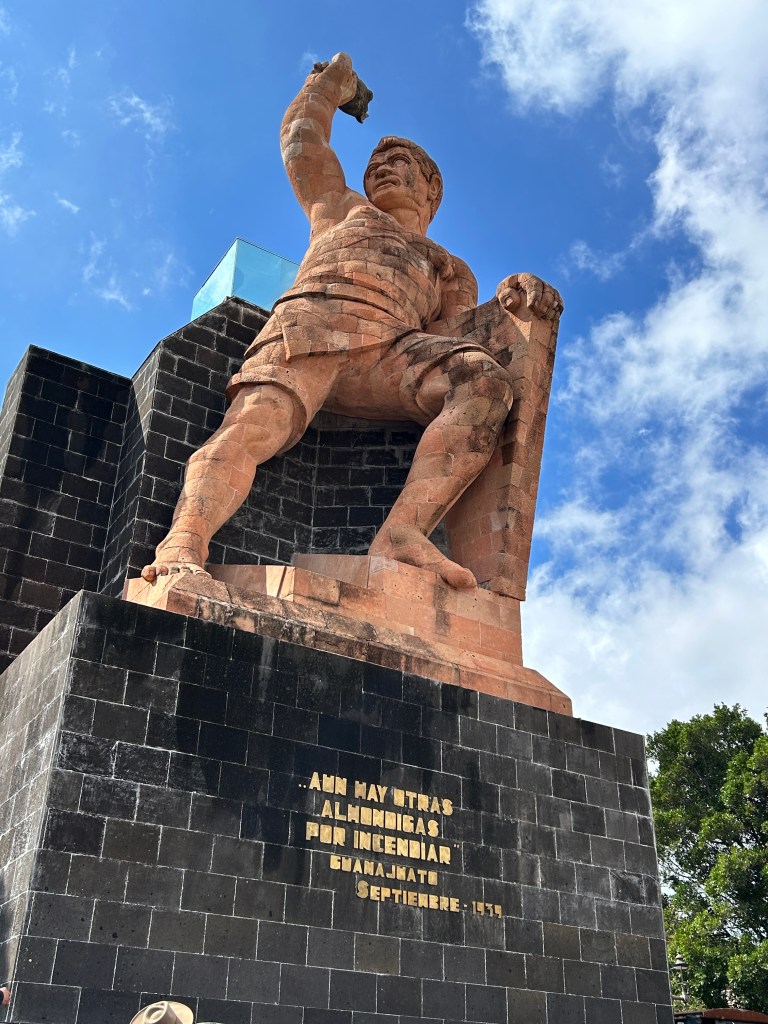 Nancy, Yves et moi avons commencé la visite nous rendant à la statue de Juan José de los Reyes Martinez Amaro « El Pípila ». « El Pípila » était un mineur qui a participé à l’indépendance du pays. Il est ainsi devenu un héros mexicain. Sa statue est située sur une esplanade sise sur les hauteurs de la ville. On peut y accéder en voiture, par un funiculaire ou en montant des marches à travers des rues escarpées de la ville. C’est cette dernière option que nous avons choisie pour y accéder. Je peux dire que la montée de « je ne sais pas combien de marches » en valait la chandelle. Une fois rendus sur l’esplanade, nous avions une vue panoramique hors du commun sur presque toute la ville, ses bâtiments colorés ainsi que les montagnes environnantes.