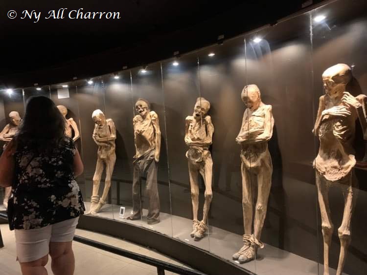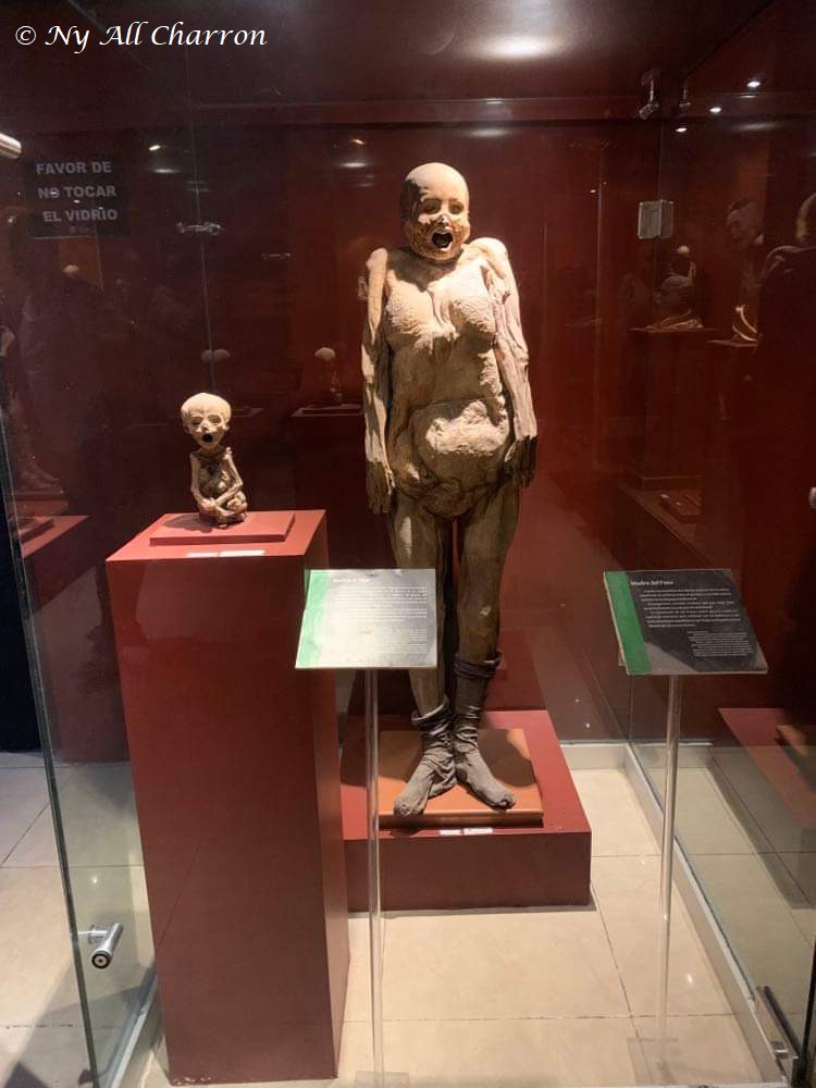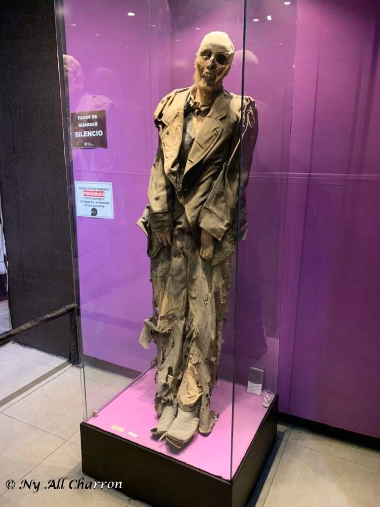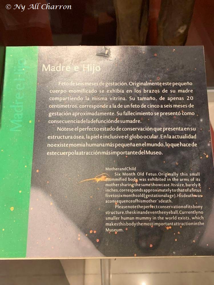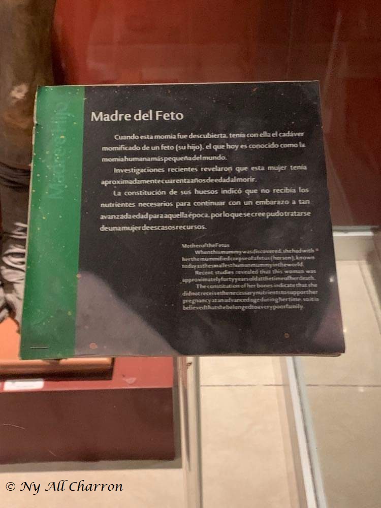 Finalement, nous avons visité le Museo de las momias (musée des momies). Ouf !!! 😲 Cette visite très particulière m’a ébranlée, surprise et intéressée, tout à la fois. Dans ce musée, il y a 119 corps momifiés, soit 79 femmes dont une a été enterrée vivante, 21 hommes et 19 enfants dont la plus petite momie du monde. J’ai été énormément ébranlée par les momies d’enfants. Lorsque je les ai vues, j’ai cru revoir la tombe de mon fils, Pierre. J’ai pris un temps pour me remettre de cette émotion et j’ai pu passer dans la salle où elles étaient exposées. J’ai été surprise de voir leur état de conservation. Certaines avaient encore leurs vêtements. D’autres avaient encore leurs poils ou leurs cheveux. On distinguait aussi leur sexe ou le poids que ces personnes devaient avoir lorsqu’elles étaient vivantes. Elles m’ont intéressée à cause de l’origine de leur momification et de la façon dont elles ont été trouvées. J’ai appris qu’elles étaient dans cet état en raison de la composition minérale du sol. Je crois avoir compris que, sauf une, ils étaient dans des cryptes et n’ont pas été déterrés. On les avait trouvées d’une manière assez extraordinaire. Voici une traduction libre d’un texte se trouvant dans le musée et sur l’avant-dernière photo :