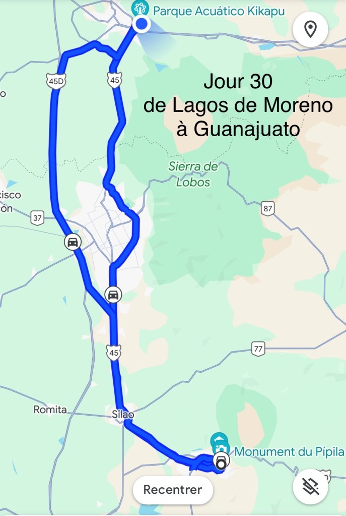Notre visite s’est terminée ainsi, car il était temps de revenir à Lagos de Moreno où nous sommes stationnés pour trois nuits, au camping Kikapu. Je retiens de cette visite la beauté de la ville et son atmosphère sereine, romantique et chaleureuse. J’ai pris plaisir à me promener dans cette ville. Le faire avec Yves et Nancy a été très agréable. Je n’ai toutefois pas eu l’occasion de voir le Teatro Juárez, le marché Hidalgo, ses rues souterraines, la Calle de los besos (la rue des baisers), la Boca del infierno (bouche de l’enfer) et plusieurs musées. Qu’à cela ne tienne ; ça me donnera une raison pour revenir visiter cette magnifique ville. 😉