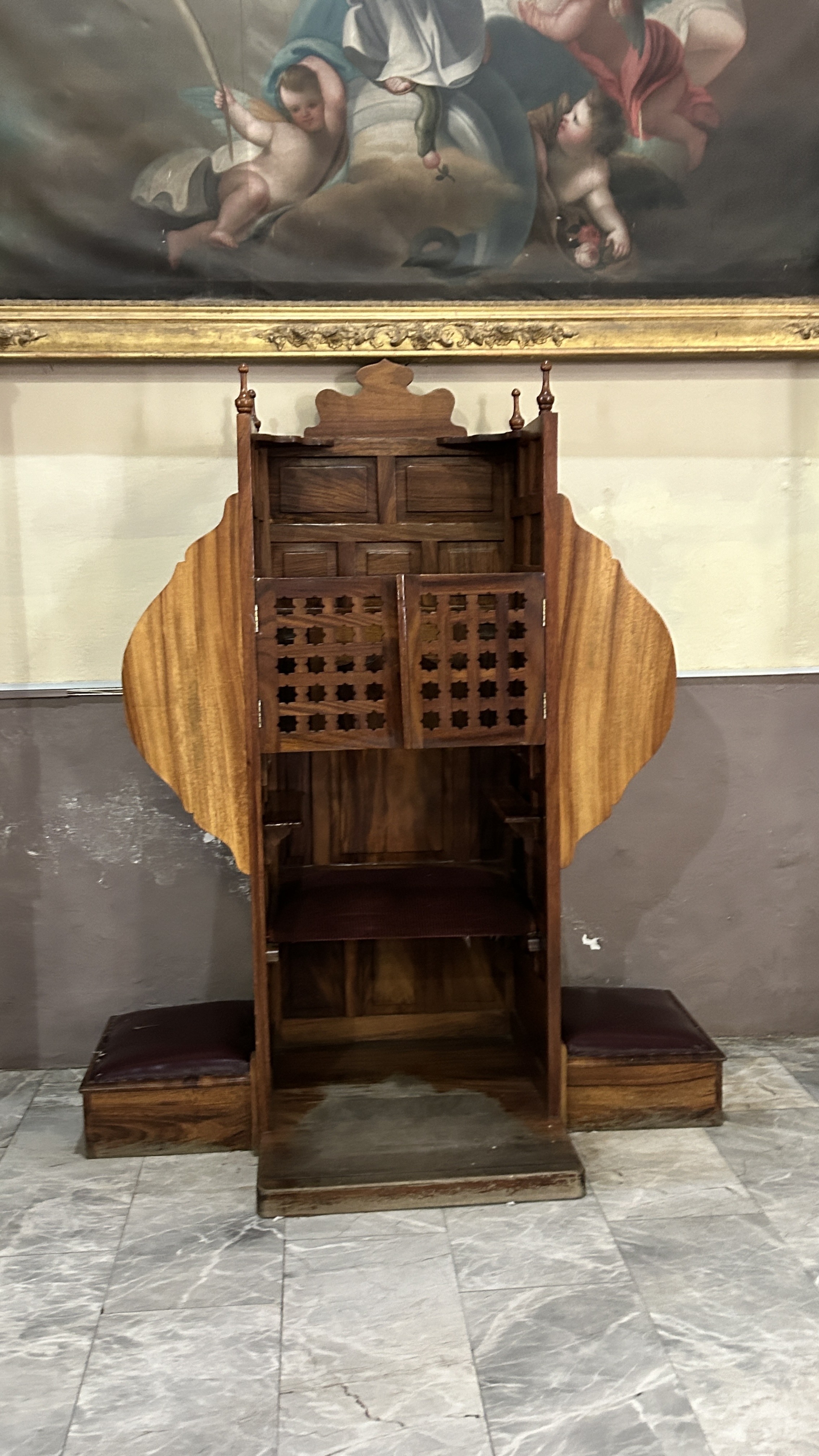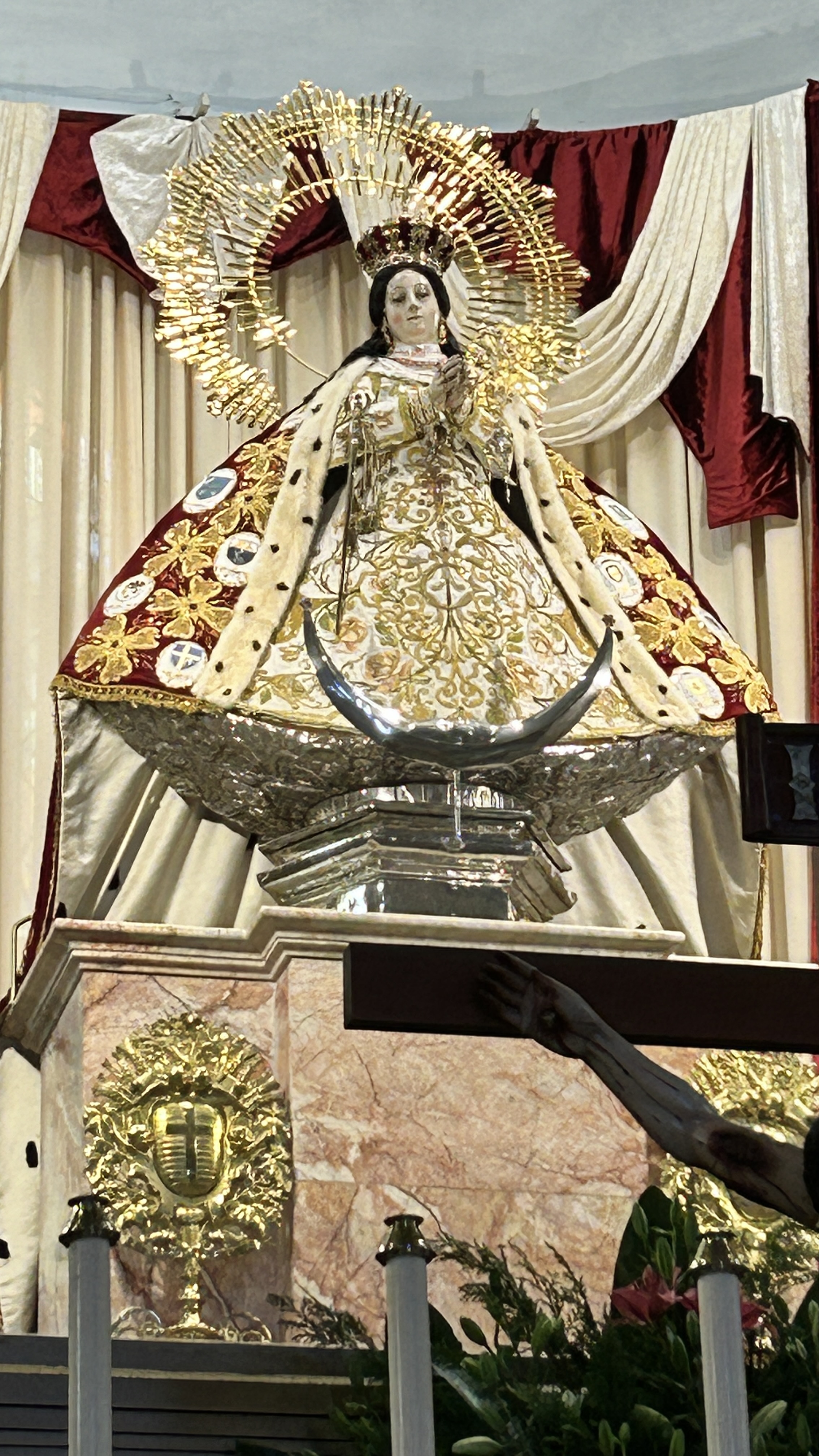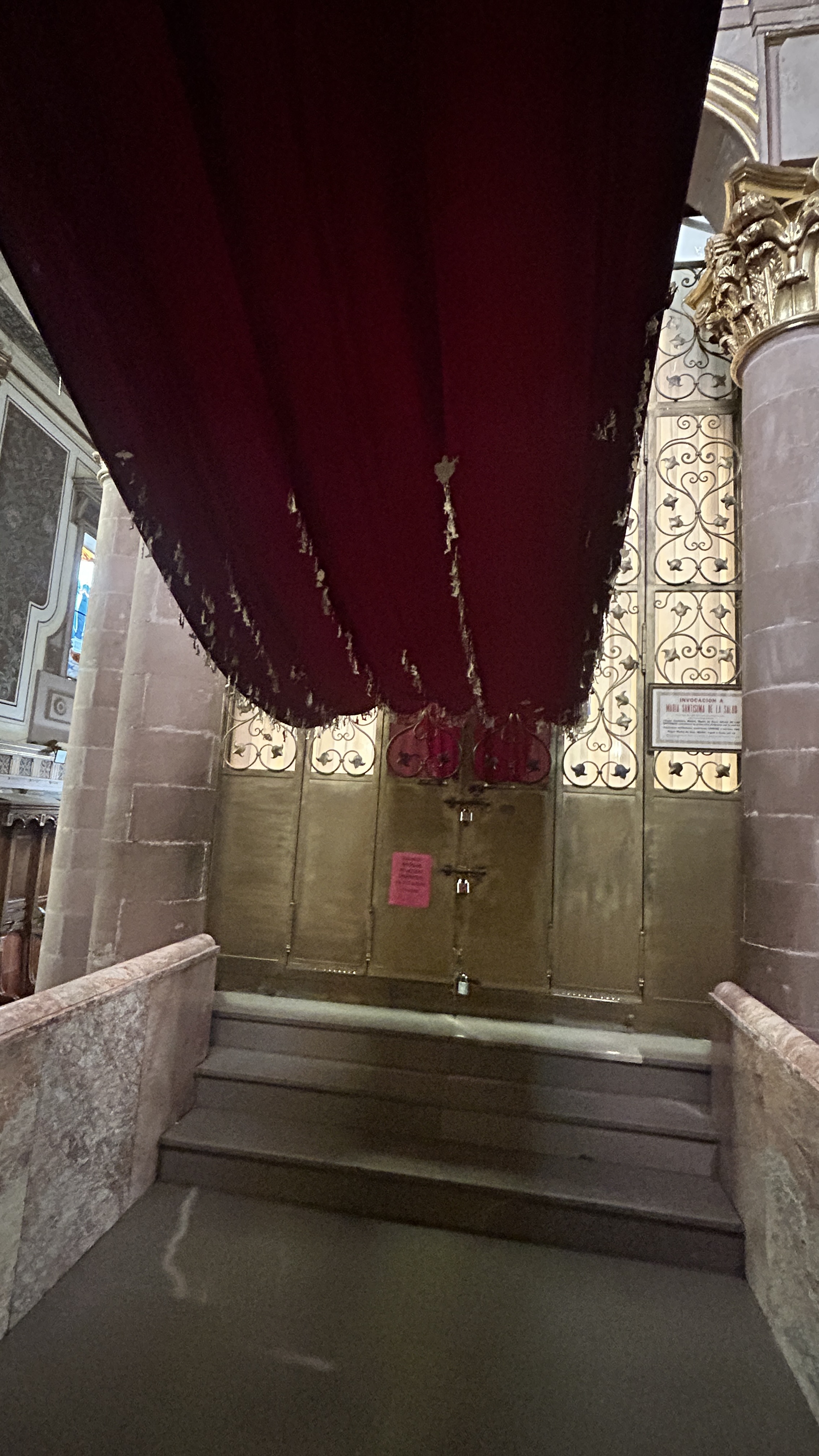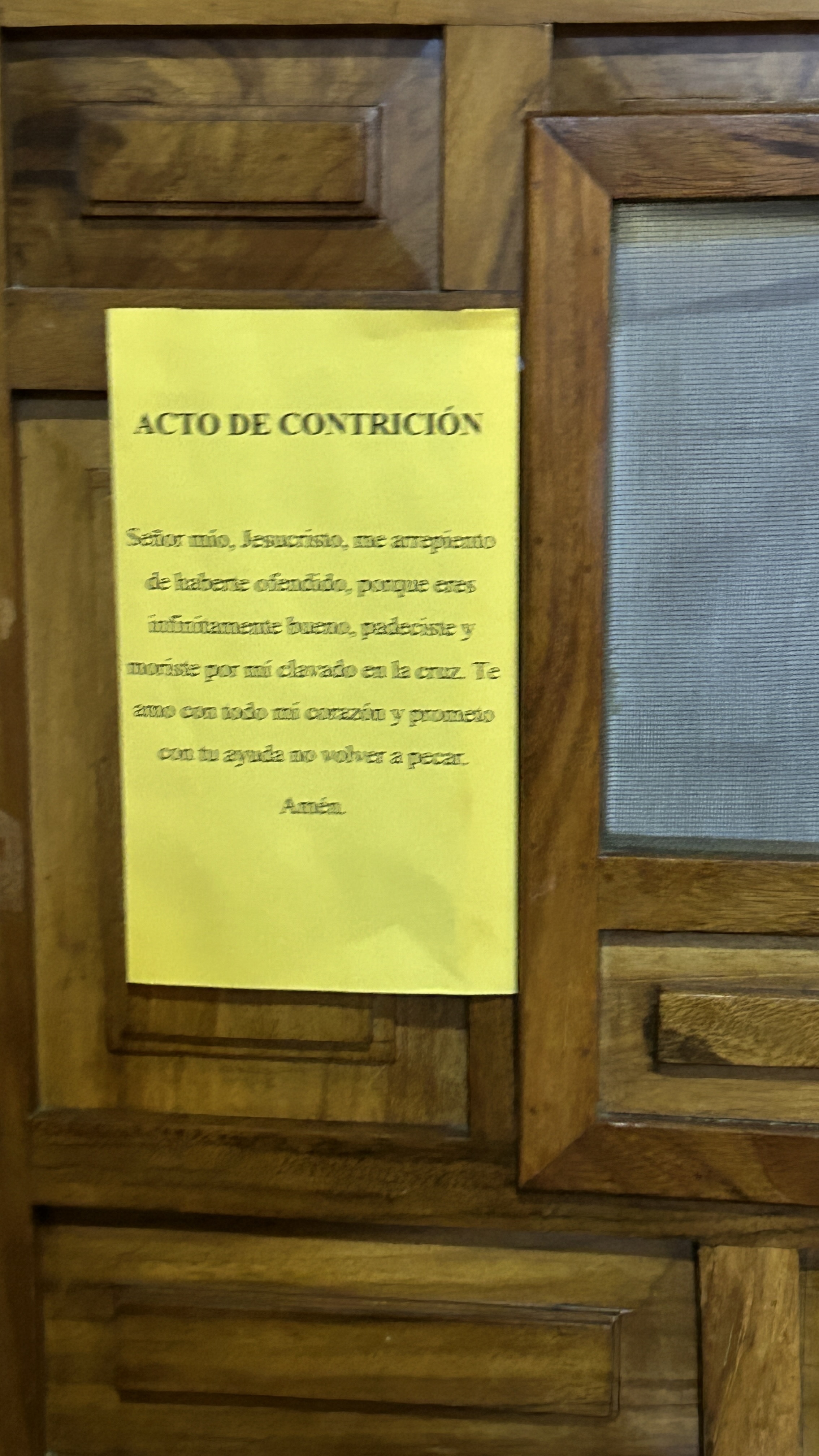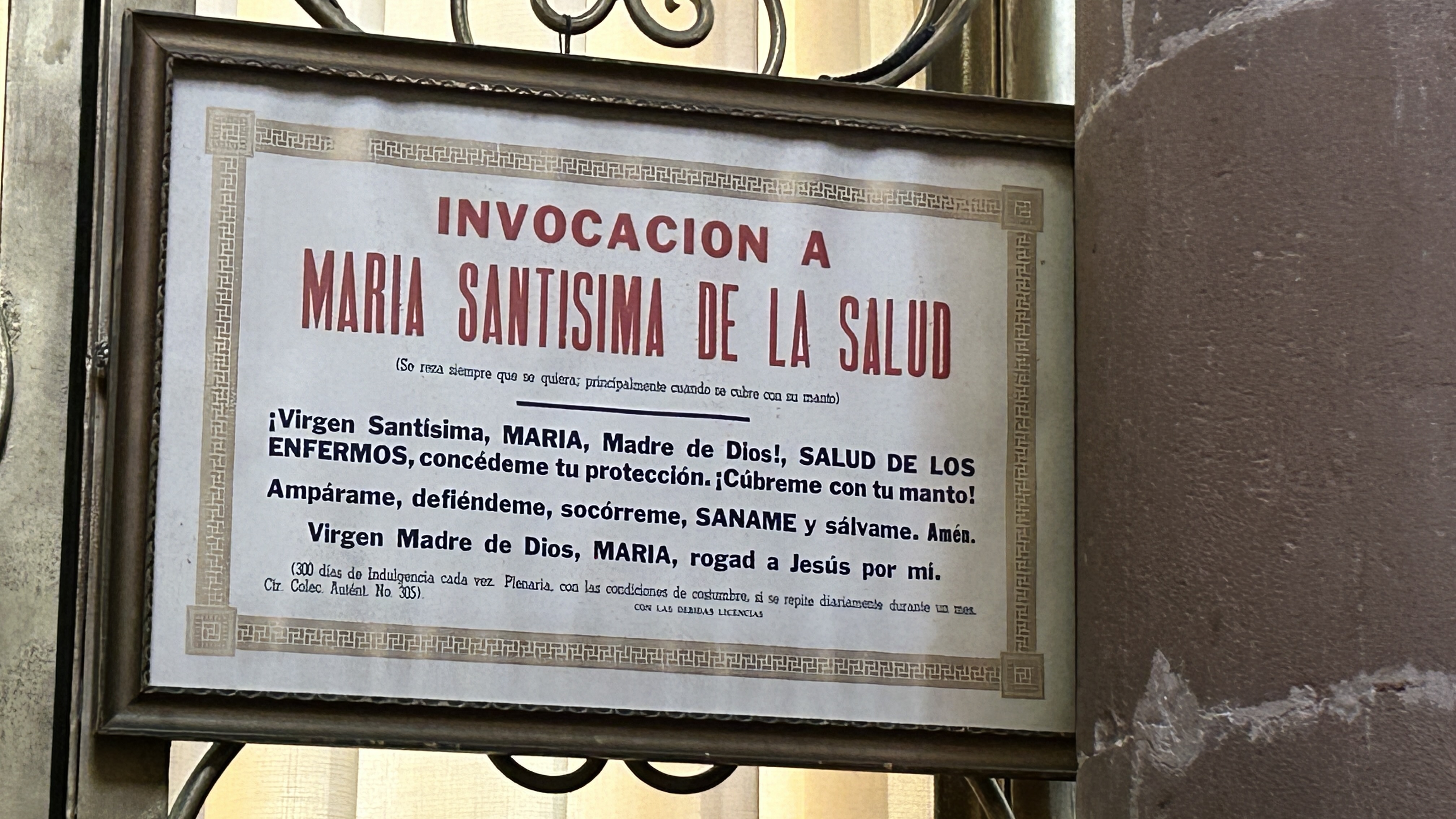 Lorsque j’ai visité la basilique, j’ai prié Maria Santisima de la salud (Marie Très Sainte de la santé), pour ma mère. J’aurais pu prier pour tellement de personnes que je connais, mais je manquais un peu de temps. J’ai lu la prière et j’ai broché une effigie d’elle afin qu’elle retrouve la santé de ses articulations. Dès que je pense à une personne qui a des douleurs, je redis cette prière. Je conserverai cette prière pendant longtemps. Je la comprends en espagnol, mais je l’ai aussi traduite pour ma mère et pour tous ceux qui voudront la réciter. Le manteau mentionné dans la prière est le tissu rouge. Il part des épaules de la statue et va jusqu’à l’arrière où on accroche les parties du corps qui sont malades. Pour ma mère, j’ai pris une femme complète puisqu’il y a des articulations partout dans notre corps.