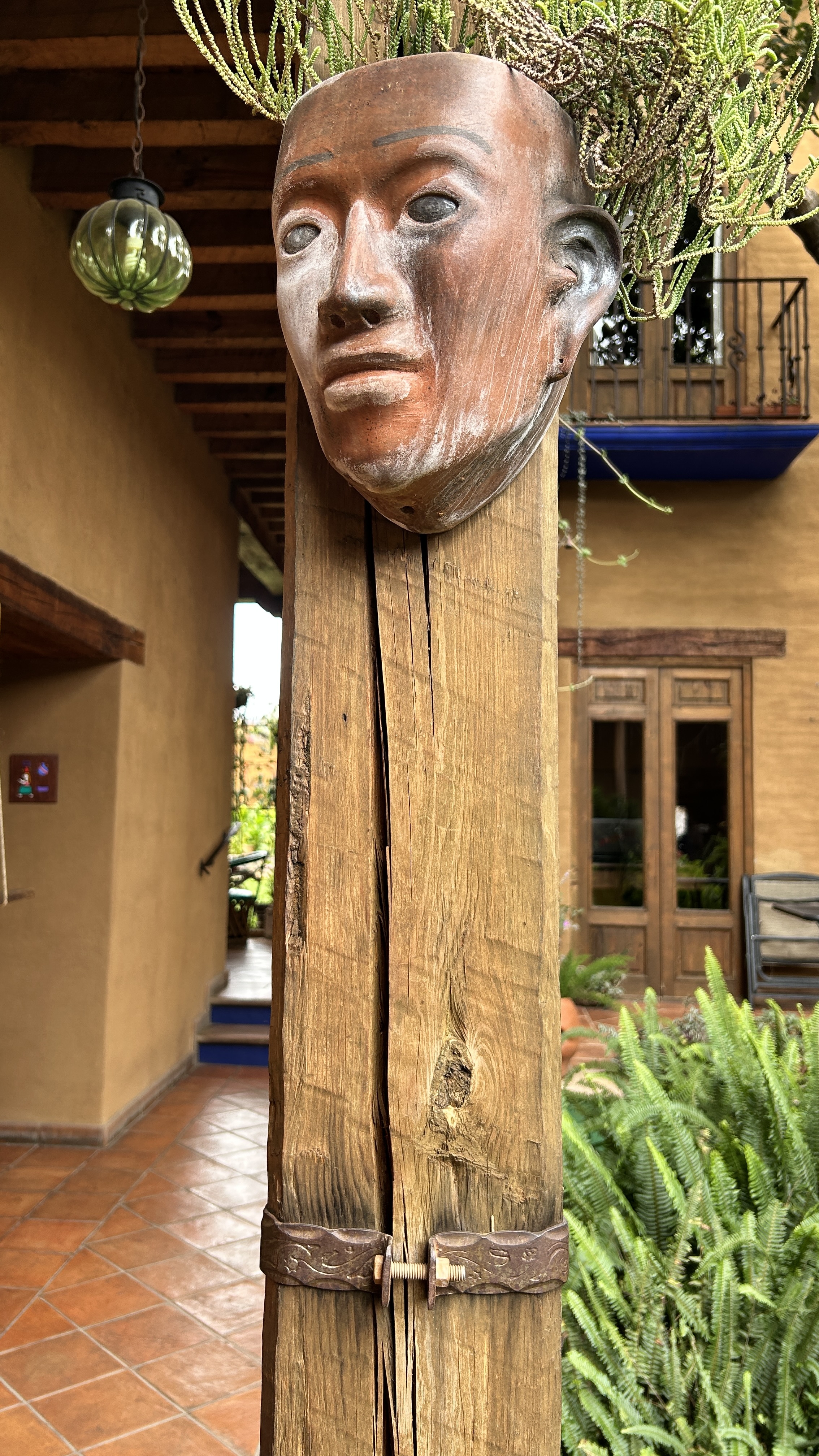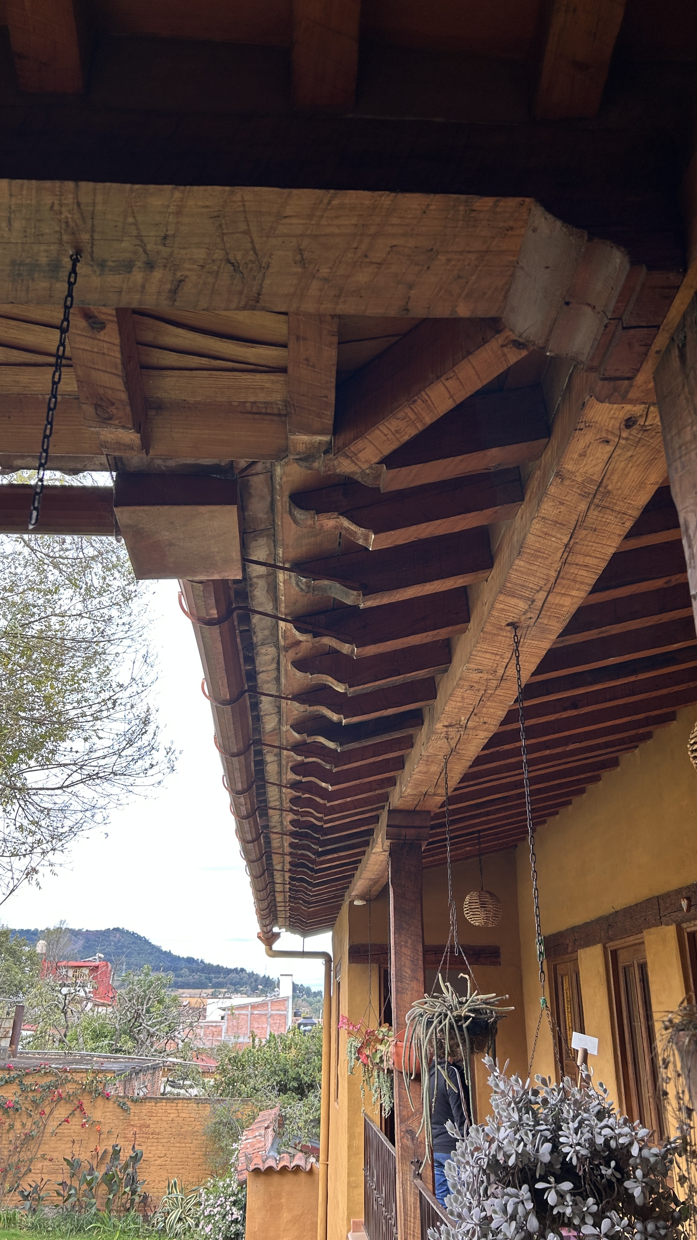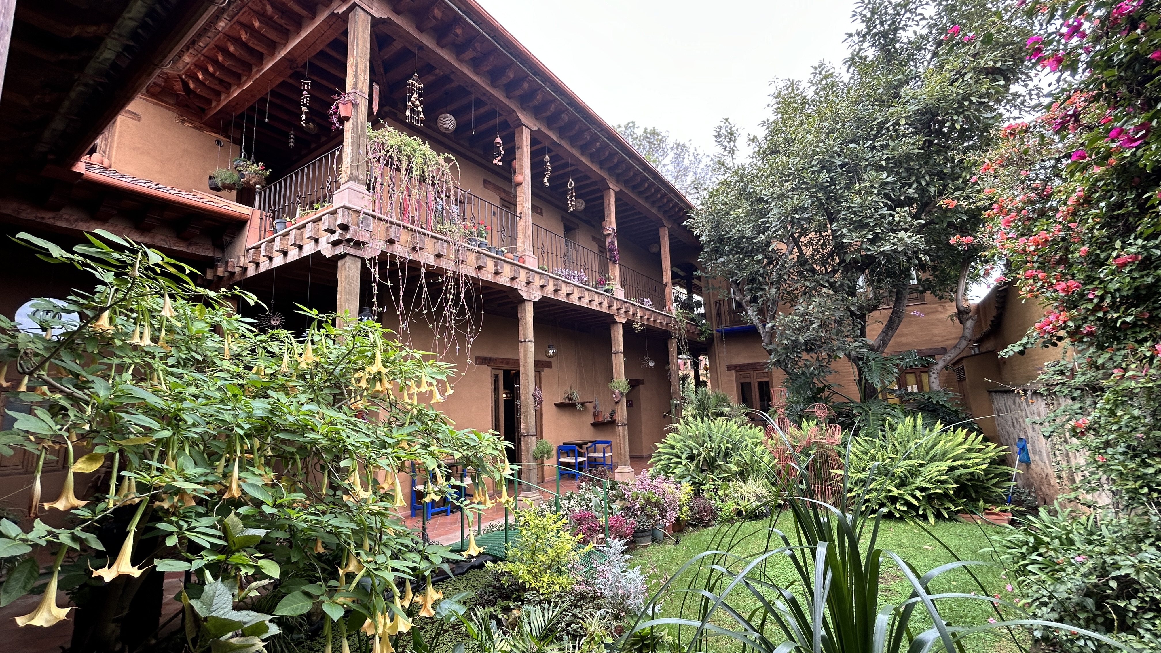 Éric et Vicky nous ont fait visiter leur auberge, en nous mentionnant que celle-ci était aménagée comme la plupart des maisons mexicaines. Les habitations sont fermées par de hauts murs, sur les quatre façades. À l’intérieur de cette muraille se trouve tout ce qu’on retrouve dans nos propriétés, mais disposé différemment. Bien entendu, leur auberge comporte plus de chambres qu’une habitation régulière. Dans la plupart des habitations, il y a un salon intérieur ainsi qu’un patio pour recevoir les invités, à l’entrée de la propriété. Les patios sont souvent des jardins aménagés pour recevoir avec des endroits protégés contre le soleil et d’autres non. Souvent, il y a des chambres au-dessus du salon. Un bâtiment comprenant les chambres à l’étage ainsi que la salle à manger et la cuisine au rez-de-chaussée fait face au premier patio. Ensuite vient le deuxième patio où la famille se retrouve dans l’intimité. Les salles de bain et les toilettes sont réparties dans les bâtiments. Un troisième patio se trouve au fond de la propriété où se trouvent les animaux, les jardins et les arbres fruitiers. La plupart des fenêtres donnent sur la cour intérieure. Souvent, le salon avant est transformé en boutique. En campagne, la muraille sera parfois moins haute et les jardins pourraient être plus exposés.