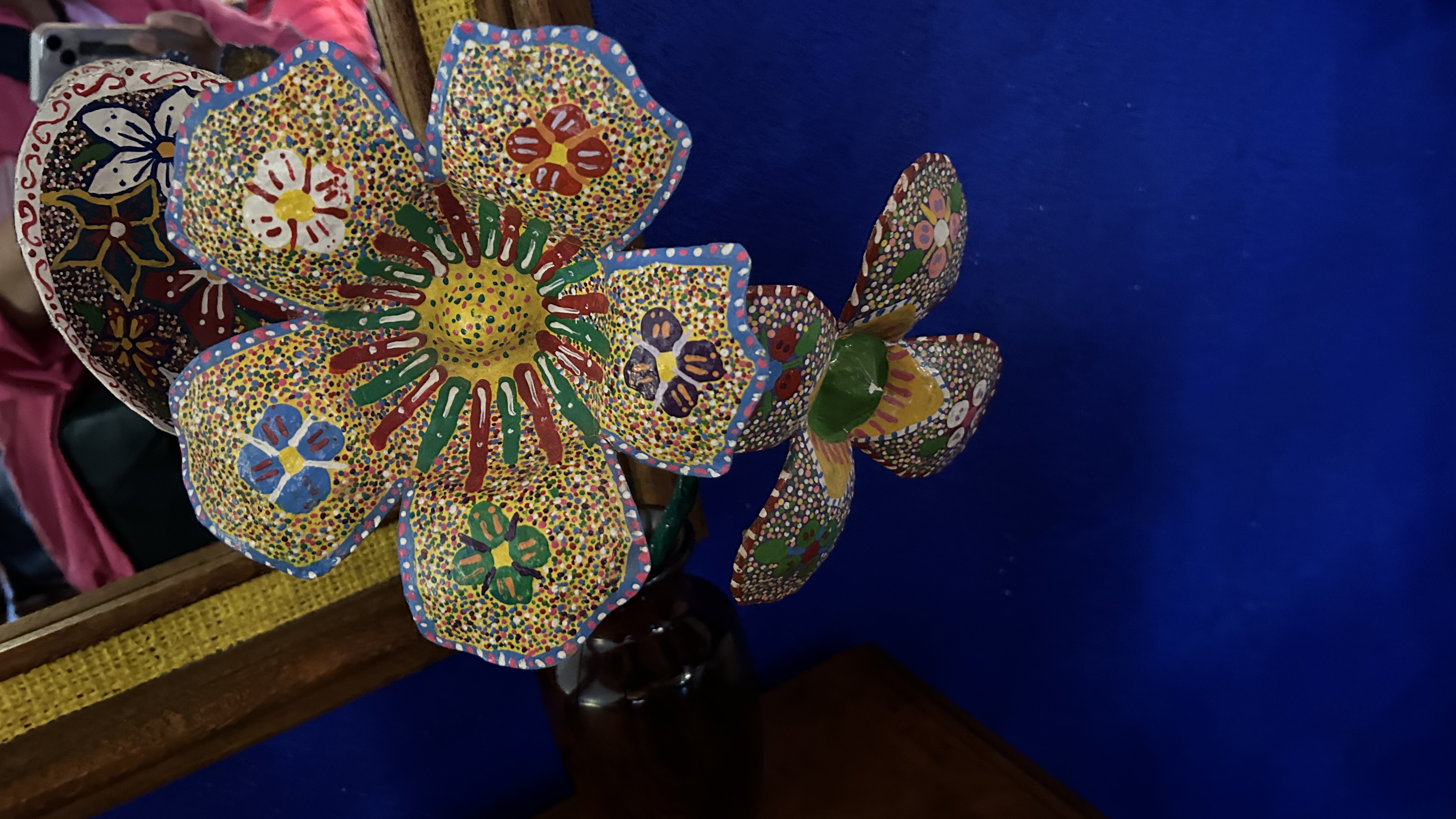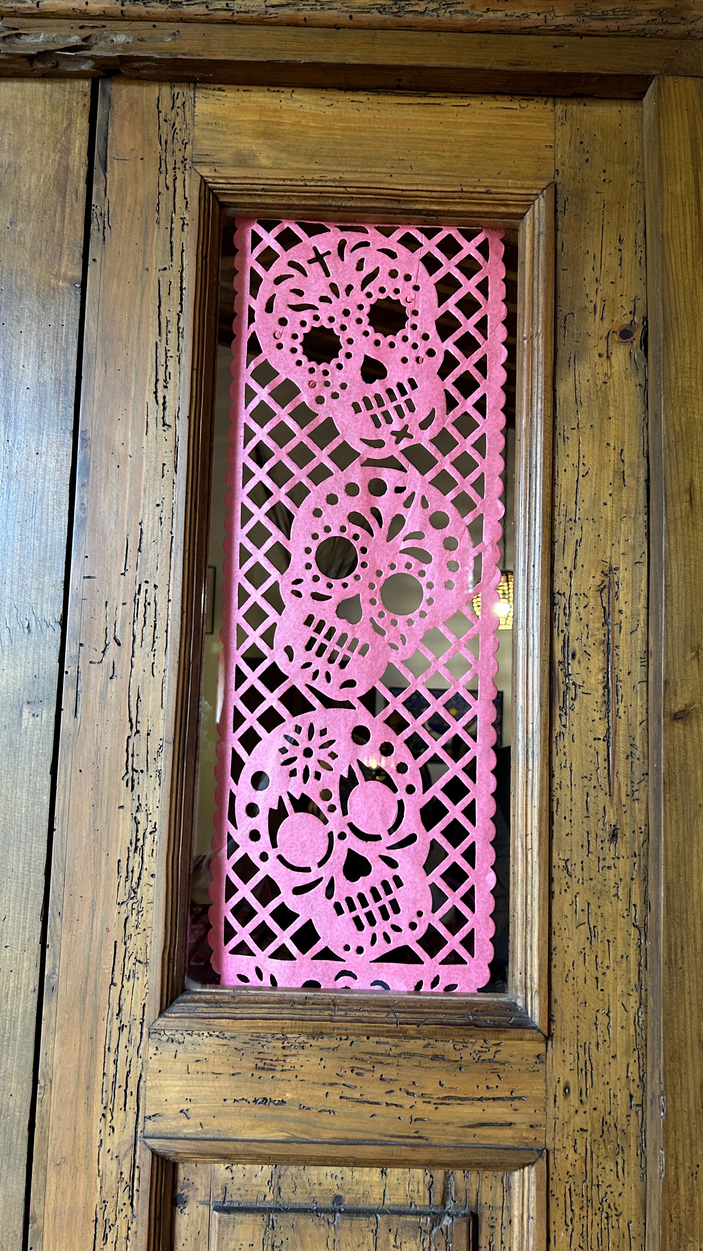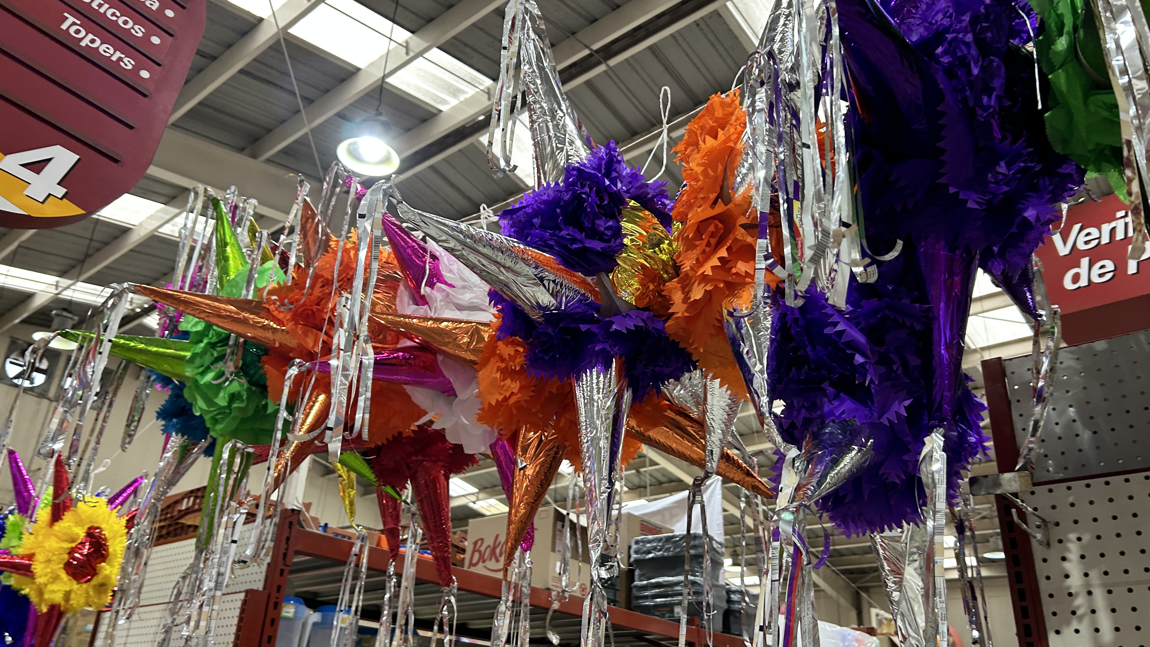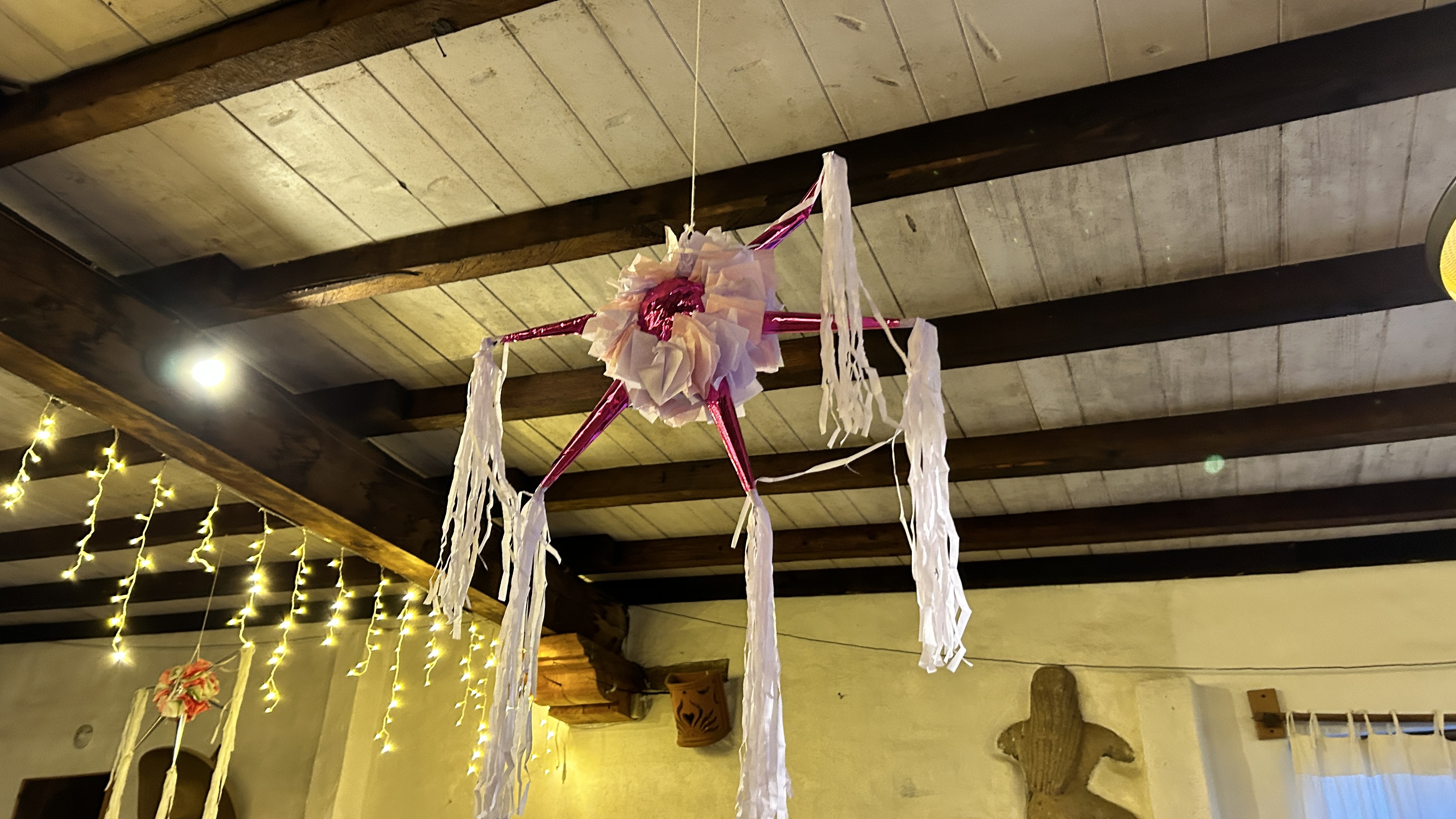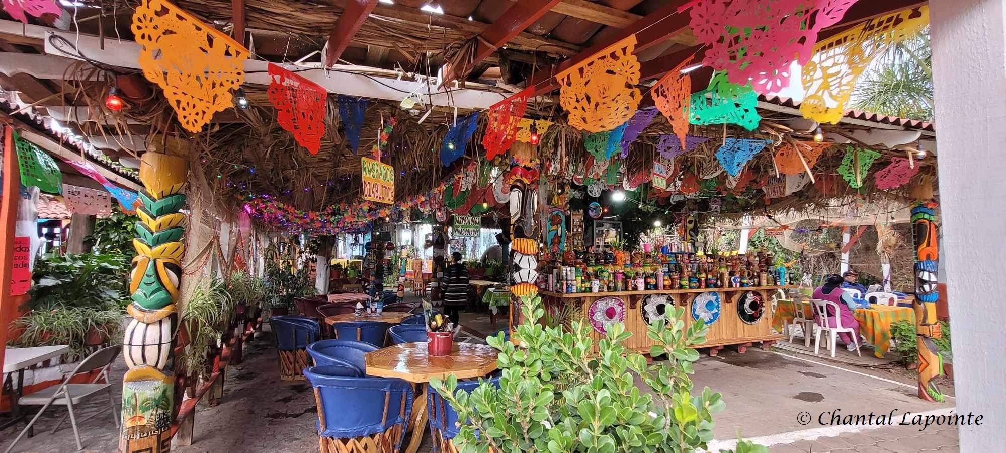 Les piñatas aussi décorent les résidences et les lieux publics des Mexicains. Vicky nous a expliqué leur signification. Elles représentent un esprit mauvais. Lorsque les enfants tapent dessus avec un bâton, leur innocence permet de libérer l’esprit négatif et de faire jaillir les bonnes choses, la lumière, les douceurs, les bonbons. On bande les yeux des enfants pour qu’ils ne soient pas attirés par le mauvais esprit. Les piñatas sont des représentations d’esprit maléfiques ou d’une boîte à sept piques (les sept péchés capitaux) et d’une base (le diable) faites de papier mâché. Le bâton représente Dieu. Les douceurs sont les bienfaits distribués par Dieu. Elles sont creuses à l’intérieur et on y insère des douceurs qui feront la joie des petits et des grands. 😁
