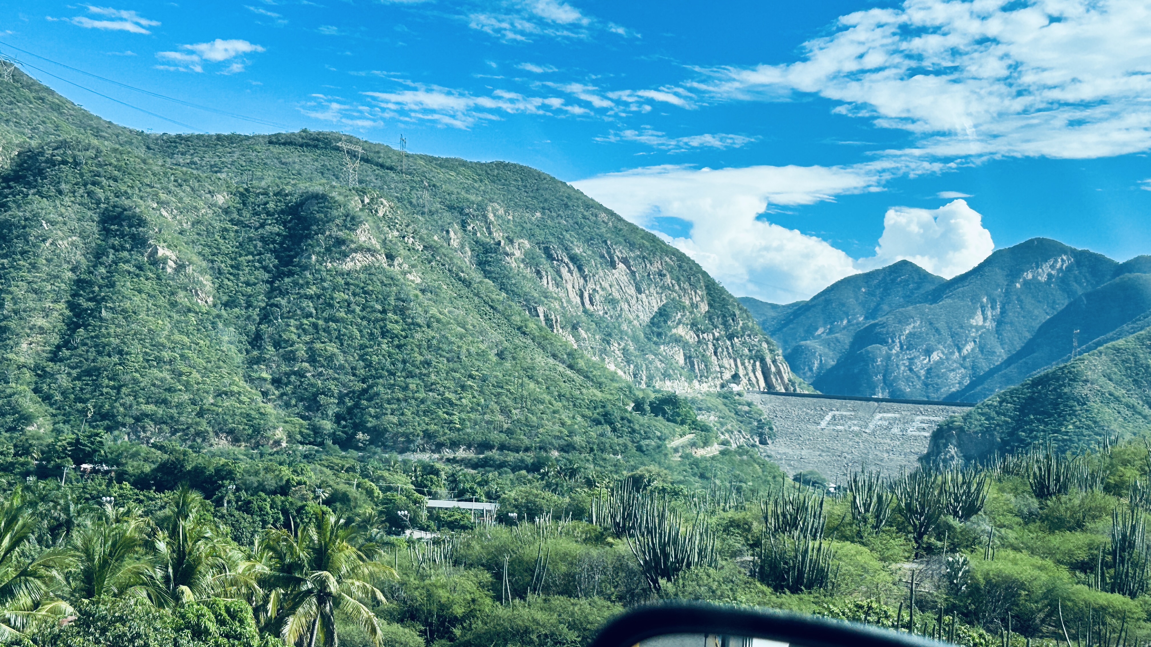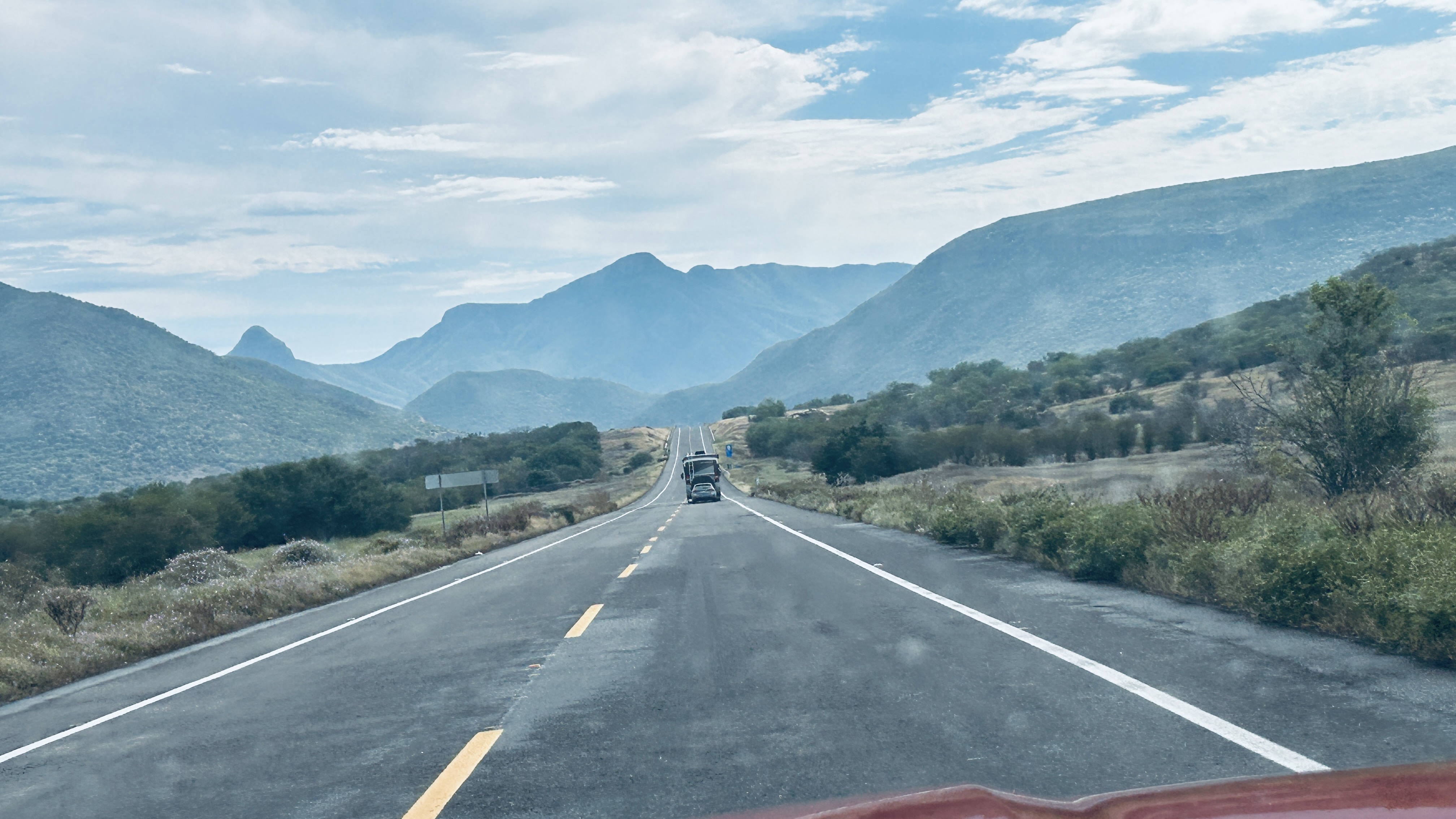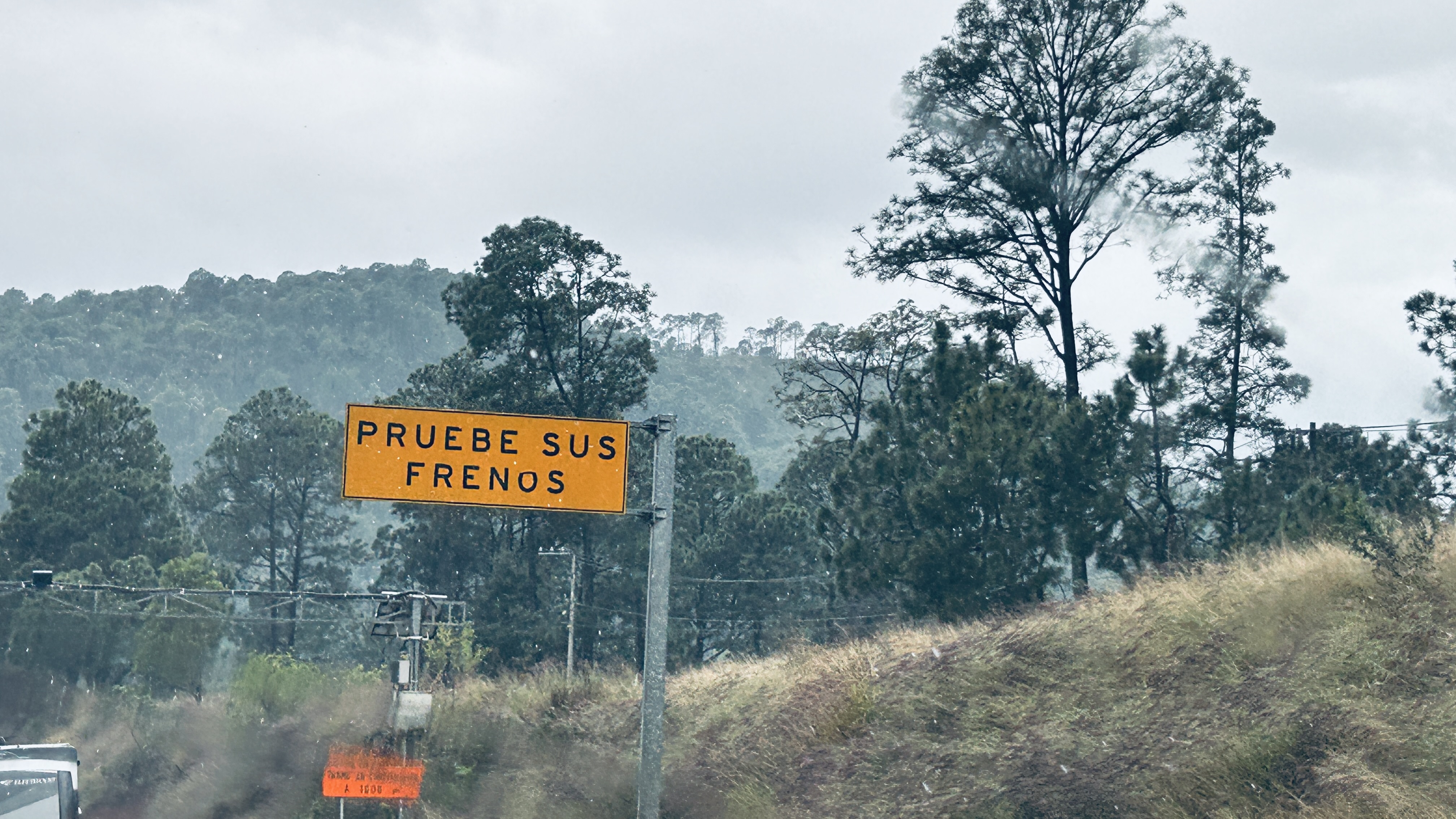 Nous avions des descentes assez impressionnantes. Il y a des panneaux de signalisation qui nous invite à tester nos freins. Nous avons d’ailleurs senti l’odeur de freins chauffés. 😨 J’ai appelé Yves, avec le walkie-talkie, pour lui demander s’il sentait cette odeur lui aussi. Heureusement, il la sentait aussi et elle ne provenait pas de ses pneus. Un peu plus loin, dans la zone de freinage, nous avons vu d’où provenait l’odeur. Je n’ai pas eu le temps de prendre une bonne photo ; on ne voit que l’arrière du camion. Un camion-remorque était arrêté à cet endroit et ses pneus fumaient. À quelques reprises, nous avons vu des voitures de police en carton ; probablement pour ralentir la vitesse en remplacement des topes (voir l’article La conduite et la sécurité routière au Mexique pour savoir de quoi je parle). 😁