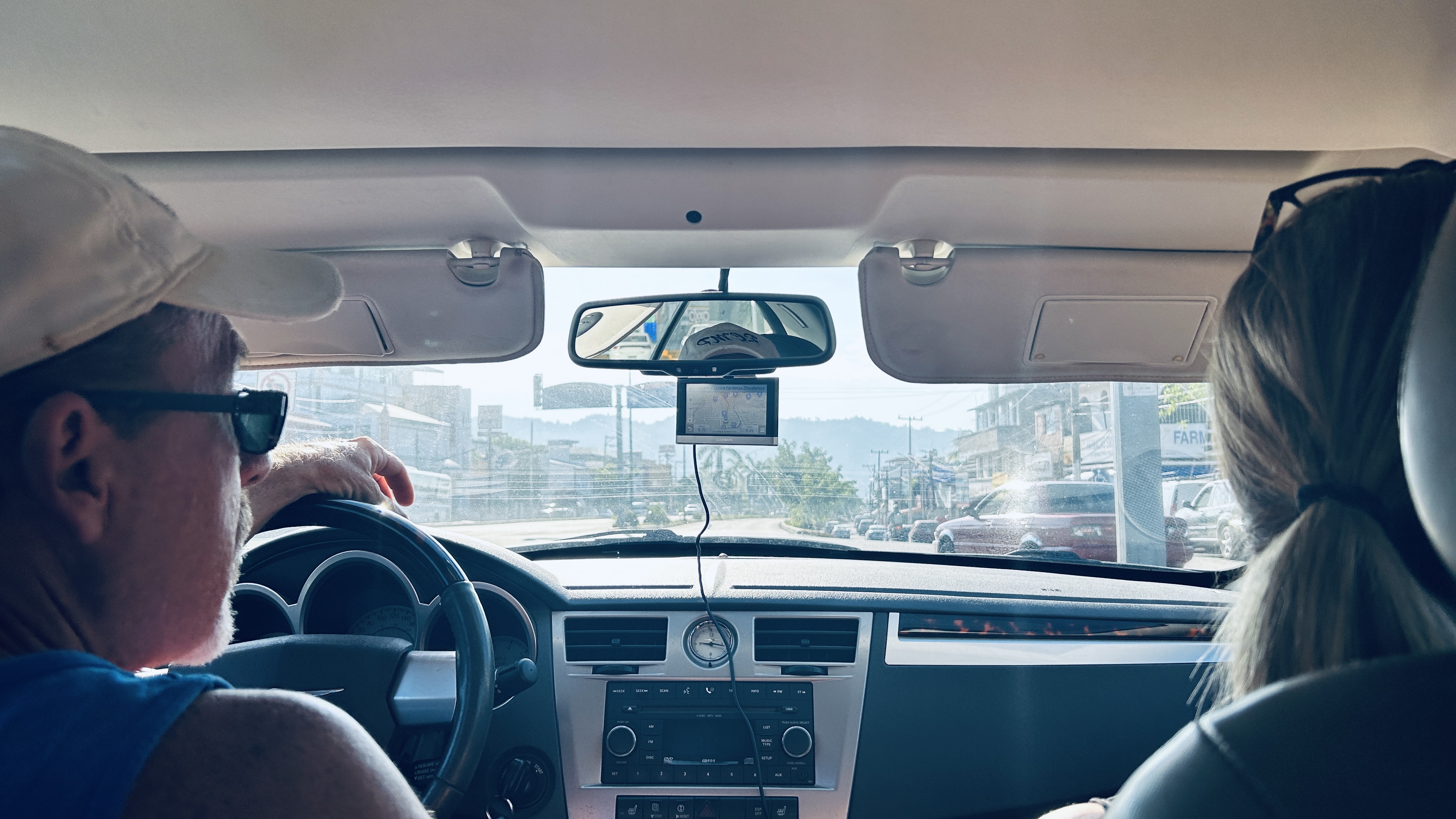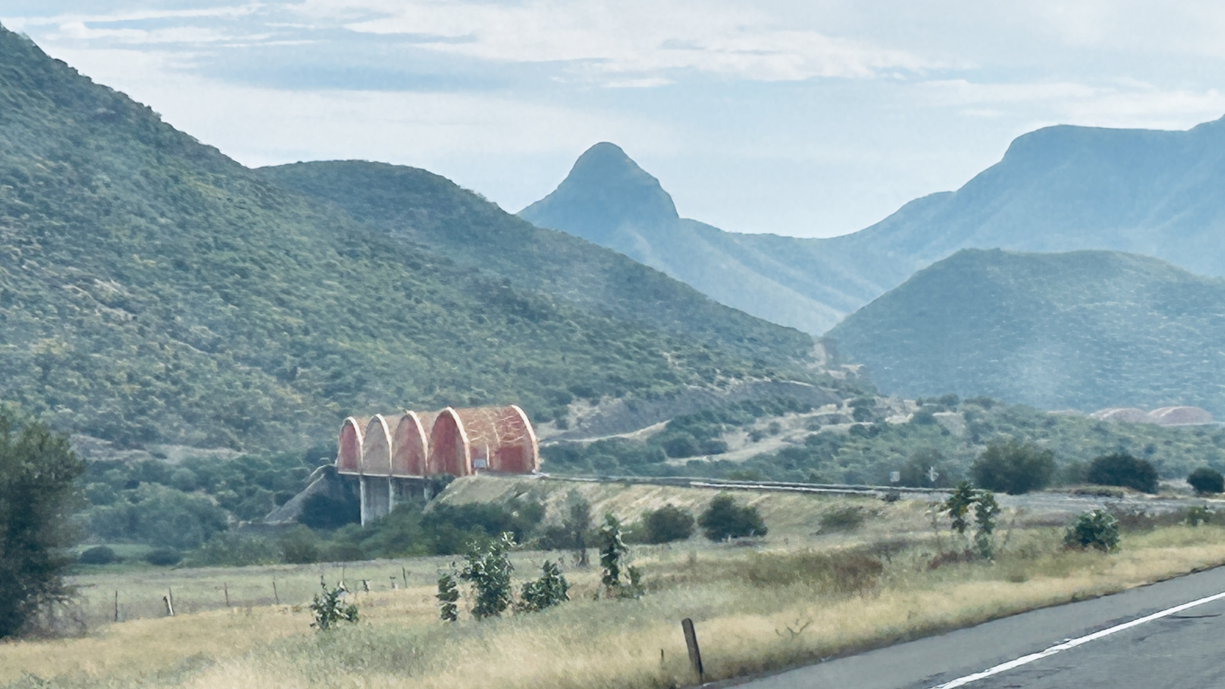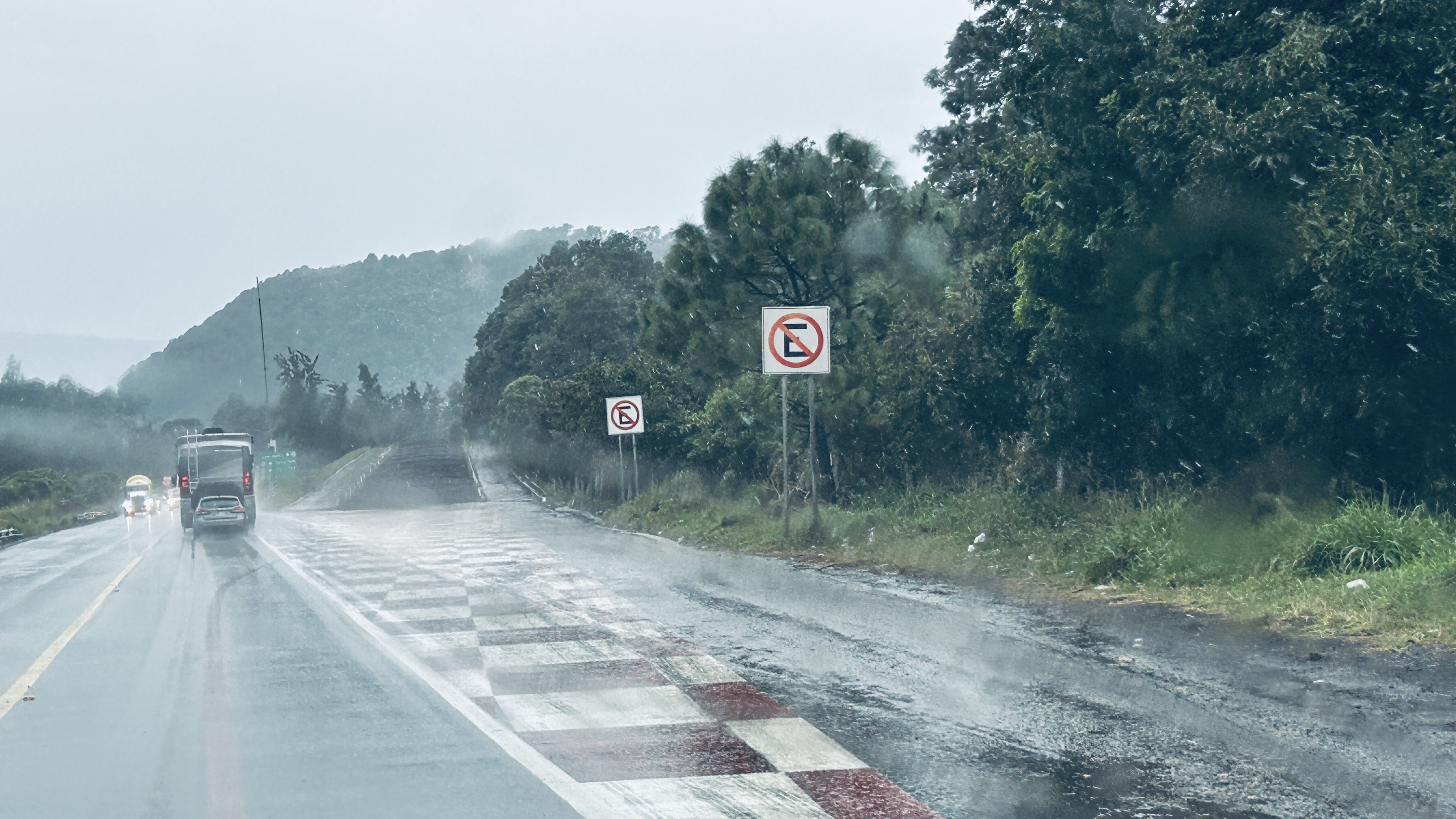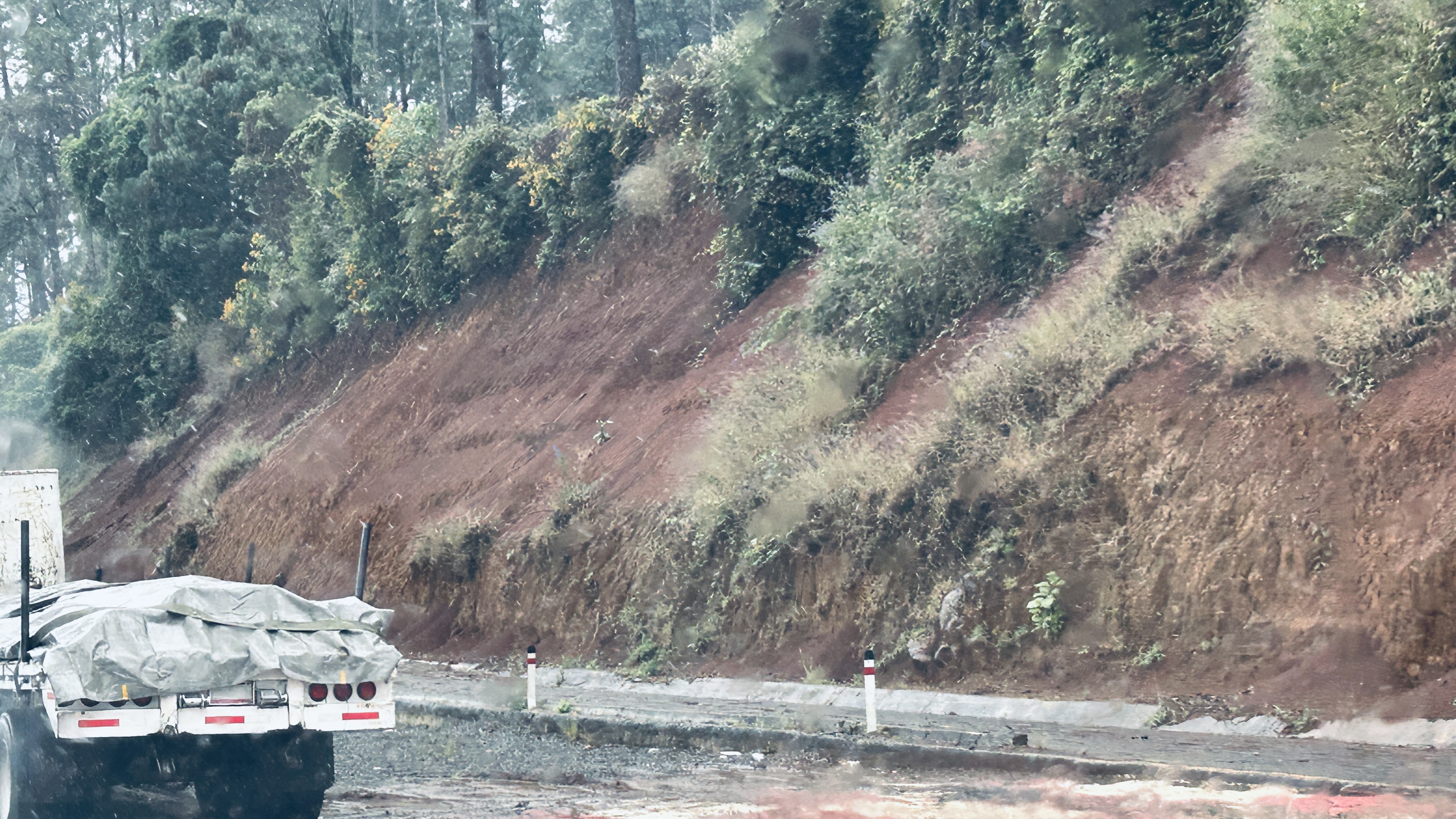 Nous avions des descentes assez impressionnantes. Il y a des panneaux de signalisation qui nous invite à tester nos freins. Nous avons d’ailleurs senti l’odeur de freins chauffés. 😨 J’ai appelé Yves, avec le walkie-talkie, pour lui demander s’il sentait cette odeur lui aussi. Heureusement, il la sentait aussi et elle ne provenait pas de ses pneus. Un peu plus loin, dans la zone de freinage, nous avons vu d’où provenait l’odeur. Je n’ai pas eu le temps de prendre une bonne photo ; on ne voit que l’arrière du camion. Un camion-remorque était arrêté à cet endroit et ses pneus fumaient. À quelques reprises, nous avons vu des voitures de police en carton ; probablement pour ralentir la vitesse en remplacement des topes (voir l’article La conduite et la sécurité routière au Mexique pour savoir de quoi je parle). 😁
