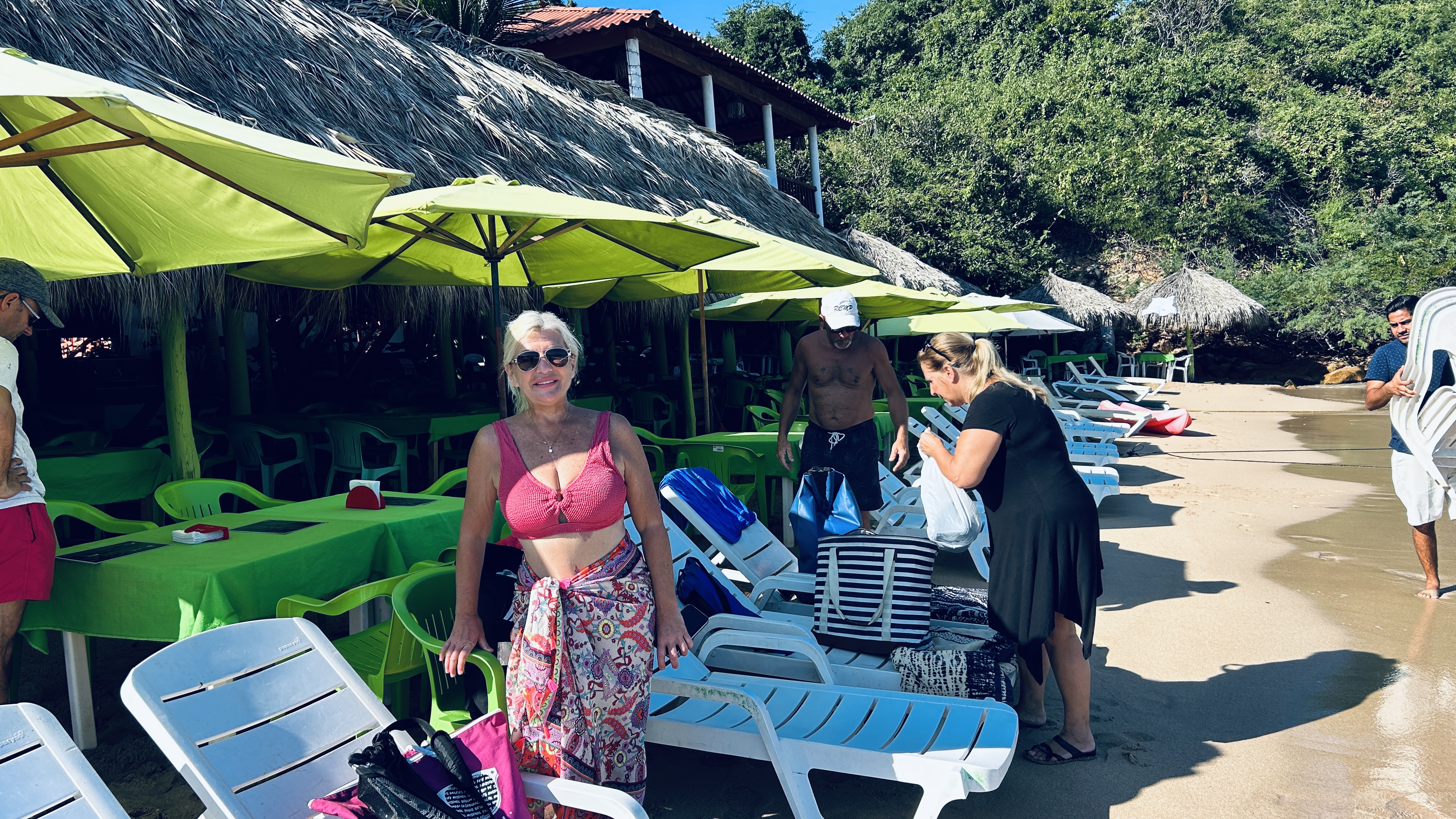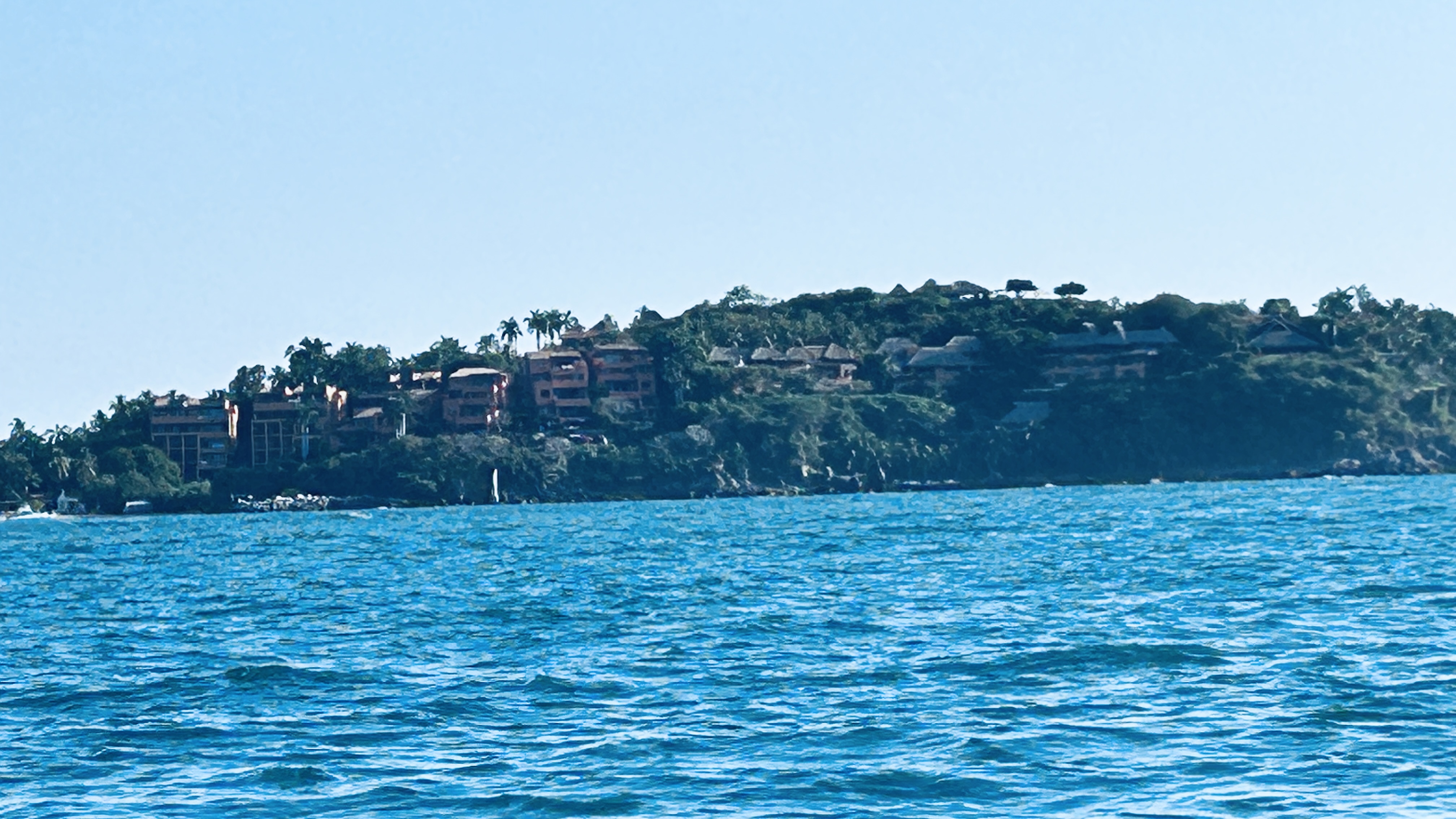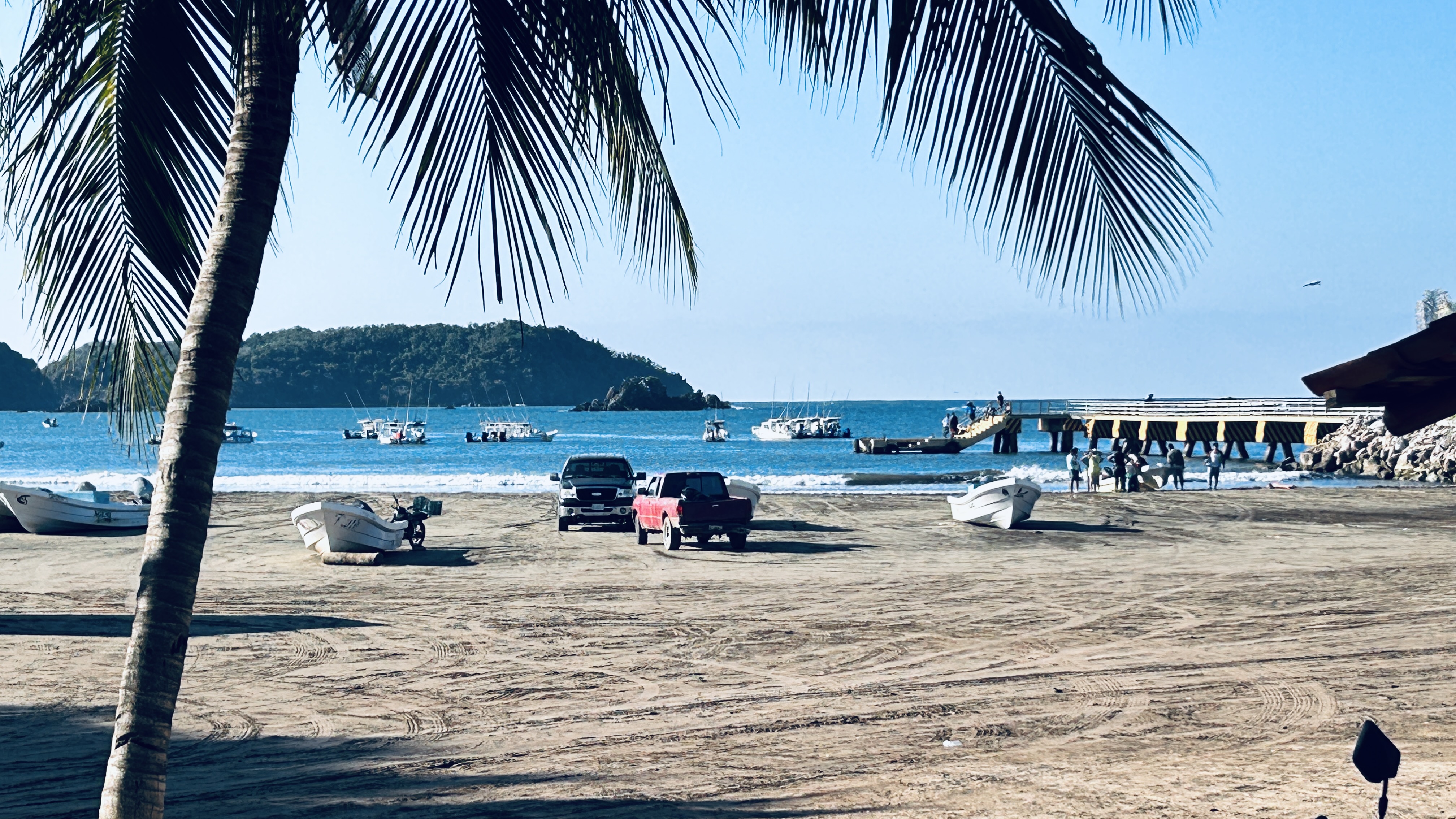 Le 14 décembre, Nancy, Yves et moi sommes allés visiter la Playa Las Gatas (plage Les chattes). J’ai eu la chance de stationner mon camion à côté de la billetterie, car un homme m’a fait une place toute spéciale. 😊 C’est en bateau à partir du port de Zihuatanejo que nous avons atteint la plage. Jocelyne et Jean ont tenté de venir en voiture ou à pied, mais n’ont pas réussi. C’est qu’ils avaient leur chariot et que ce chariot ne pouvait pas être apporté dans le bateau. Ils ont donc passé la journée sur la Playa La Ropa. C’était un lieu agréable où on avait une belle perspective de la ville de Zihautanejo. L’eau y est transparente, car le sable est fait en grande partie de coraux. Nancy et moi sommes allées marcher jusqu’à la pointe de cette plage. C’est de cet endroit que nous avions le meilleur point de vue sur Zihuatanejo. Regarde maman, des cactus-doigts que tu aimes. Ils servent de haie ici. Comme le transport en bateau cesse à 17 h, nous avons dû revenir tôt. Je serais restée plus longtemps si j’avais pu.