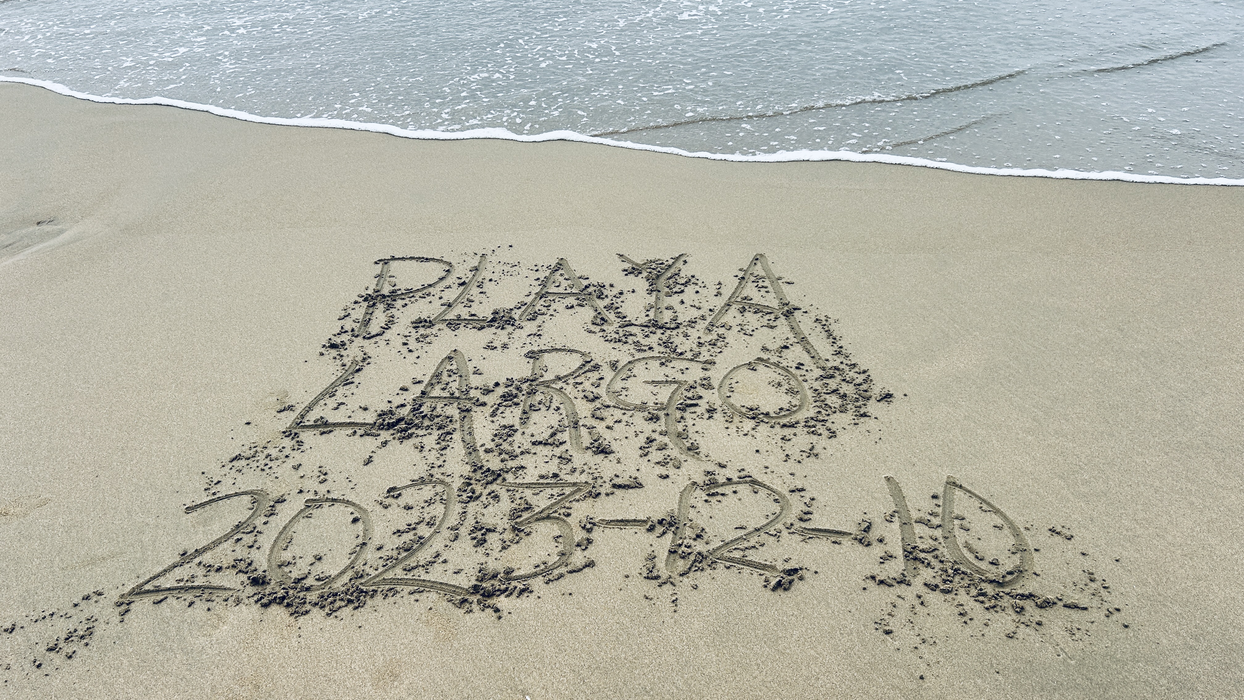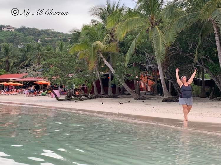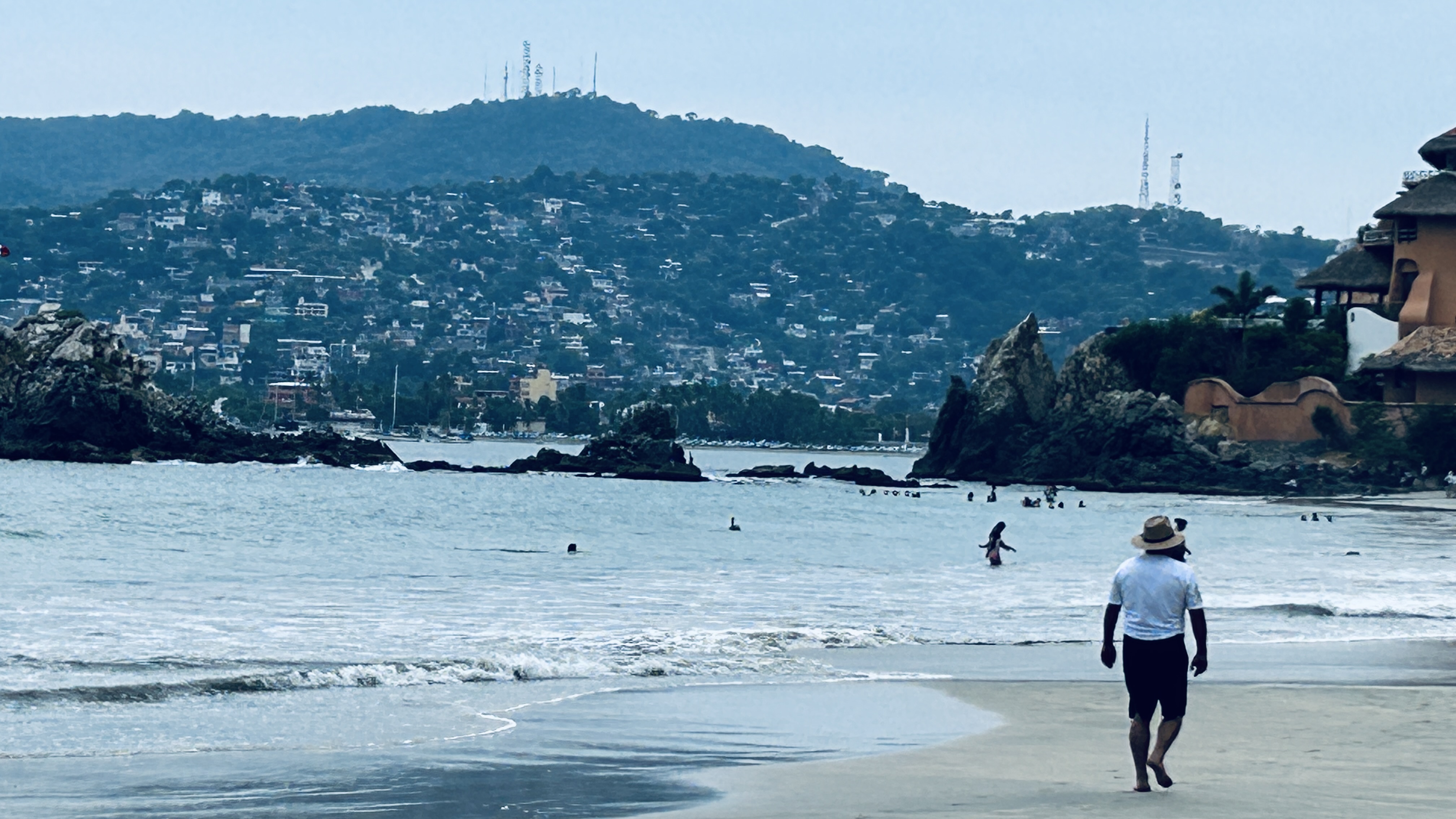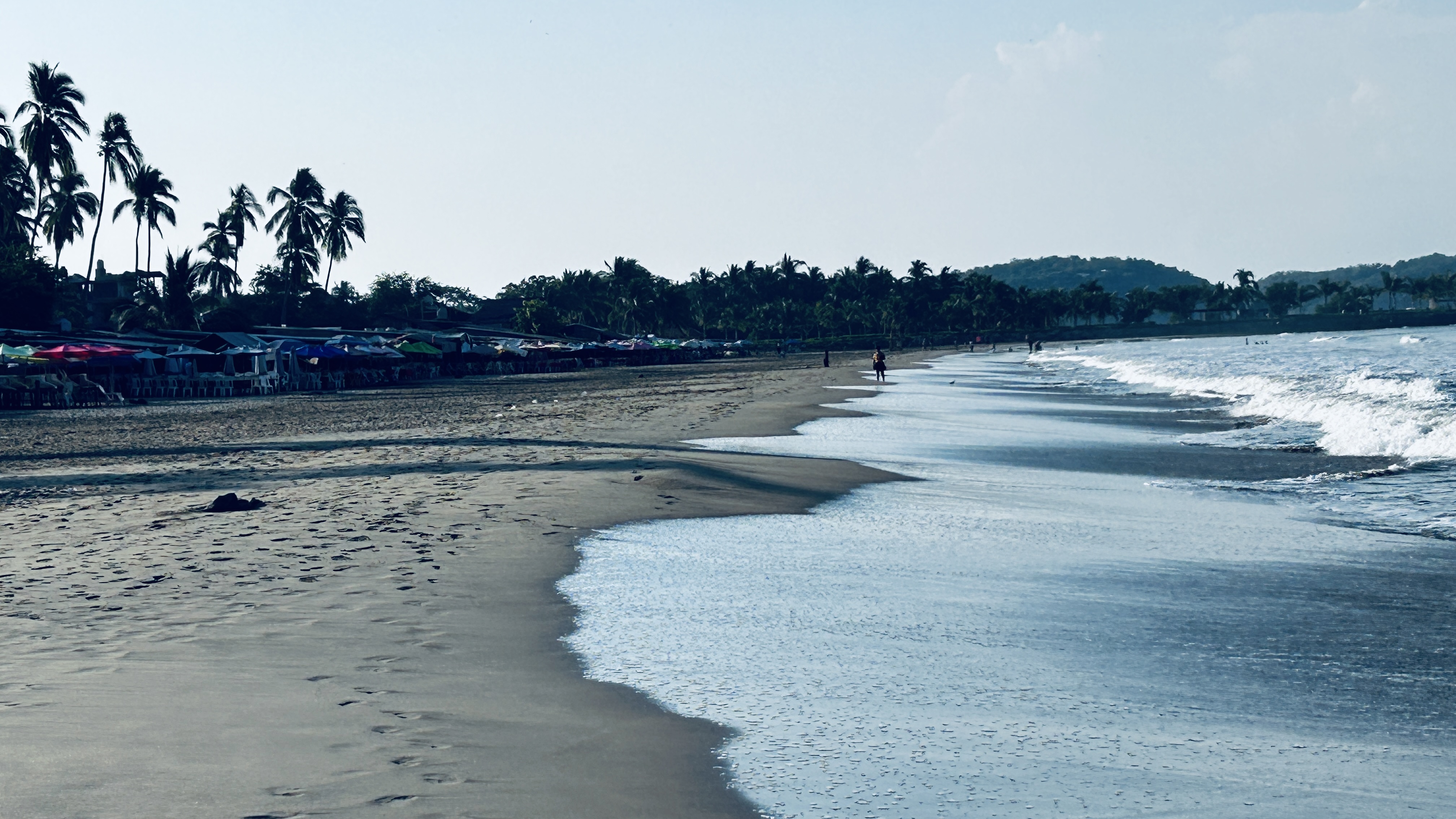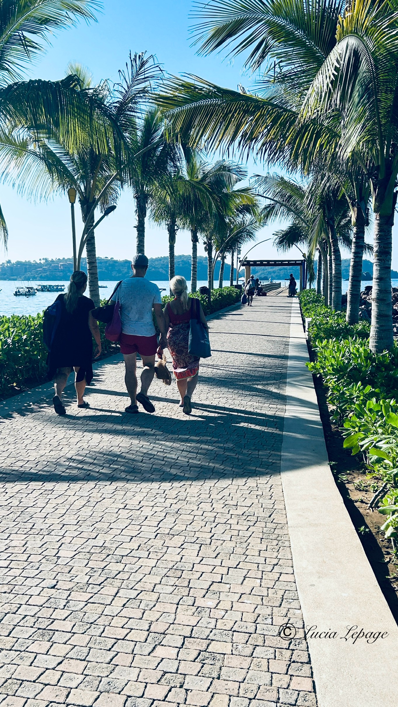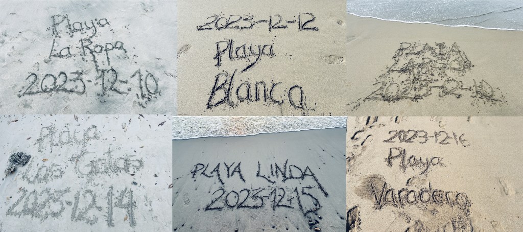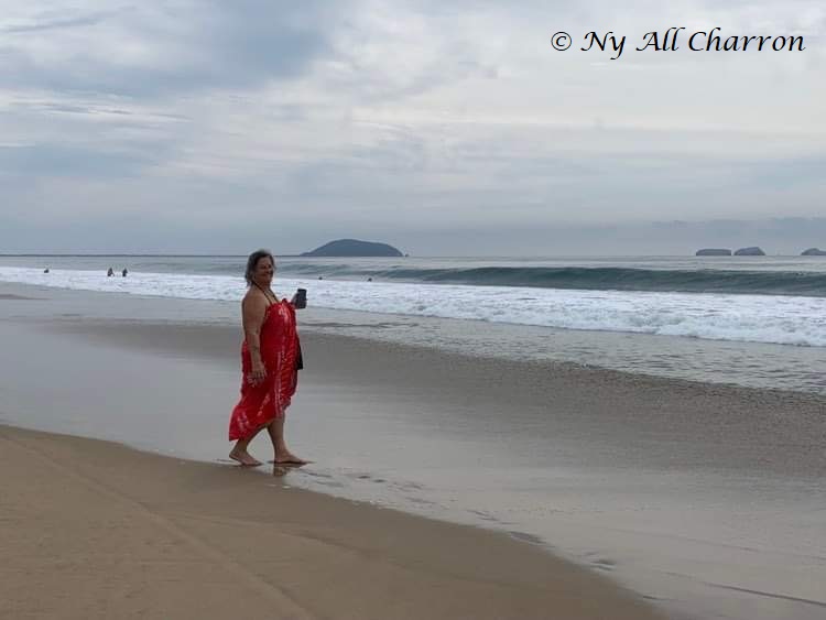 Le lendemain, j’ai fait une marche avec Jocelyne. Nous sommes retournées vers le port d’Ixtapa et le sanctuaire de crocodiles. En après-midi, je suis allée avec Nancy et Yves, à la Playa Larga (longue plage). Sur la photo, j’ai écrit Playa largo dans le sable. C’est une erreur de débutante en espagnol. 🤦🏻♀️ C’est una playa. Elle ne peut pas largo ; elle doit être larga. Que voulez-vous ? Je suis en apprentissage ! 🤷🏻♀️ Nous étions seuls dans le restaurant et la plage était presque déserte. C’était gênant. La piscine n’était pas limpide, mais nous nous y sommes trempé les pieds en attendant de commander. Nancy et moi sommes allées sur la plage, en attendant que le repas soit prêt. Nous avons pris beaucoup de photos et avons marché un peu. Ça m’a pris plusieurs tentatives pour réussir à prendre le nom de la plage en photo. Nancy a d’ailleurs filmé une de mes tentatives. J’ai aussi filmé des personnes pour montrer comment prendre les vagues et éviter d’être emporté par une vague et d’être blessé. J’ai mangé des camarones al coco (des crevettes panées à la noix de coco). Elles étaient très bonnes. Après le repas, nous sommes retournés marcher sur la plage, avec Yves, cette fois.