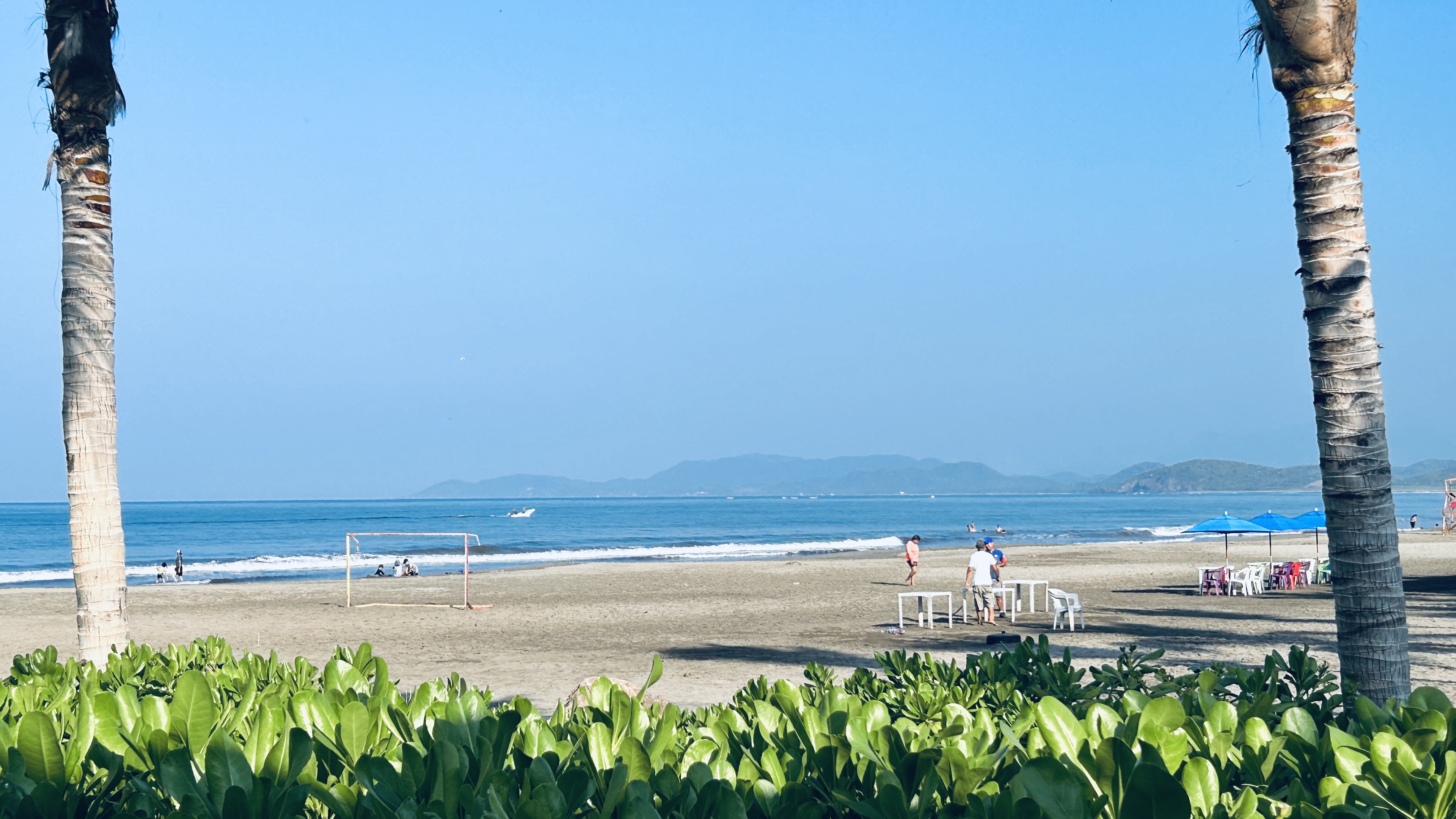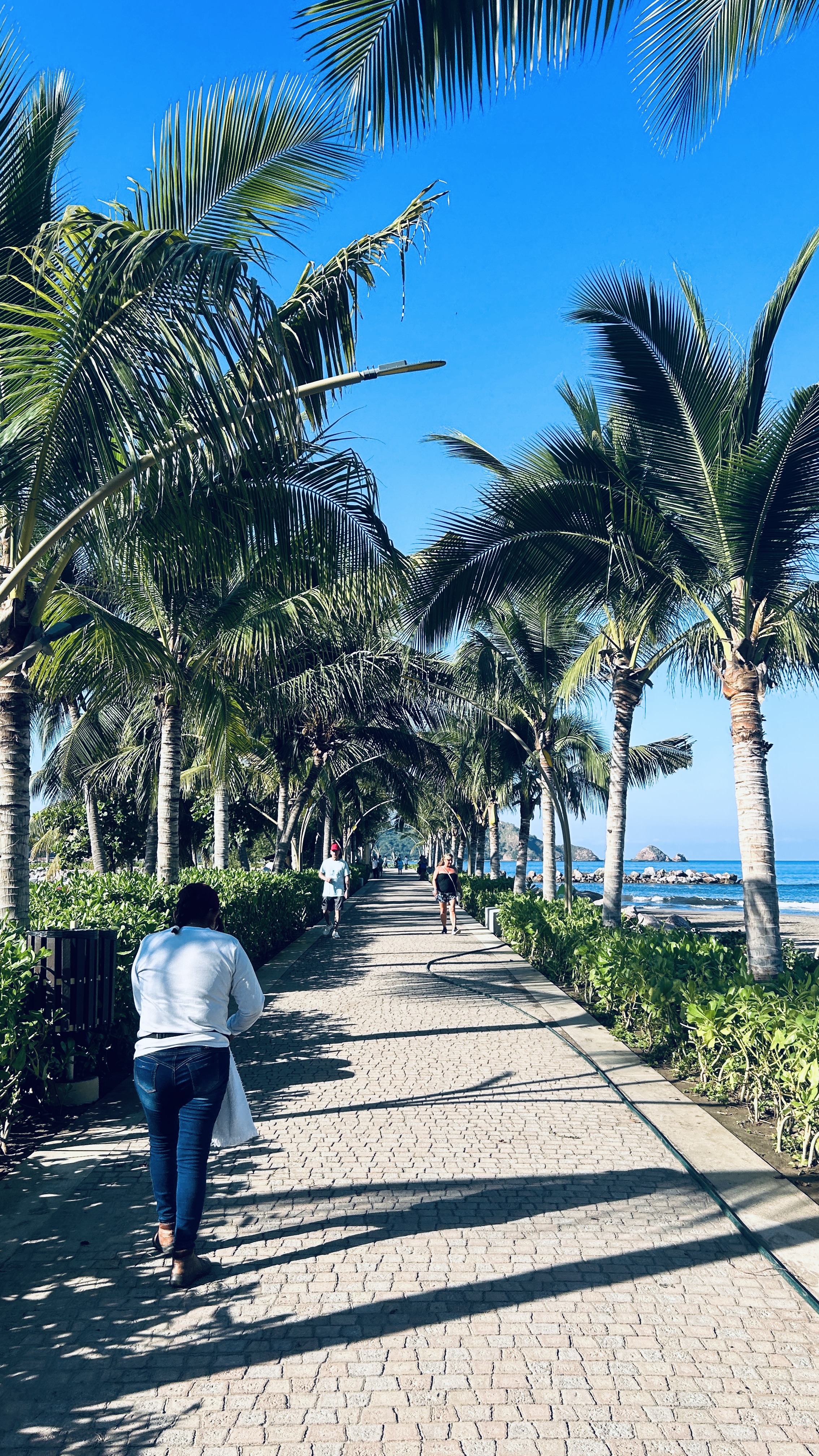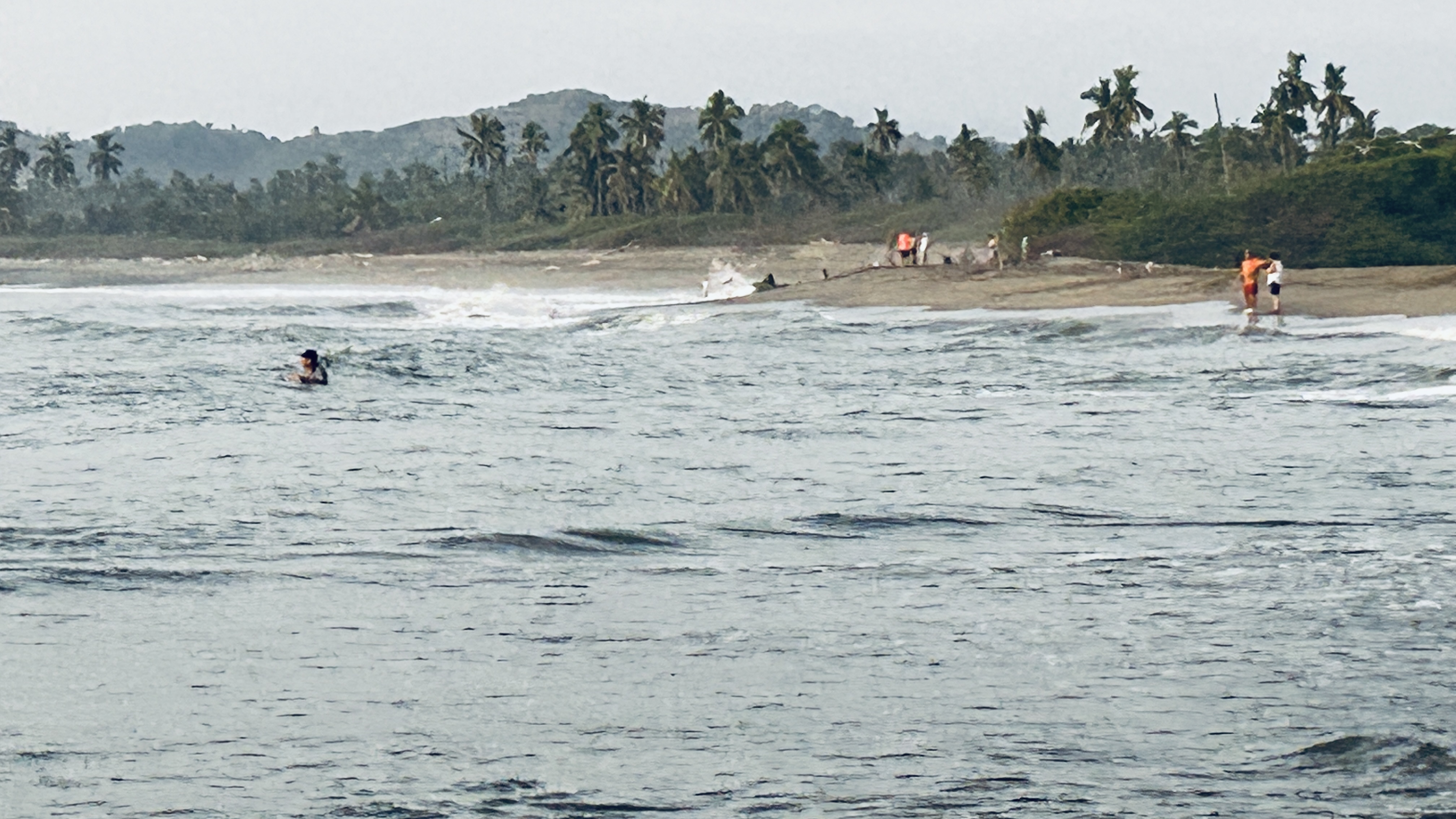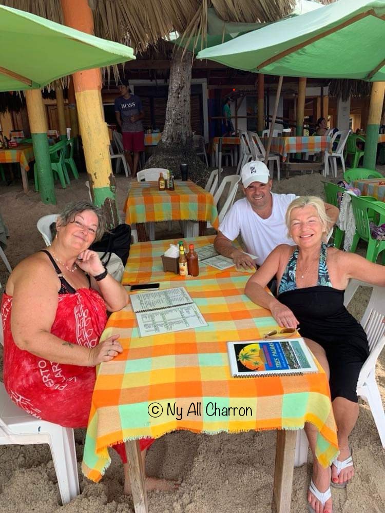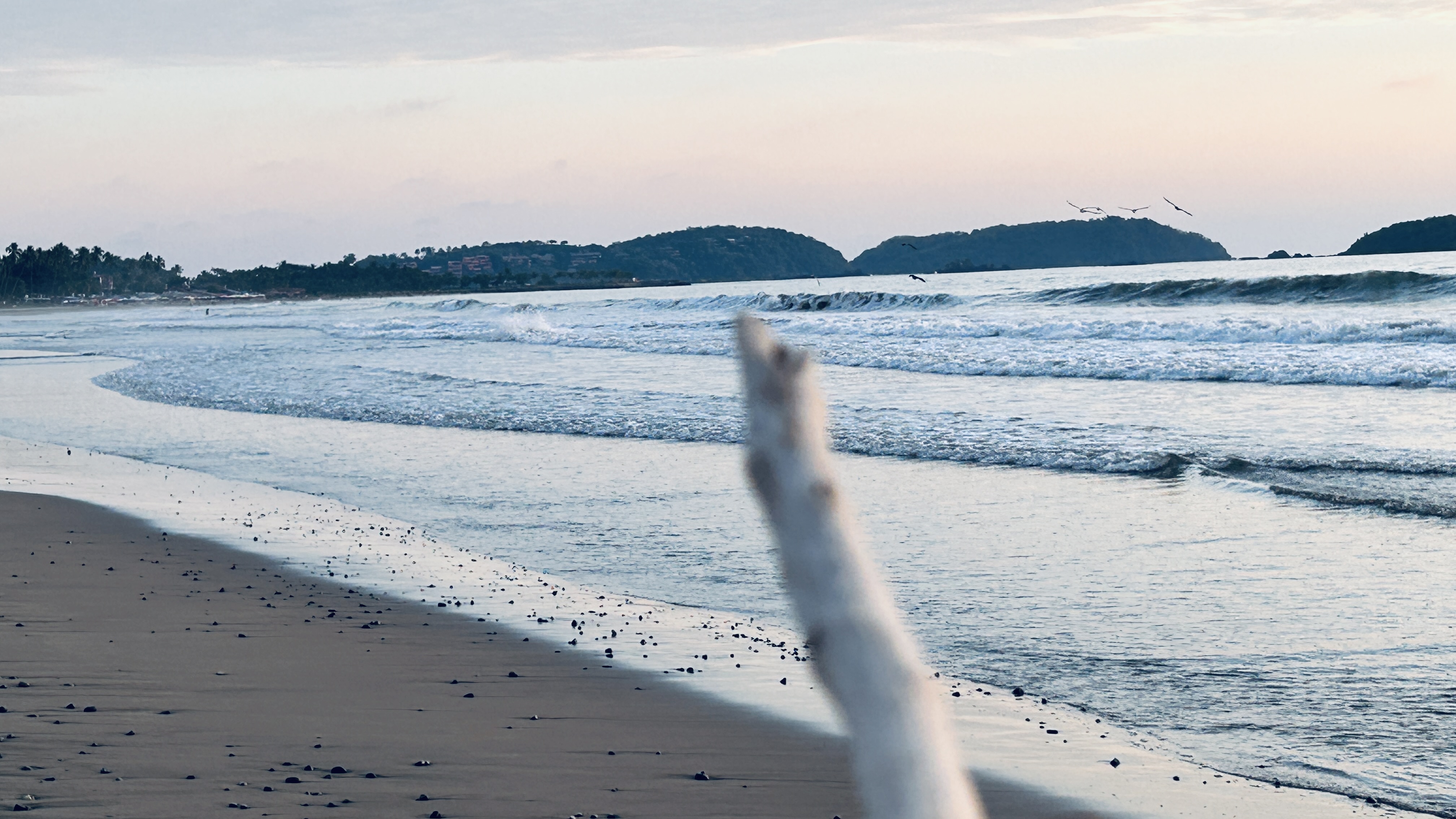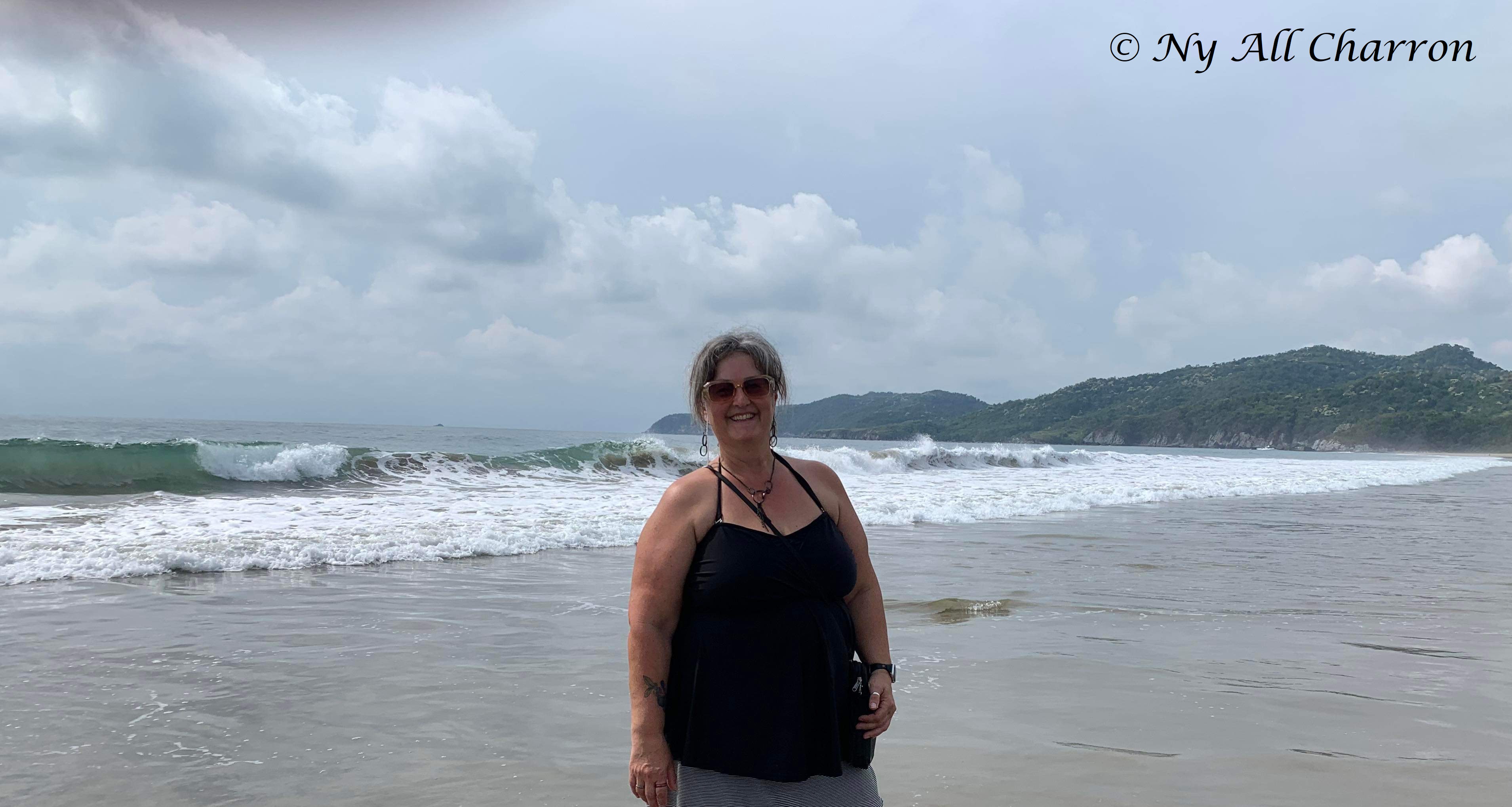 Le lendemain, j’ai fait une marche avec Jocelyne. Nous sommes retournées vers le port d’Ixtapa et le sanctuaire de crocodiles. En après-midi, je suis allée avec Nancy et Yves, à la Playa Larga (longue plage). Sur la photo, j’ai écrit Playa largo dans le sable. C’est une erreur de débutante en espagnol. 🤦🏻♀️ C’est una playa. Elle ne peut pas largo ; elle doit être larga. Que voulez-vous ? Je suis en apprentissage ! 🤷🏻♀️ Nous étions seuls dans le restaurant et la plage était presque déserte. C’était gênant. La piscine n’était pas limpide, mais nous nous y sommes trempé les pieds en attendant de commander. Nancy et moi sommes allées sur la plage, en attendant que le repas soit prêt. Nous avons pris beaucoup de photos et avons marché un peu. Ça m’a pris plusieurs tentatives pour réussir à prendre le nom de la plage en photo. Nancy a d’ailleurs filmé une de mes tentatives. J’ai aussi filmé des personnes pour montrer comment prendre les vagues et éviter d’être emporté par une vague et d’être blessé. J’ai mangé des camarones al coco (des crevettes panées à la noix de coco). Elles étaient très bonnes. Après le repas, nous sommes retournés marcher sur la plage, avec Yves, cette fois.