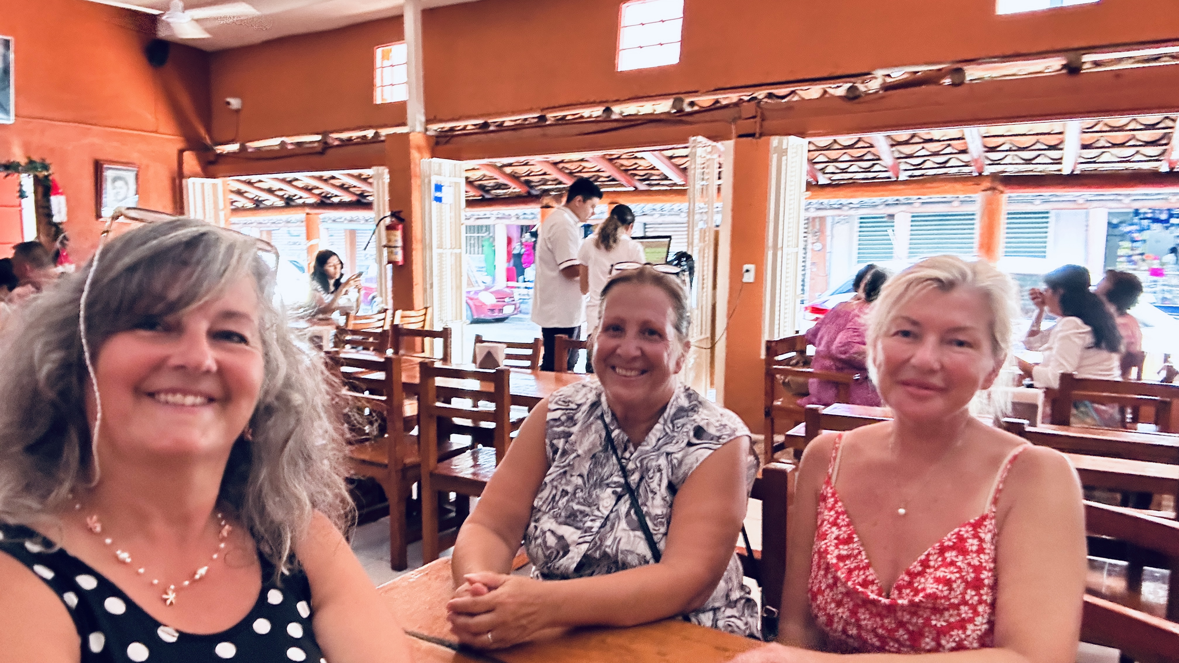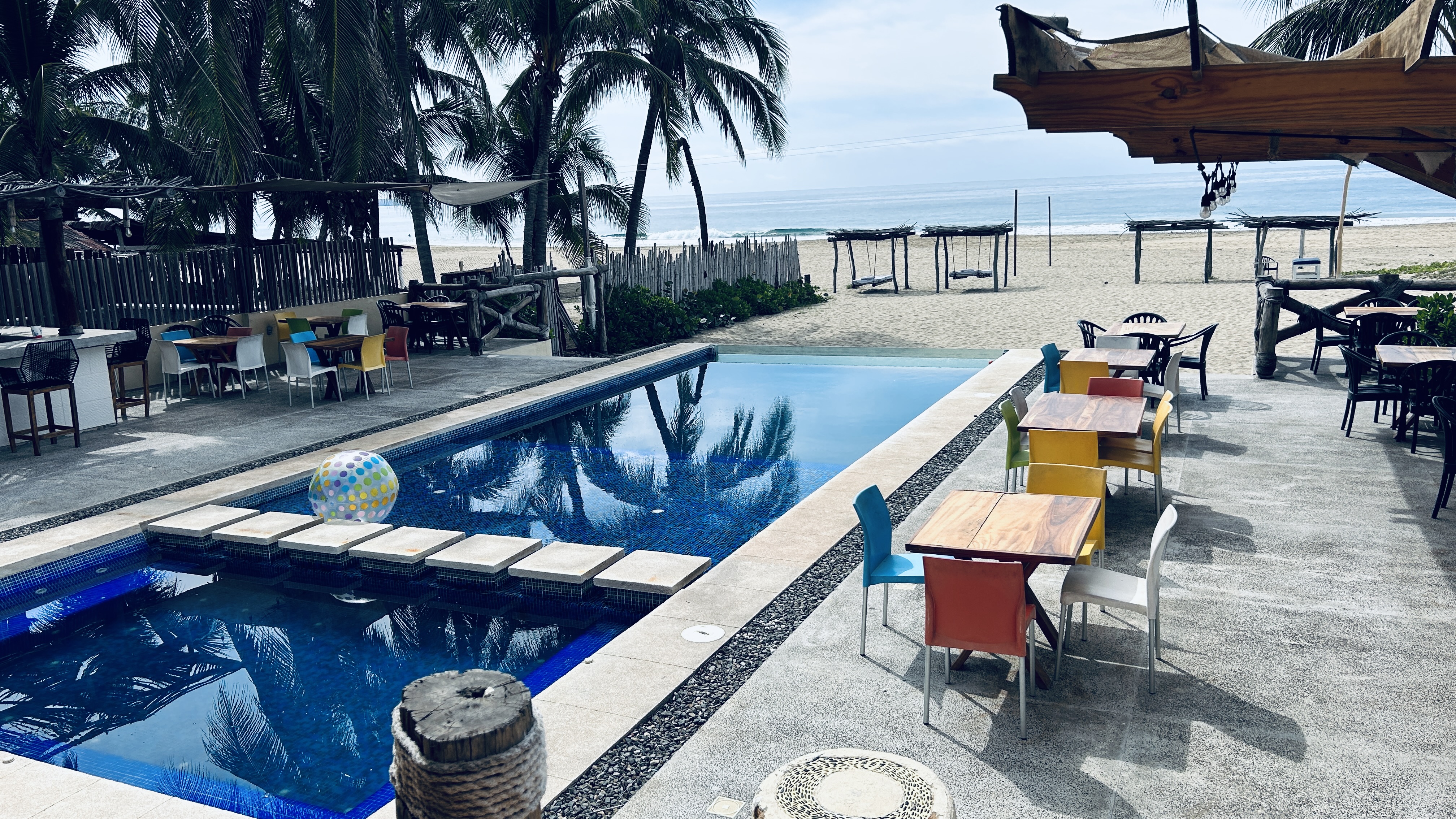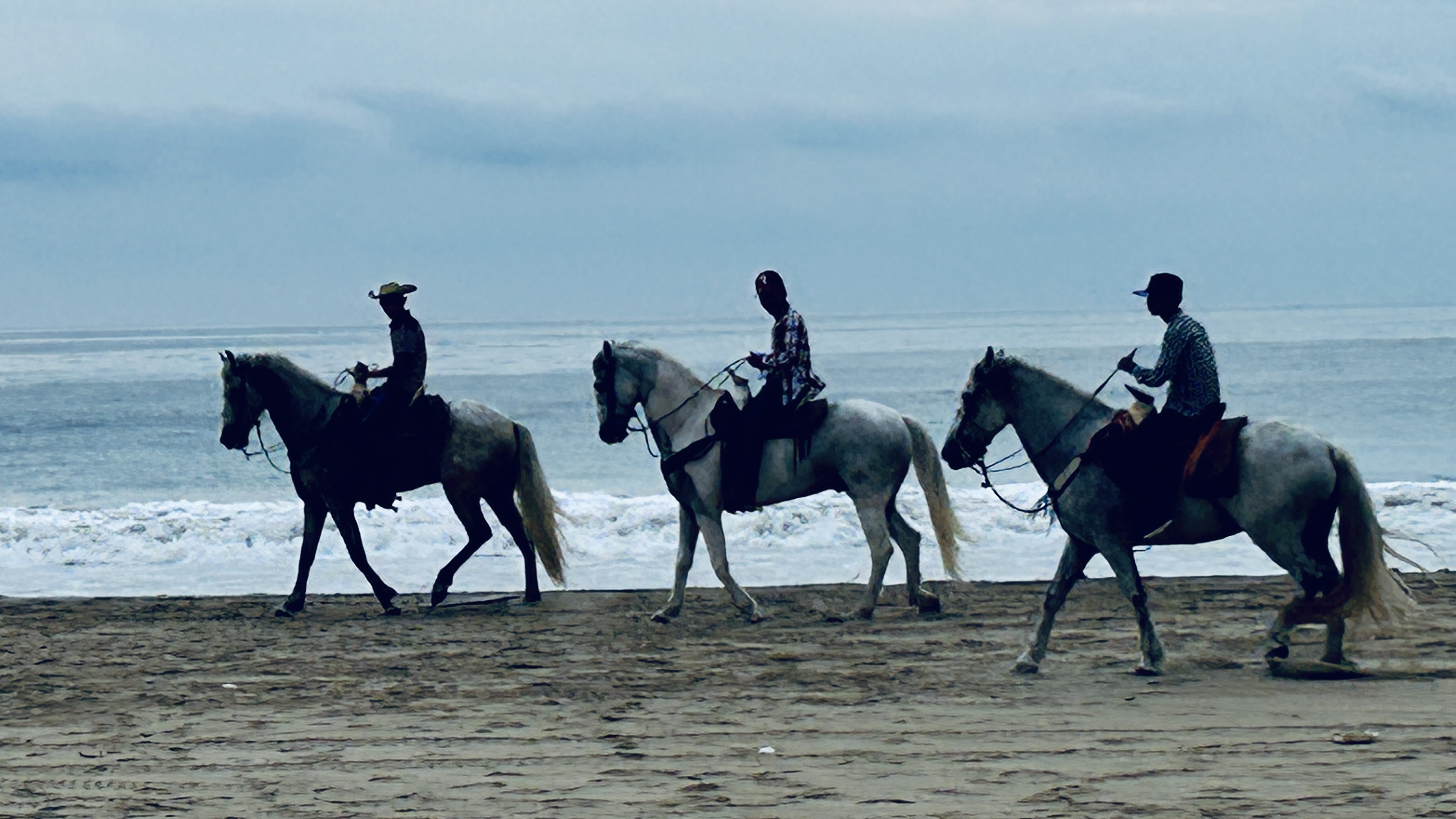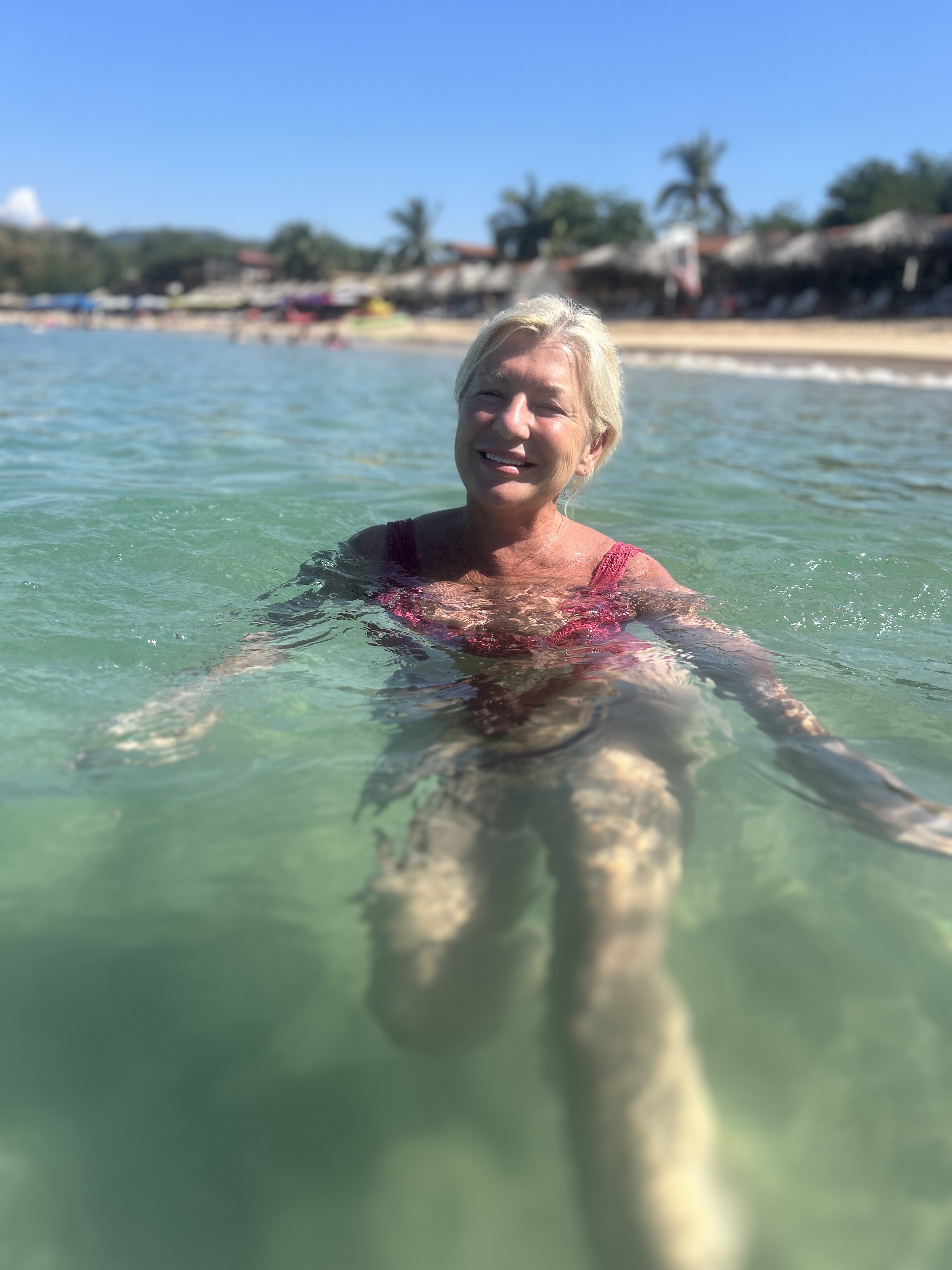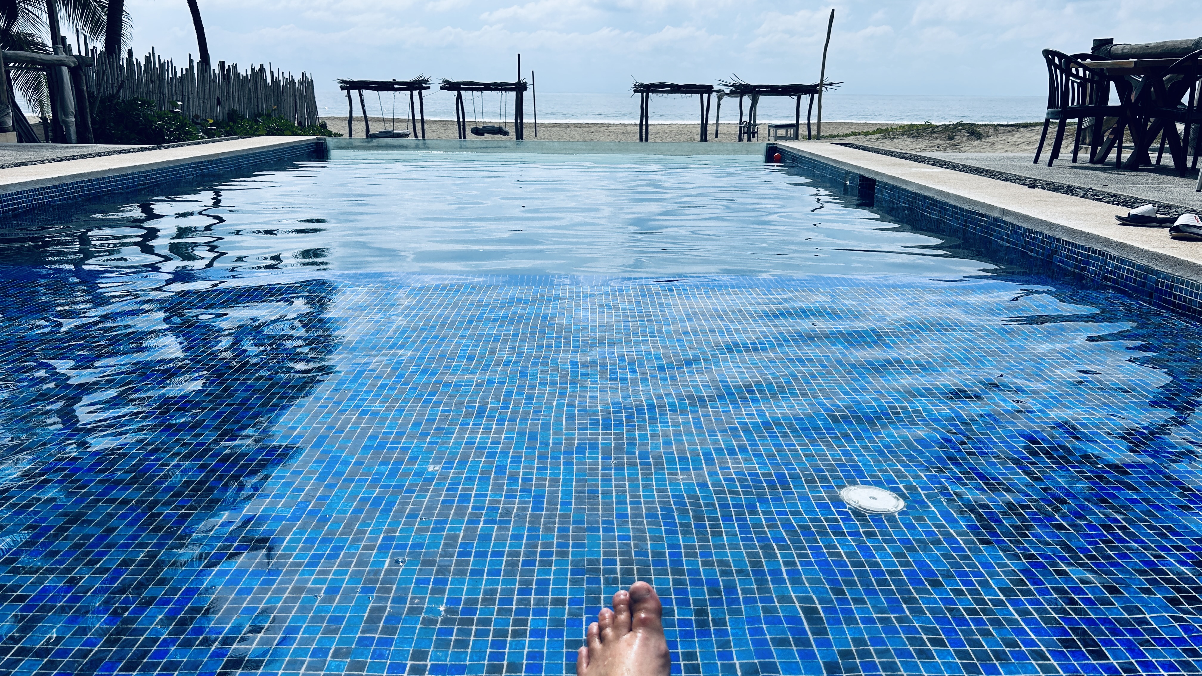 Le lendemain, j’ai fait une marche avec Jocelyne. Nous sommes retournées vers le port d’Ixtapa et le sanctuaire de crocodiles. En après-midi, je suis allée avec Nancy et Yves, à la Playa Larga (longue plage). Sur la photo, j’ai écrit Playa largo dans le sable. C’est une erreur de débutante en espagnol. 🤦🏻♀️ C’est una playa. Elle ne peut pas largo ; elle doit être larga. Que voulez-vous ? Je suis en apprentissage ! 🤷🏻♀️ Nous étions seuls dans le restaurant et la plage était presque déserte. C’était gênant. La piscine n’était pas limpide, mais nous nous y sommes trempé les pieds en attendant de commander. Nancy et moi sommes allées sur la plage, en attendant que le repas soit prêt. Nous avons pris beaucoup de photos et avons marché un peu. Ça m’a pris plusieurs tentatives pour réussir à prendre le nom de la plage en photo. Nancy a d’ailleurs filmé une de mes tentatives. J’ai aussi filmé des personnes pour montrer comment prendre les vagues et éviter d’être emporté par une vague et d’être blessé. J’ai mangé des camarones al coco (des crevettes panées à la noix de coco). Elles étaient très bonnes. Après le repas, nous sommes retournés marcher sur la plage, avec Yves, cette fois.