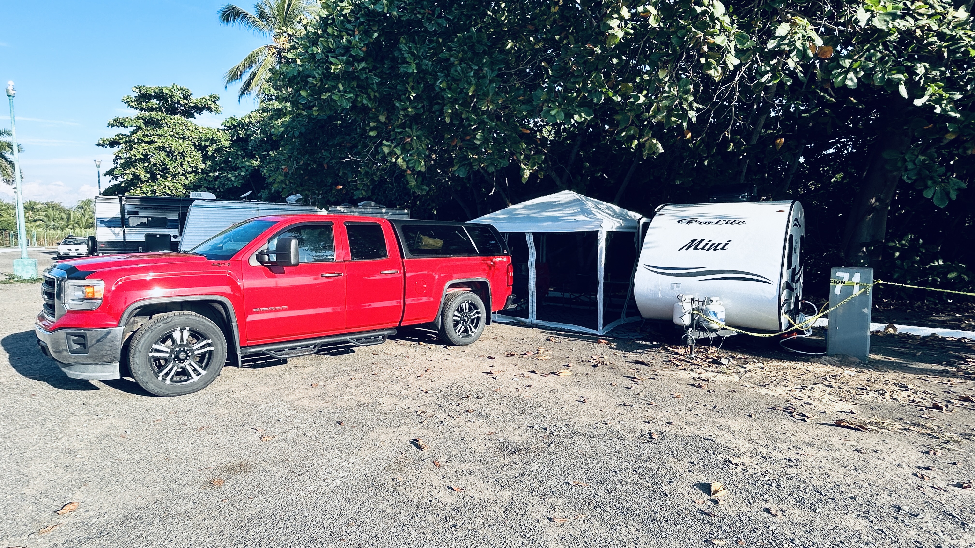 À notre arrivée au Playa Linda RV park, le 7 décembre à 16 h 16, Jocelyne était là pour nous accueillir. 🥰 J’avais avisé Jean de notre arrivée environ 20 minutes avant. Elle m’a montré mon site et j’ai fait une installation temporaire, car l’électricité de mon site était défectueuse. Lorsque je branchais ma fiche, ça faisait des flammèches… juste à côté de ma sortie de gaz propane. 😱 Finalement, ce problème a été réglé assez rapidement. J’ai donc terminé mon installation, pour réaliser qu’il n’y avait pas de tuyau pour les égouts. Je suis donc retournée voir le responsable pour l’en aviser. Je lui ai mentionné que j’étais prête à demeurer sur le même site, s’il réduisait le prix de location. Il m’a répondu que le prix était en fonction de 2 services ; j’ai immédiatement réfuté cette assertion. Finalement, il est venu avec moi pour trouver les égouts. Ils étaient remplis de sable et sans savoir où ils se trouvaient, il était impossible de trouver. Il y avait une grosse roche qui bloquait celui de mon site. Les égouts des sites sur la même rangée que moi étaient dans le même état. Le lendemain matin, le 8 décembre, le tuyau d’égout de mon site était réparé. Dans les jours suivants, ils ont aussi débouché ceux des autres sites. Dans la nuit du 9 décembre, j’ai réalisé que le robinet qui alimentait ma roulotte en eau fuyait. Que dis-je, il ne fuyait pas, il débordait. Bref, il était brisé. J’ai avisé le gardien qui passait justement par là et j’ai fermé le robinet. Quand je suis allée le signaler au bureau le lendemain, vers 9 h, c’était déjà réparé. Trois services sur trois ont dû être réparés, car ils n’étaient pas en fonction. J’ai remarqué ensuite que tous les robinets de ma rangée avaient été changés.