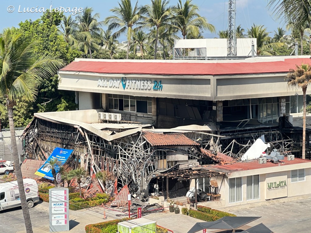 En allant prendre l’autobus pour revenir à l’hôtel, j’ai photographié le OXXO Los Mangos qui a été incendié par les membres du cartel. C’est absolument désolant à voir. Quatre commerces ont été touchés par cet incendie. Le petit café Mulata venait d’ouvrir. Le gym All Day Fitness de l’étage supérieur devait ouvrir la semaine prochaine, mais ça ne sera finalement pas avant un mois. Le magasin de meubles RAC La mejor manera de comprar voisin du OXXO a aussi été endommagé et il a été pillé après l’incendie. L’odeur de suie qui se dégage de cet endroit est écœurante. C’est comme si on avait mangé de la suie.