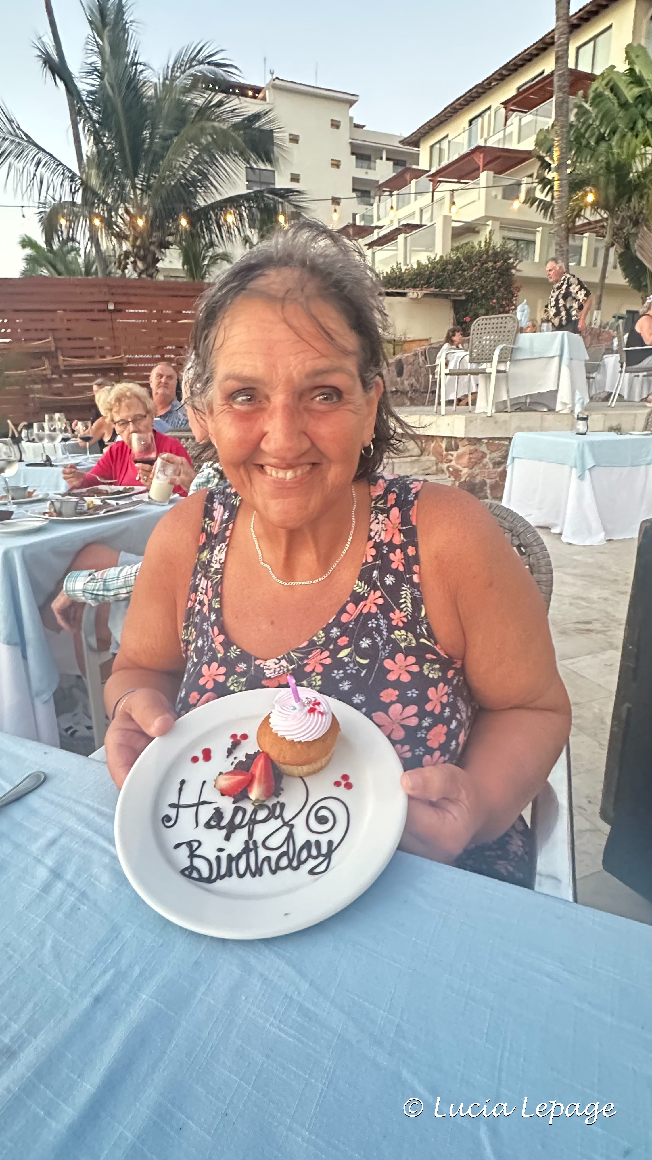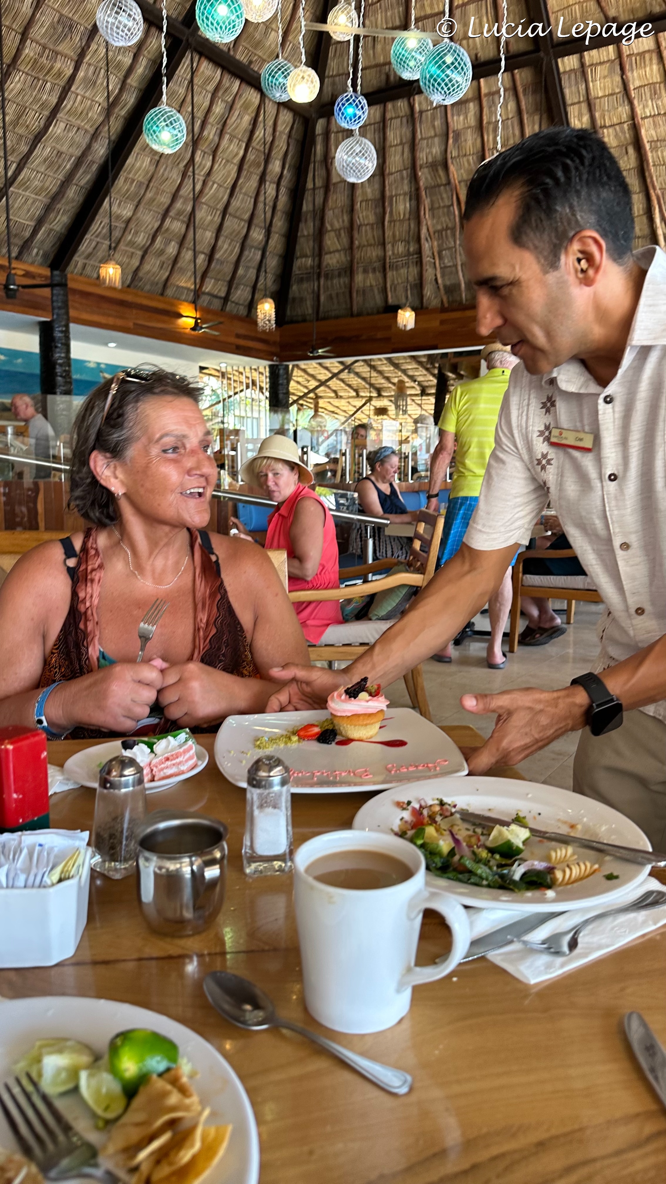 En attendant le dessert, j’ai voulu changer de place avec Lynda pour voir venir les serveurs avec le dessert de fête et, ainsi, pouvoir filmer le tout. Comme je me levais, j’ai vu le gâteau sur le chariot des boissons qui arrivait à notre hauteur. Je me suis rassise immédiatement. En même temps, le serveur me demandait ce que je faisais là, car il croyait que nous partions. Nous avons bien ri de cette situation et de nos réactions à tous. J’ai été capable de filmer pendant qu’ils chantaient. J’étais très satisfaite d’avoir pu offrir ce petit moment à Lynda.