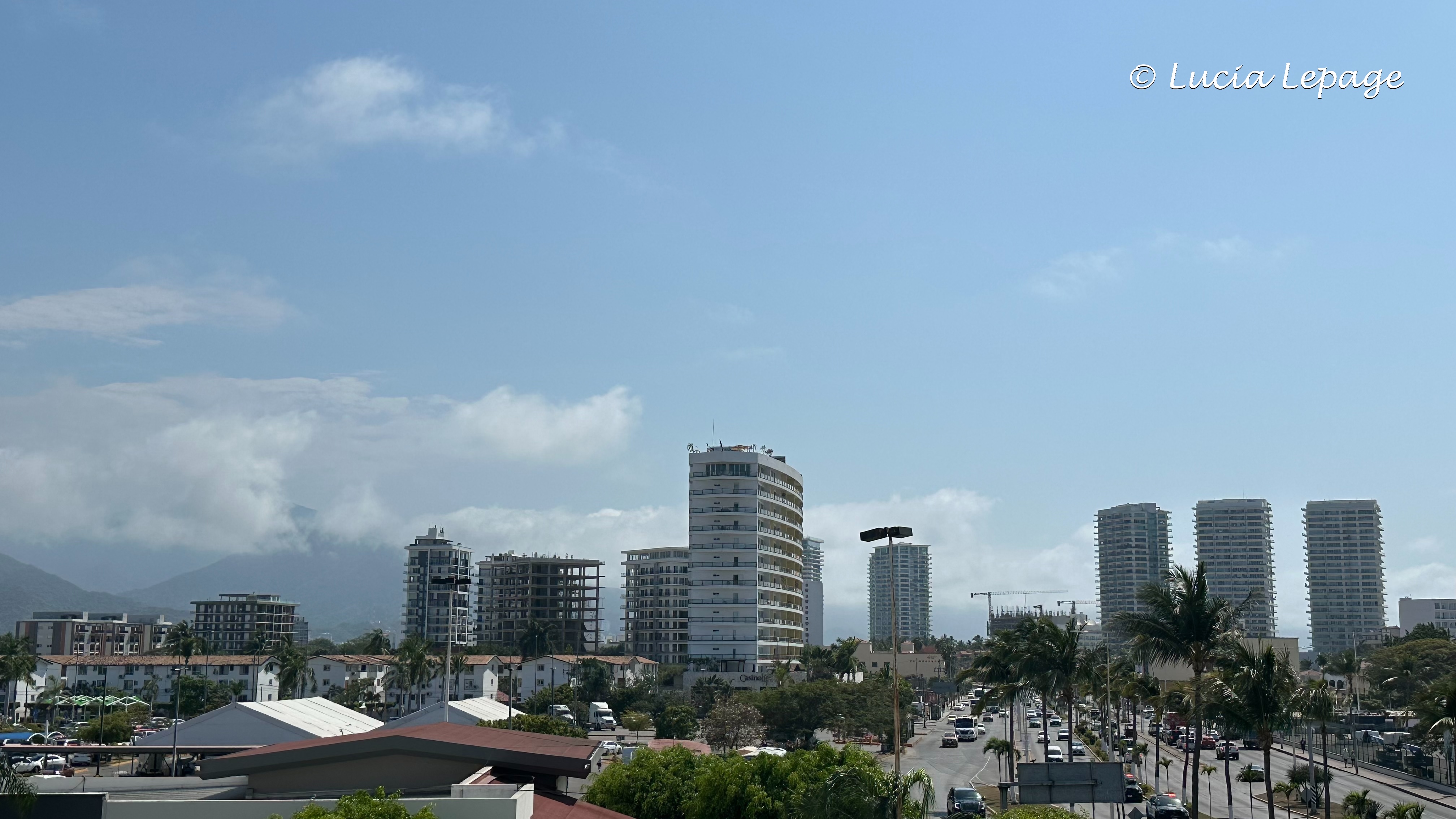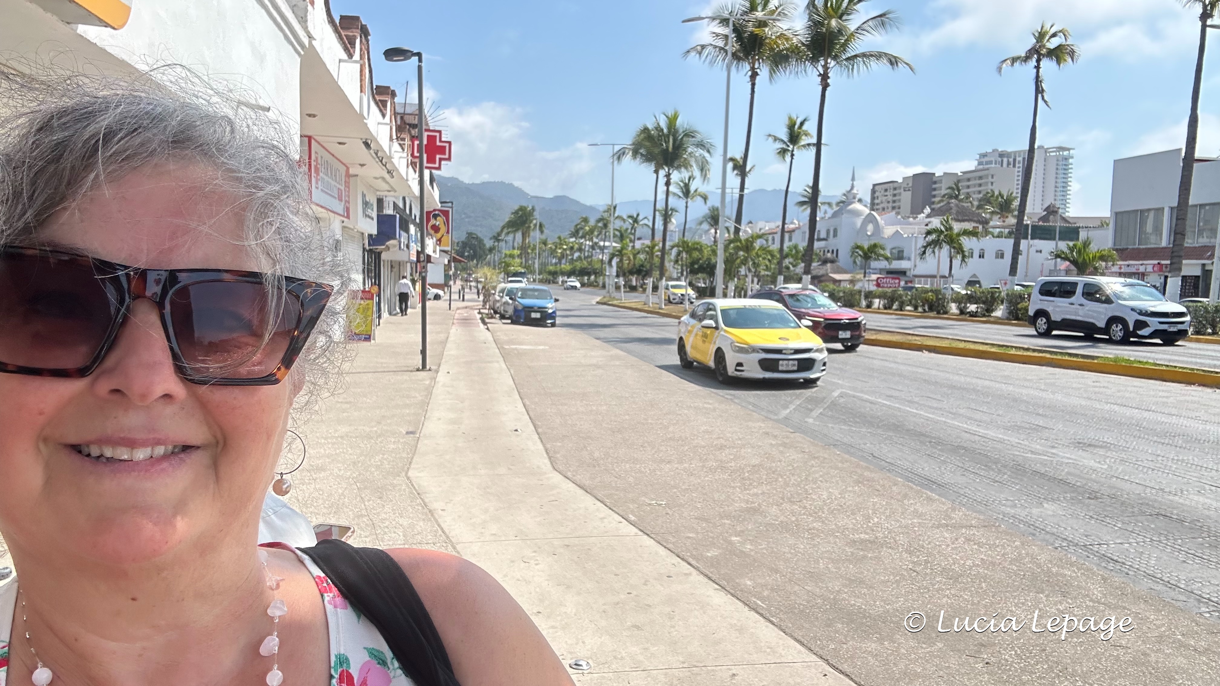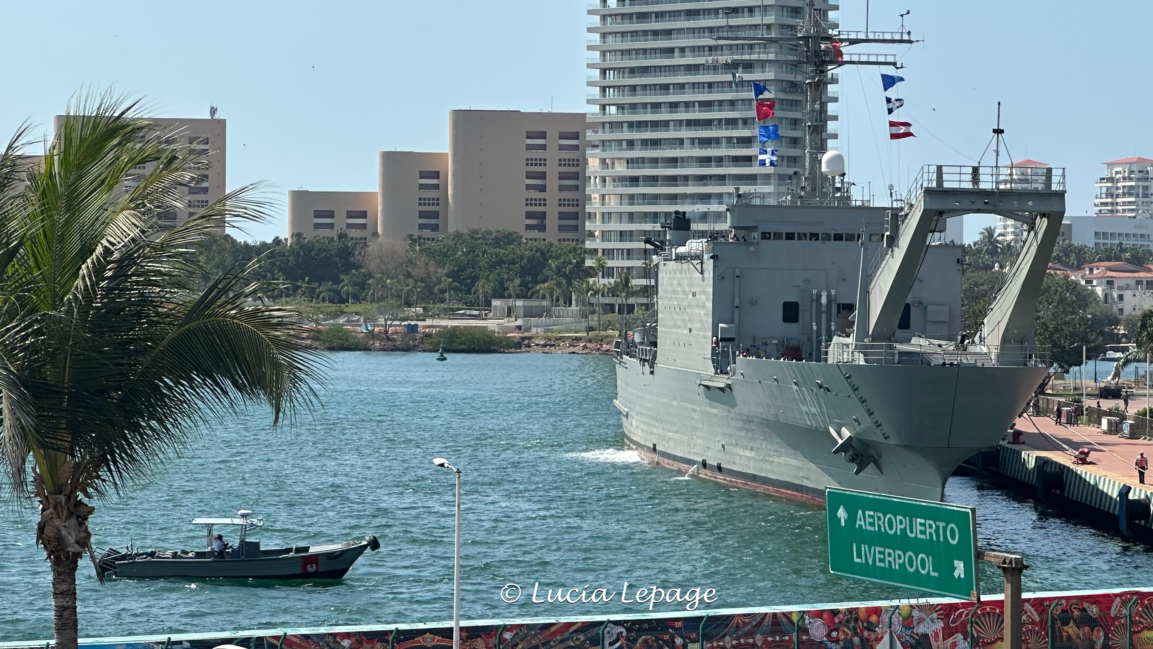 Le gouvernement mexicain a levé le code rouge, en matinée. Lynda et moi avons décidé d’aller nous promener en ville, en après-midi. Mon premier constat en arrivant sur la route 200 est qu’elle est étrangement désertée. Nous sommes allées prendre des photos du bateau de l’armée, à partir des Galerías Vallarta ainsi nous avions une vue plus globale du port. Nous sommes allées nous chercher des pesos, à la Banjercito, près du port.