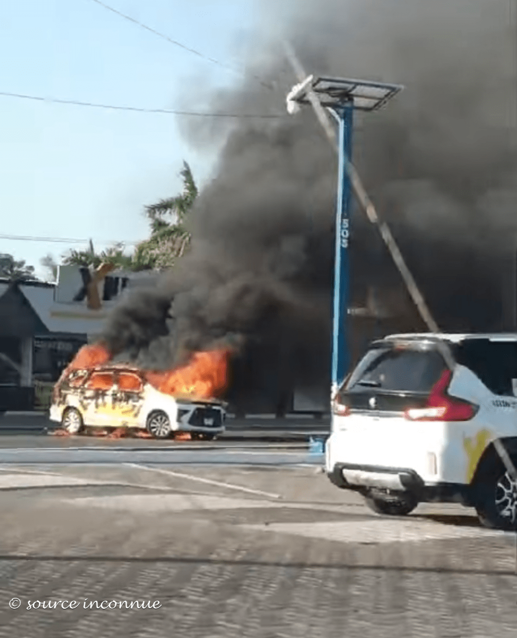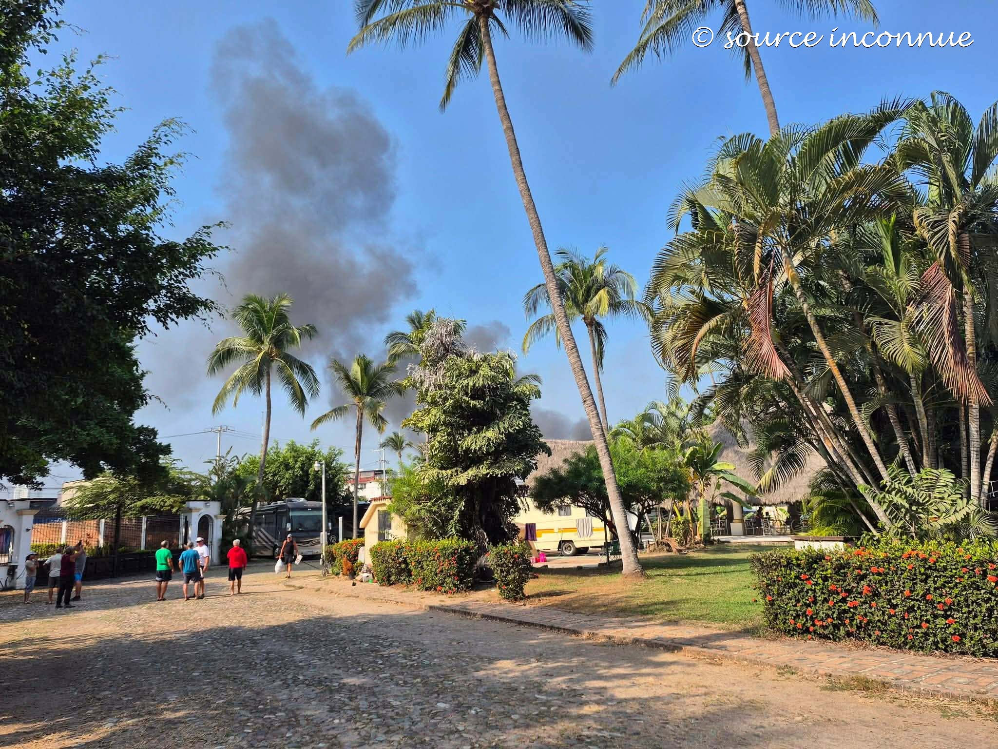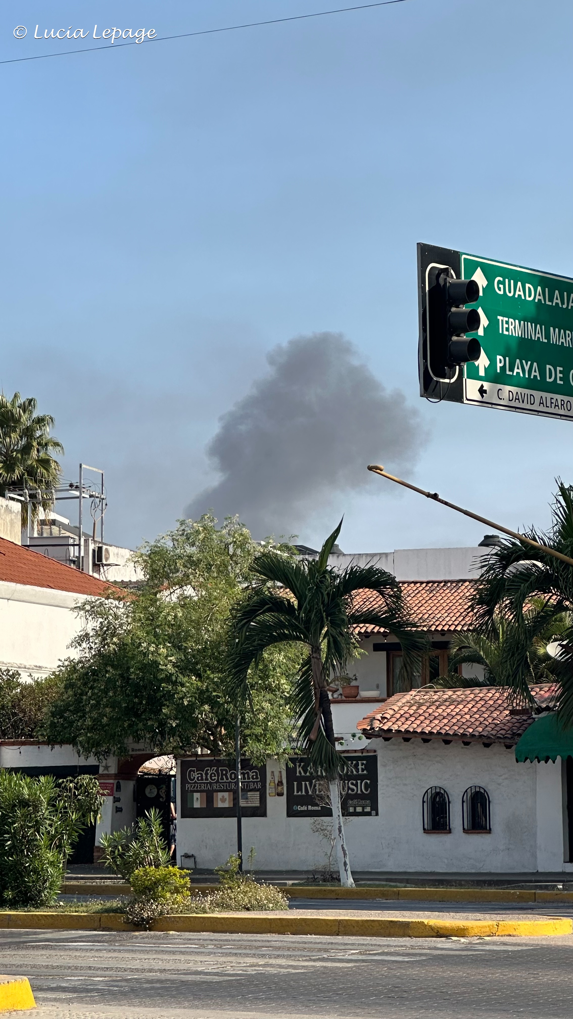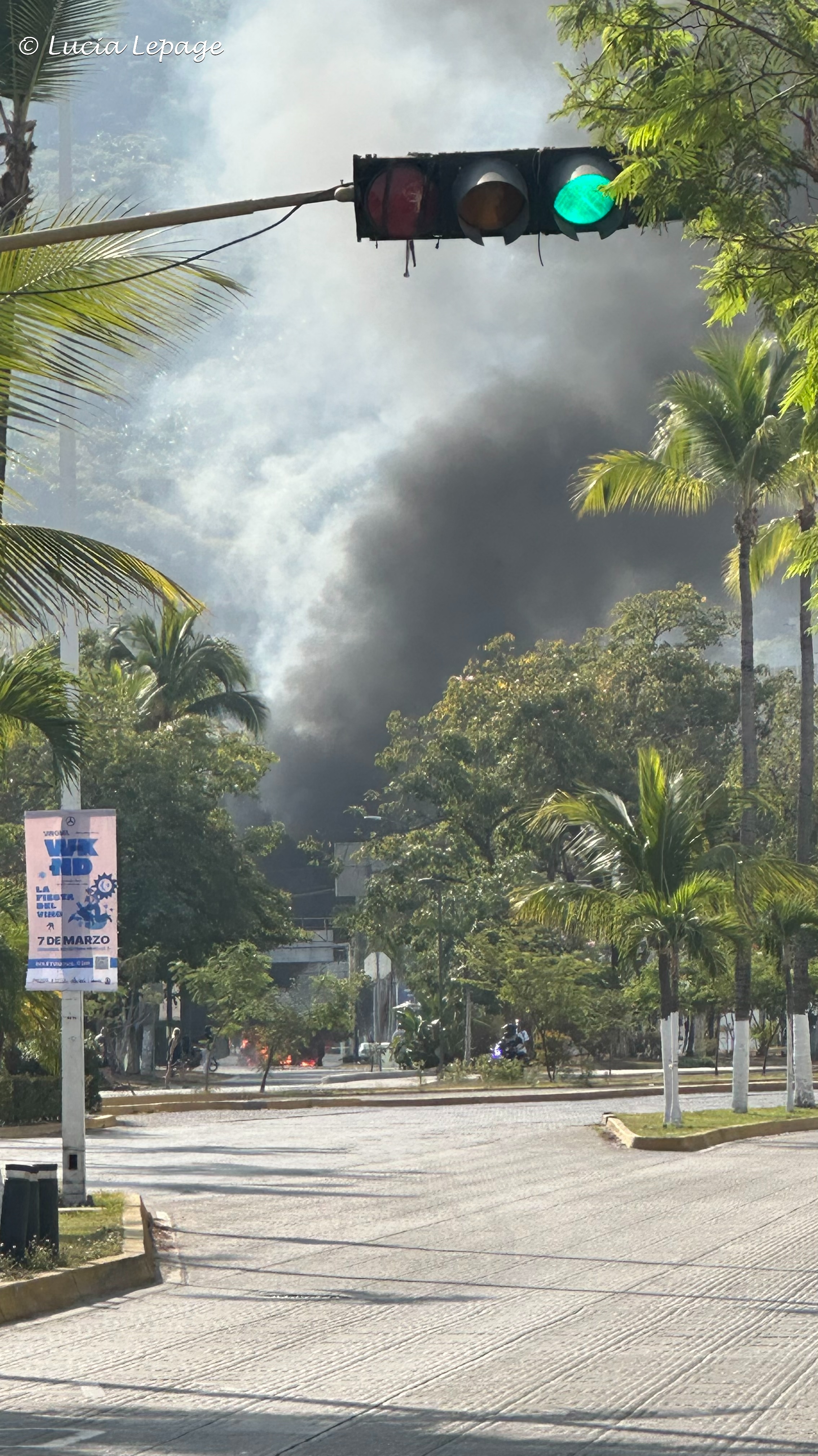 En nous dirigeant vers l’arrêt d’autobus, nous avons vu des panaches de fumée que nous avons trouvés bizarres. De plus, une femme anglophone nous a dit que la police leur avait dit de retourner à leur hôtel. Une fois rendues sur la route 200, nous avons constaté que les rues étaient trop vides. Nous avons aussi vu une voiture en feu, à notre droite dans la rue Berlin. À ce moment-là, nous étions moins à l’aise d’aller plus loin. Cependant, on ne se sentait pas en danger. On a même pris le temps de prendre des photos. Puis, nous sommes retournées tranquillement à l’hôtel, en nous disant que nous nous reprendrons dans les prochains jours et que nous allions profiter de la piscine aujourd’hui. Arrivées à l’hôtel, on a remarqué que des employés barricadaient l’entrée de la partie Villa Vallarta de l’hôtel. On s’est dit qu’il serait important d’aviser nos familles et nos amis que nous étions en sécurité.