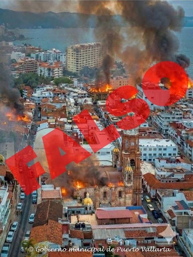 Pendant notre confinement à la chambre, je cherchais à obtenir des nouvelles fiables de la situation. J’ai découvert que les nouvelles en provenance de Reporte Diario Vallarta, de Gobierno municipal de Puerto Vallarta et de Serge Loriaux sur le groupe Facebook Le Petit Québec de Puerto Vallarta étaient les plus fiables. Il y avait tellement d’images truquées par l’IA qui circulaient que c’en était aberrant. Une des images montrait le centre-ville de Puerto Vallarta où plusieurs bâtiments, dont la cathédrale, étaient incendiés. Pourtant de notre hôtel, on ne voyait pas les panaches de fumée qui auraient dû se trouver de ce côté si cela avait été véridique.