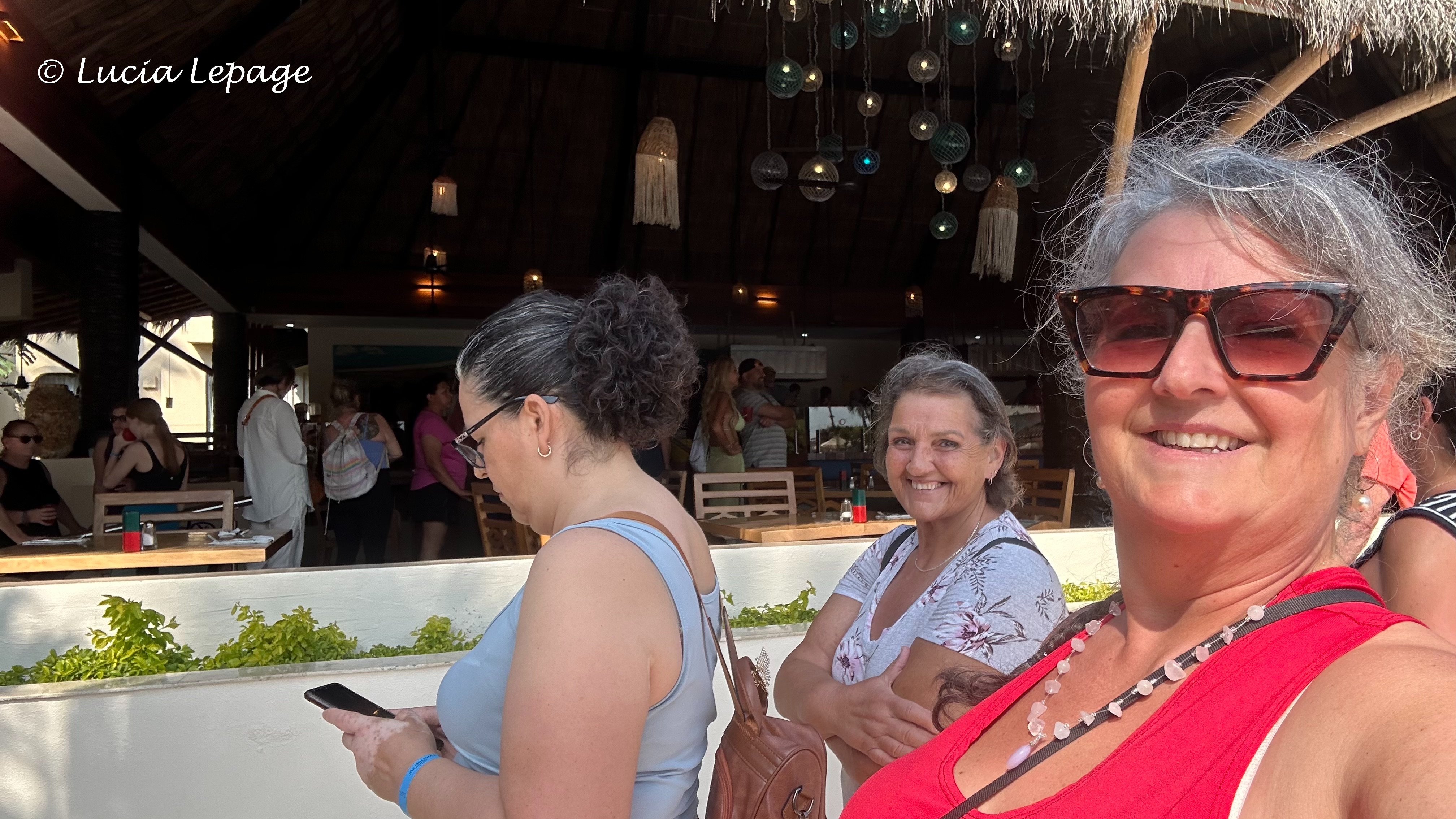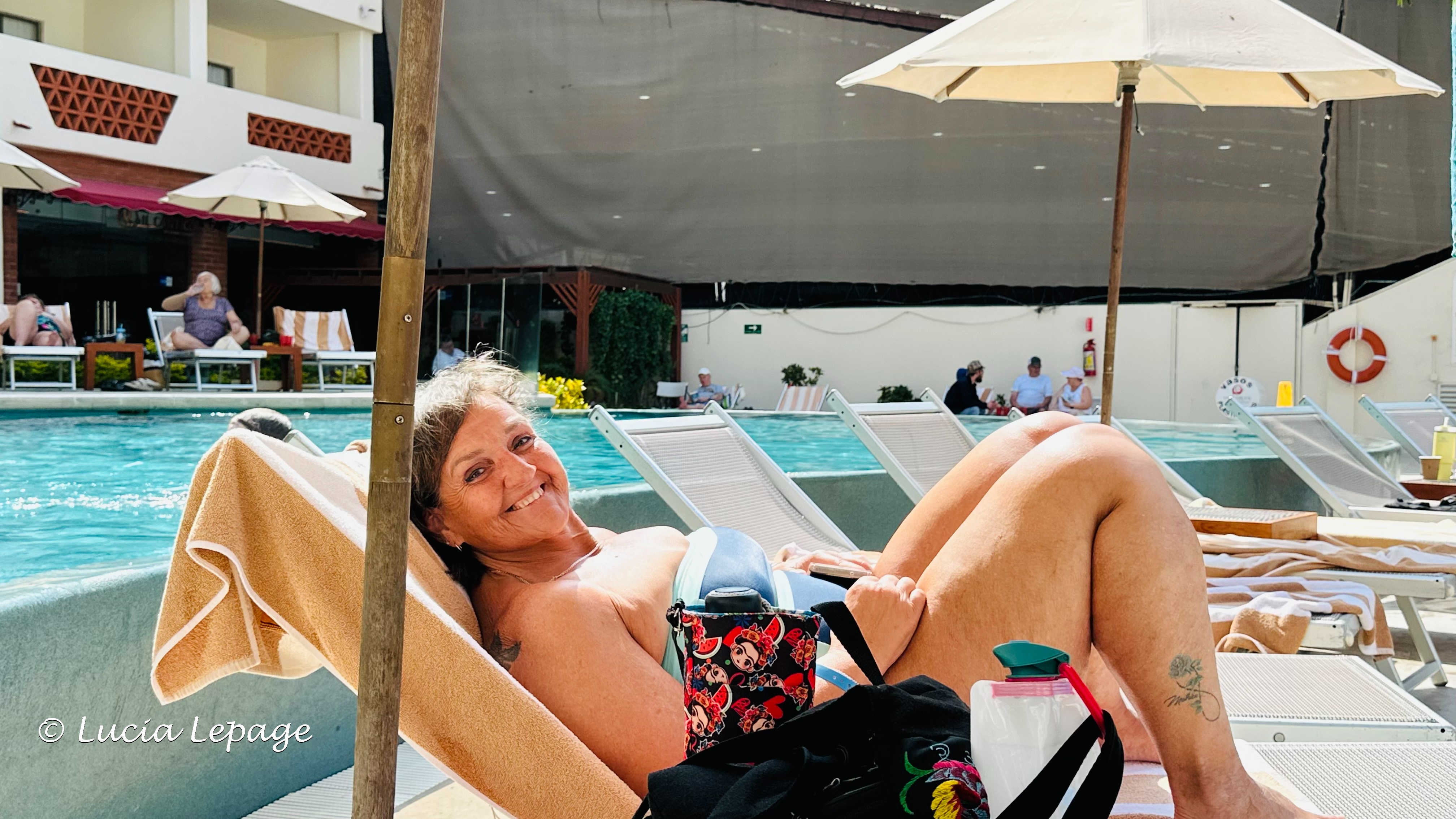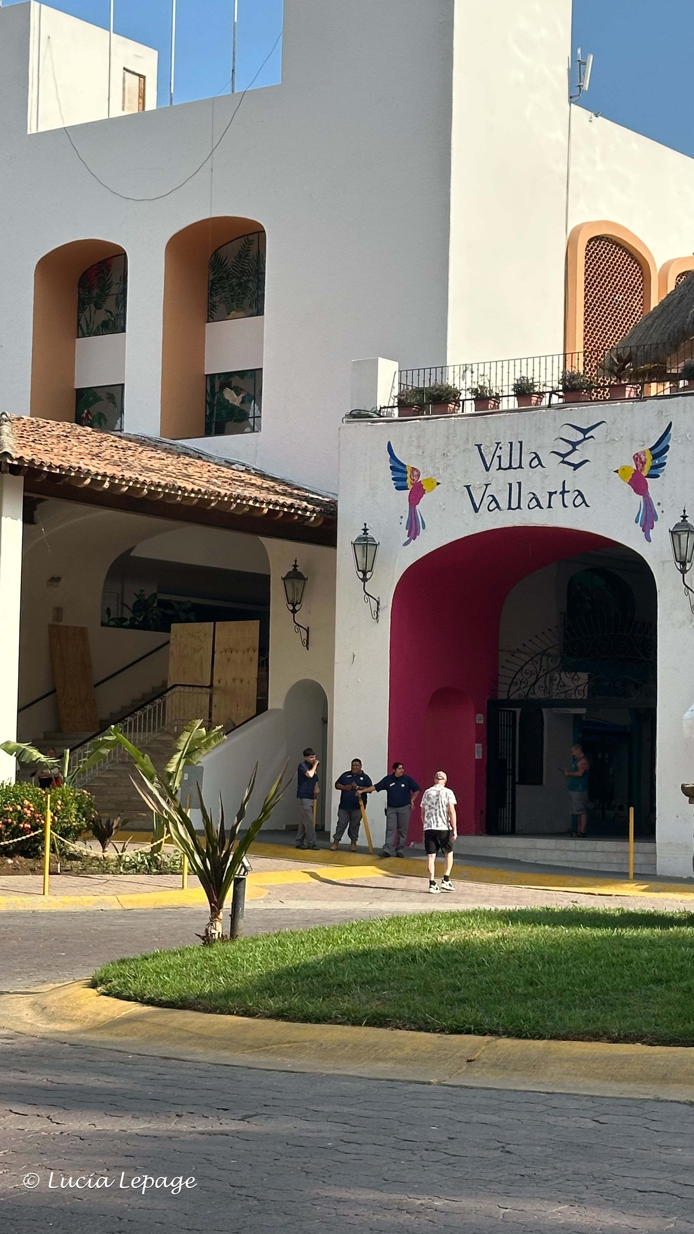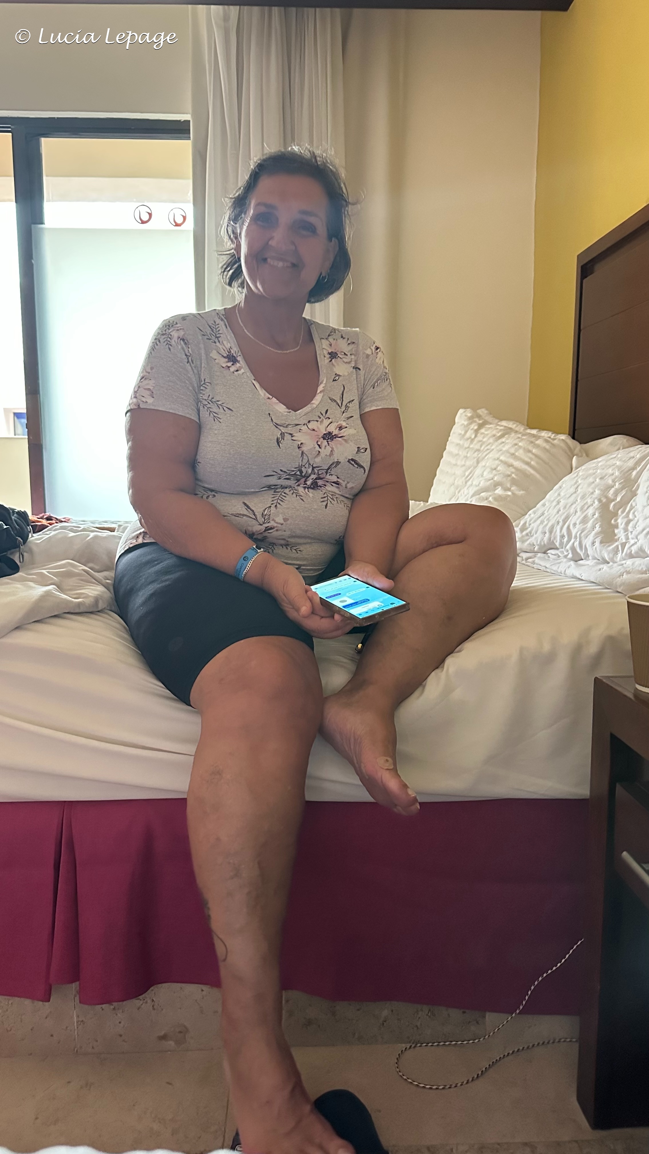 Nous nous sommes préparées pour aller à la piscine et nous avons écrit à notre monde. Voici mon message Messenger et Facebook de 11 h 05 : « Concernant les événements qui se passent à Puerto Vallarta entre la police, l’armée et les narcotrafiquants de drogue, je suis en sécurité à l’hôtel. Toutes les rues principales sont barrées. On ne peut pas sortir, alors ne vous en faites pas. » Notre message était plus rapide que les nouvelles du Québec, car notre monde n’avait pas encore été informé de la situation. J’ai aussi écrit ceci sur le groupe Messenger familial : « J’ai pris ces photos ce matin. Aujourd’hui, je devais aller voir une amie, France L., à Bucerias. On va faire ça une autre journée. On reste à l’hôtel, aujourd’hui. On est barricadé. » Mais en vrai, nous étions confinées, mais pas barricadées. Seule une entrée était barricadée.